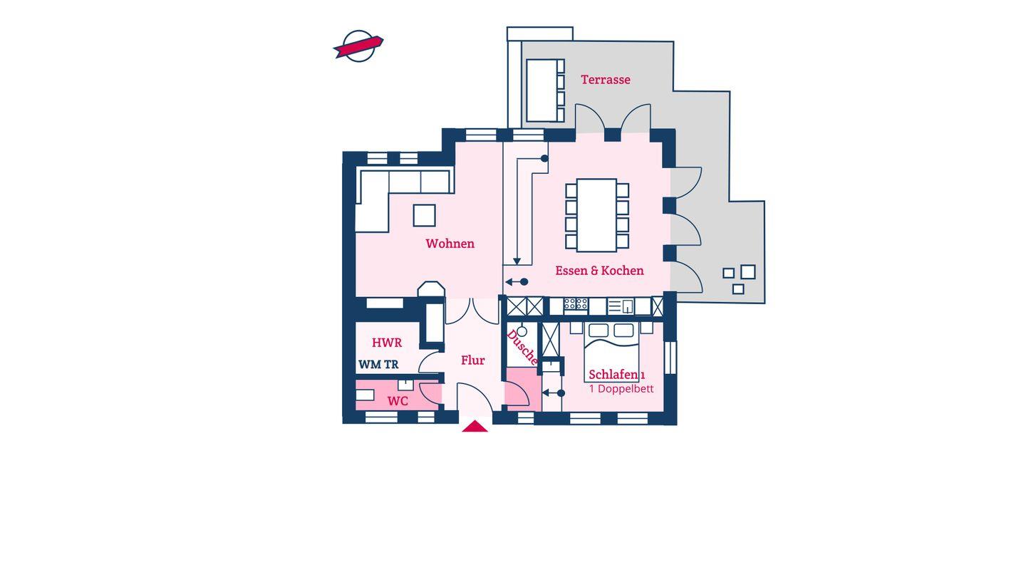 Ausgerichtet zur Marschlandschaft, finden auf zwei Stockwerken bis zu sieben Personen (zuzüglich einer Kleinkinderaufbettung) Platz. Der loftartige Wohn- und Küchenbereich im Erdgeschoss mit hochwertigen Küchengeräten und einem Kaminofen lädt zum Kochen, Spielen und Verweilen ein.