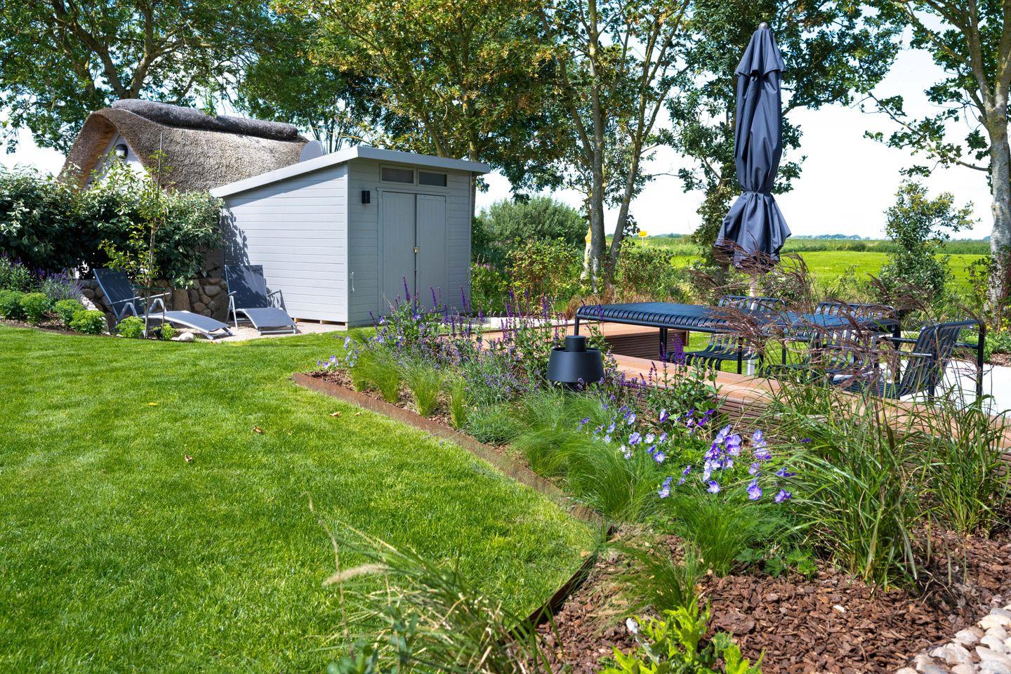 Liebevolle Details, eine Netzliegewiese und verschiedene Rückzugsorte im Haus und Garten machen es leicht, vom Alltag zur Erholung zu finden. Die Farben sind sanft, hell und klar. Bei der Umsetzung wurde auf eine klare Linienführung geachtet.