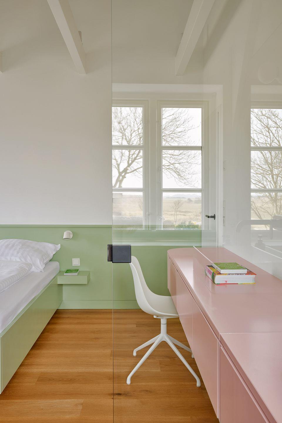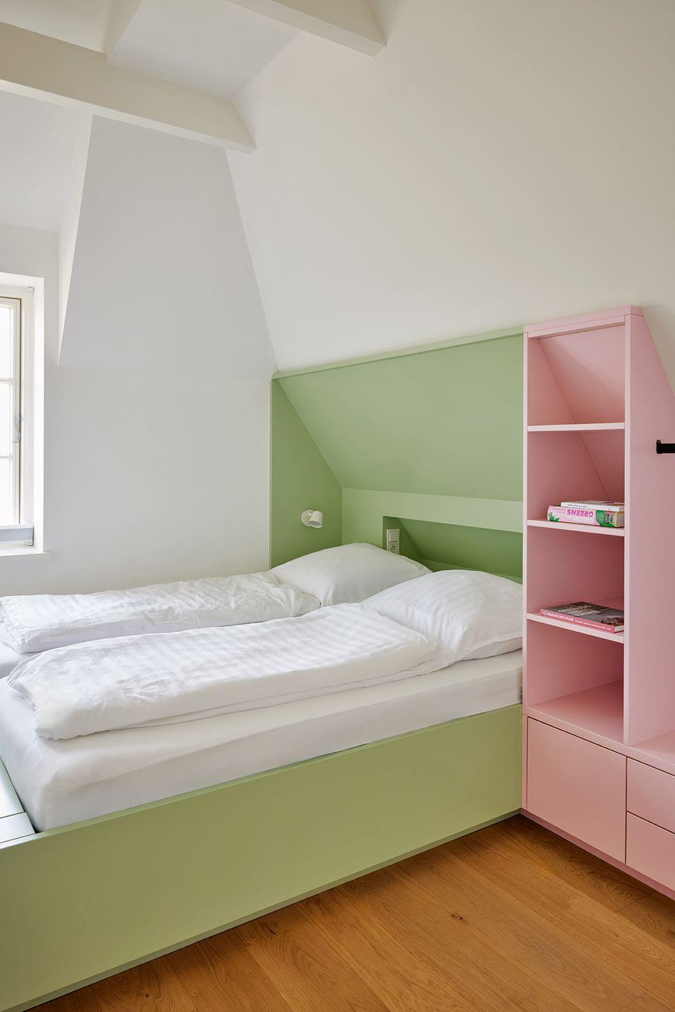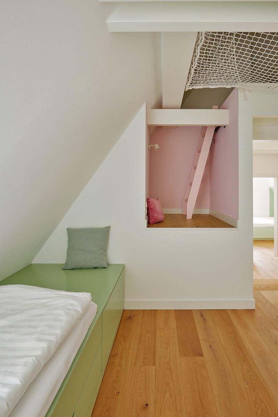 Schlafzimmer als Kreativraum: Ein weiteres Schlafzimmer verbindet mehrere Funktionen. Es kann abhängig vom Gast neben oder statt der Schlafmöglichkeit als Arbeits-, Spiel-, Kreativ- oder Yogaraum genutzt werden. Der Lesealkoven, das Liegenetz sowie die Sitzbank im Spitzboden bieten sich als weitere Rückzugsorte an.
