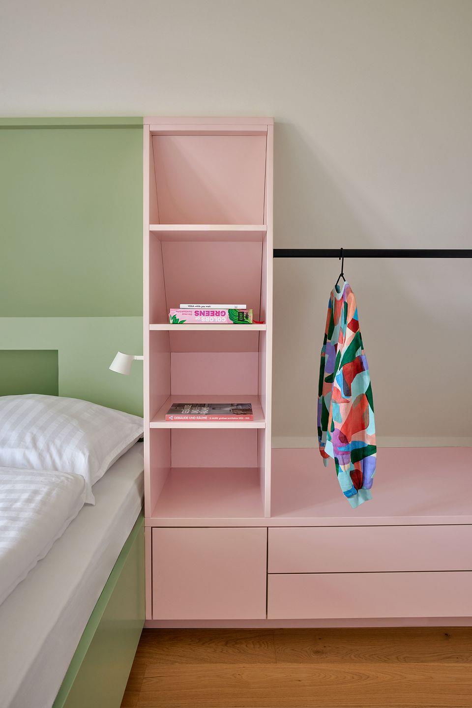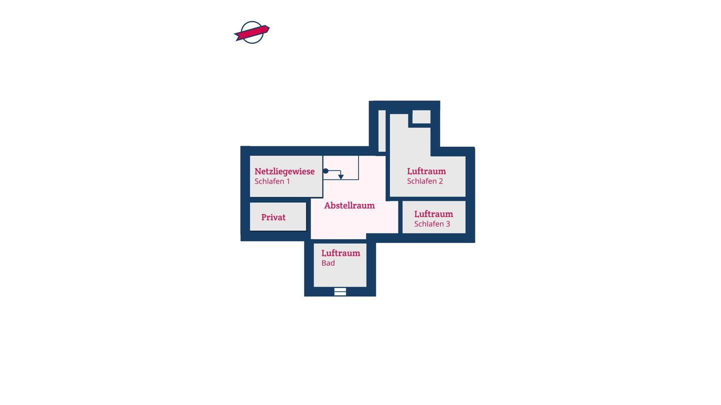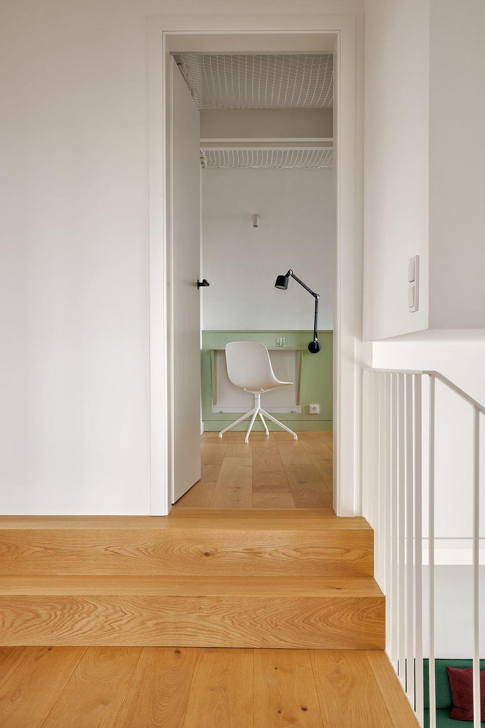 Schlafzimmer als Kreativraum: Ein weiteres Schlafzimmer verbindet mehrere Funktionen. Es kann abhängig vom Gast neben oder statt der Schlafmöglichkeit als Arbeits-, Spiel-, Kreativ- oder Yogaraum genutzt werden. Der Lesealkoven, das Liegenetz sowie die Sitzbank im Spitzboden bieten sich als weitere Rückzugsorte an.