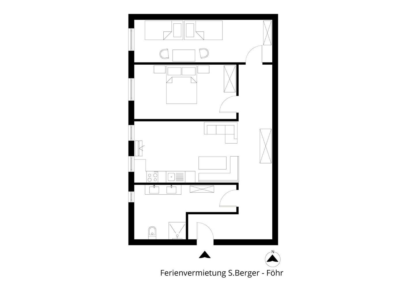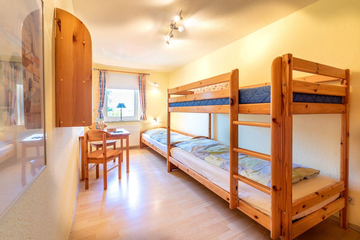 Über den Hofplatz erreichen Sie den Hausflur, der zu den Ferienwohnungen 1-3 im Obergeschoss führt. Diese Ferienwohnung umfasst einen Flur, ein Duschbad mit WC und zwei Waschbecken, eine offene Wohnküche sowie zwei Schlafzimmer.