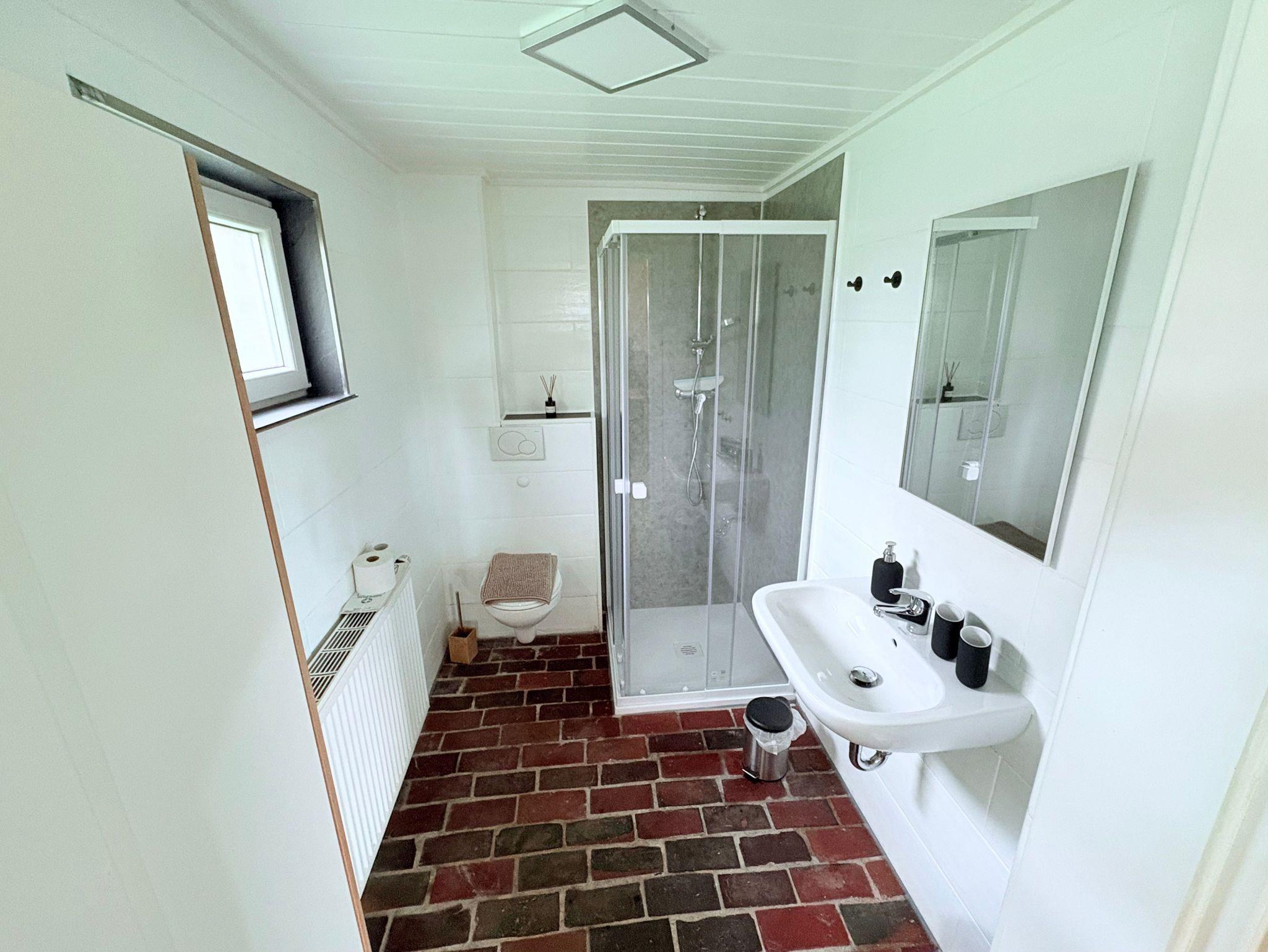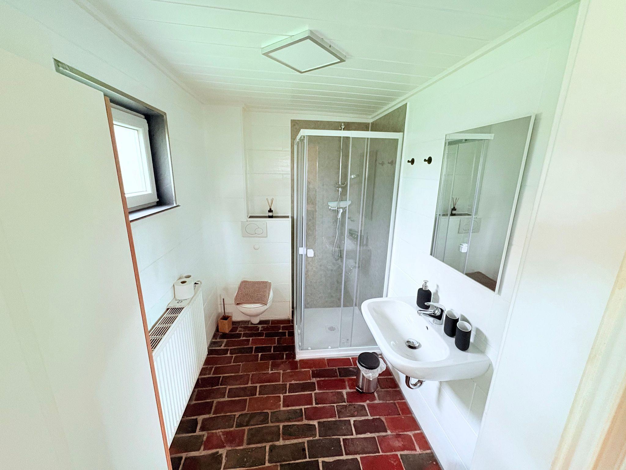 • Badezimmer im Erdgeschoss mit Dusche, WC und Klinkerfußboden