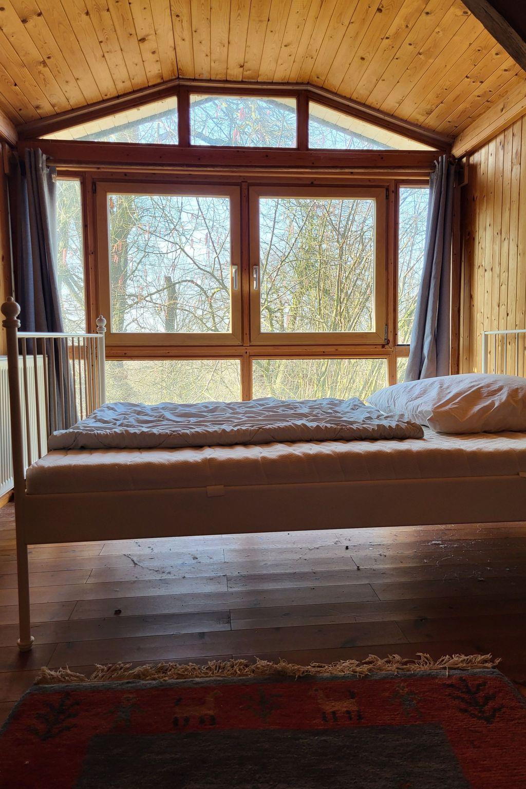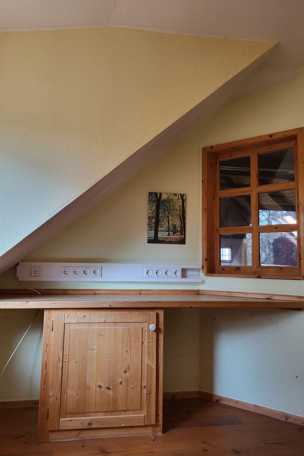 Eine schöne helle Wohnung in der ersten Etage des Haupthauses mit Blick rundum ins Grüne. Eine Innentreppe führt in den großen Atelierraum. Die etwa 60 m2 große Atelierwohnung hat für 6 Personen Betten in 4 kleinen separaten Schlafräumen (2x Doppelbett, 2x Alkoven), eine voll eingerichtete kleine Küchenzeile (ohne Spülmaschine) und einen großen Wohnraum mit Essecke und Ruheecke inklusive Kamin. Sie verfügt über ein geräumiges Badezimmer mit Dusche sowie einen schnellen Glasfaser-WLAN-Zugang. Für Familien stellen wir auf Wunsch ein Kinderbett und einen Kinderstuhl bereit. Außerdem können unsere kleinen Gäste die Kinderspielgeräte in der Scheune nutzen.