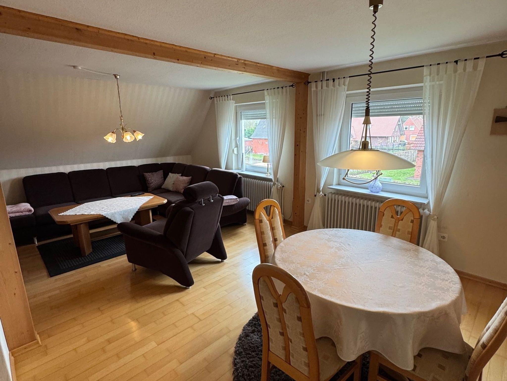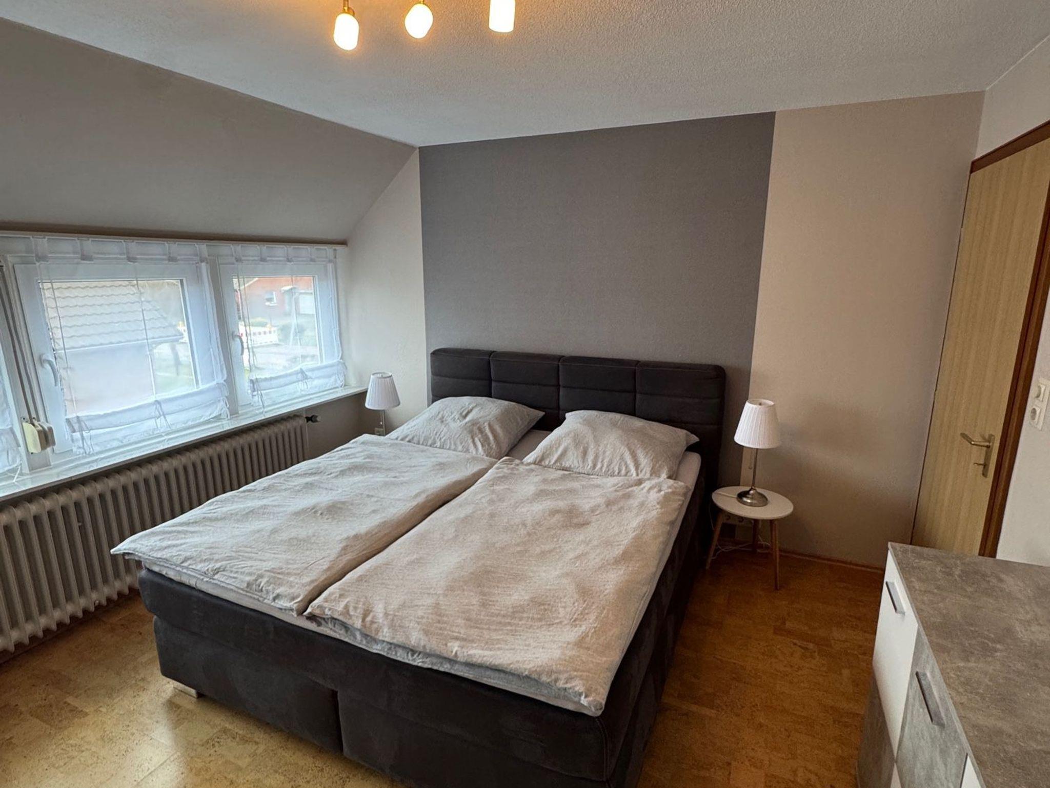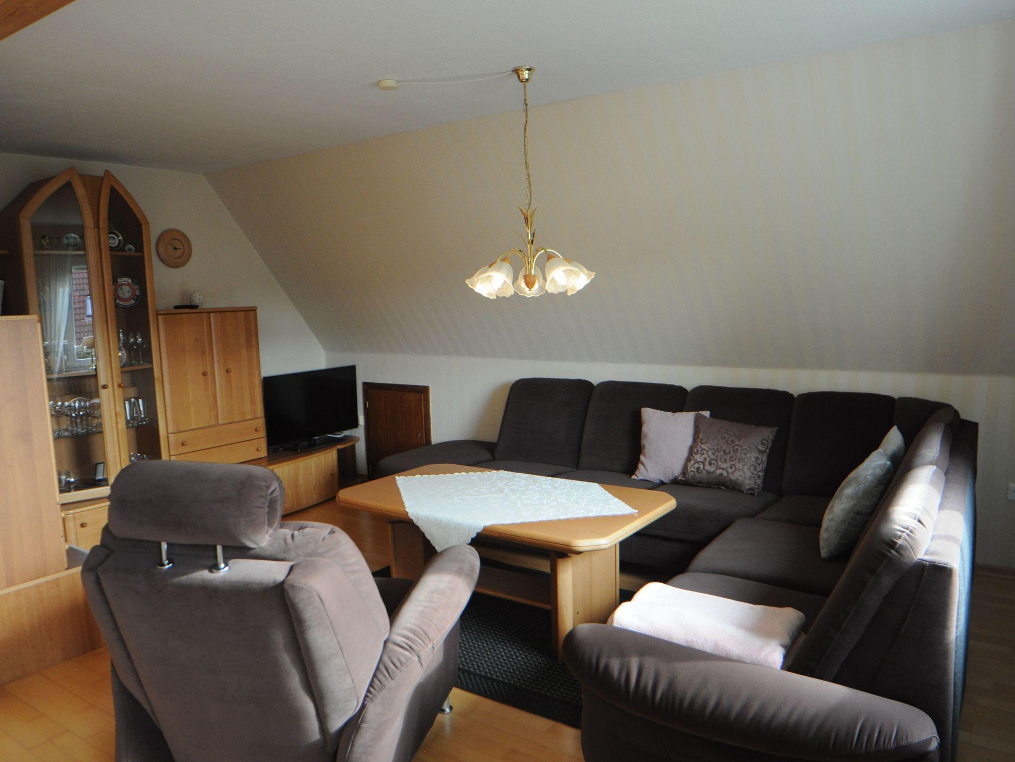 70 qm große Oberwohnung mit separater Küche mit Essbereich, großem Wohnzimmer mit Sitzgarnitur, TV und zusätzlicher Ess-Ecke, Badezimmer mit Badewanne und Trennwand zum Duschen sowie einem Doppelzimmer mit Boxspringbett.
