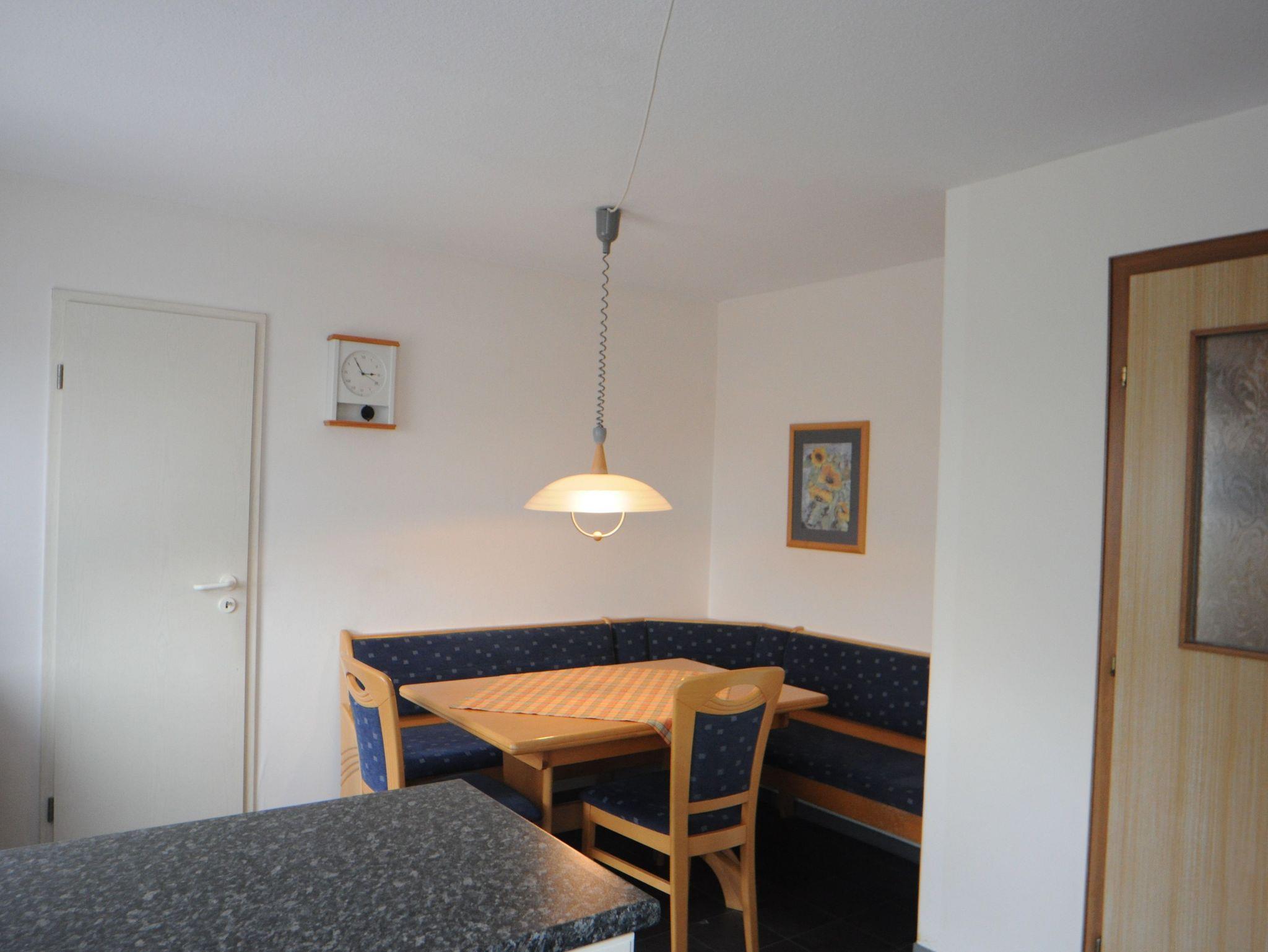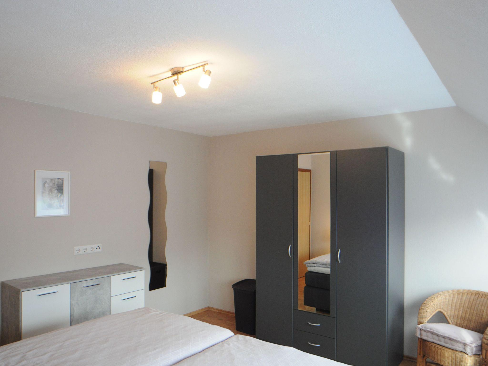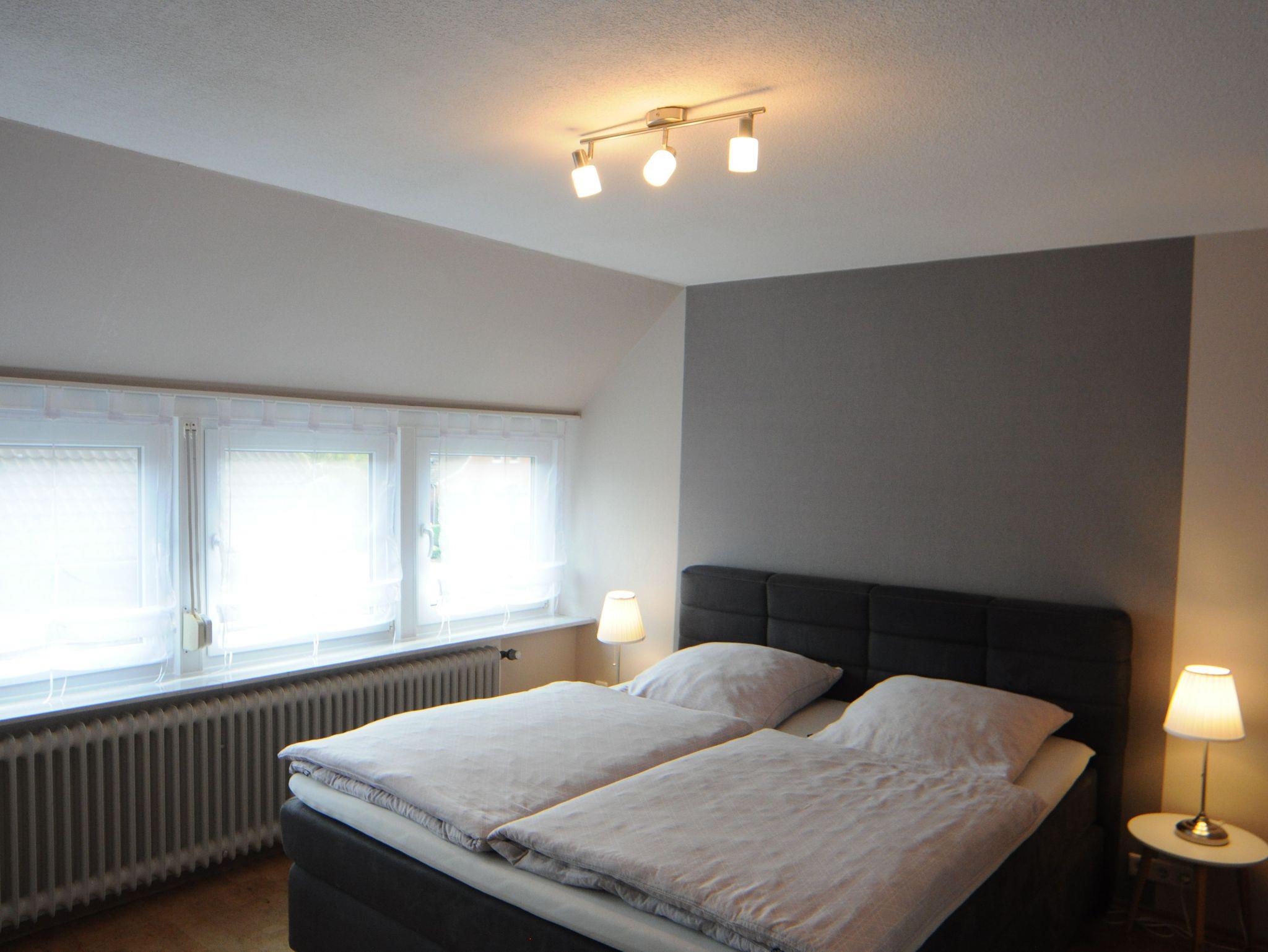 70 qm große Oberwohnung mit separater Küche mit Essbereich, großem Wohnzimmer mit Sitzgarnitur, TV und zusätzlicher Ess-Ecke, Badezimmer mit Badewanne und Trennwand zum Duschen sowie einem Doppelzimmer mit Boxspringbett.