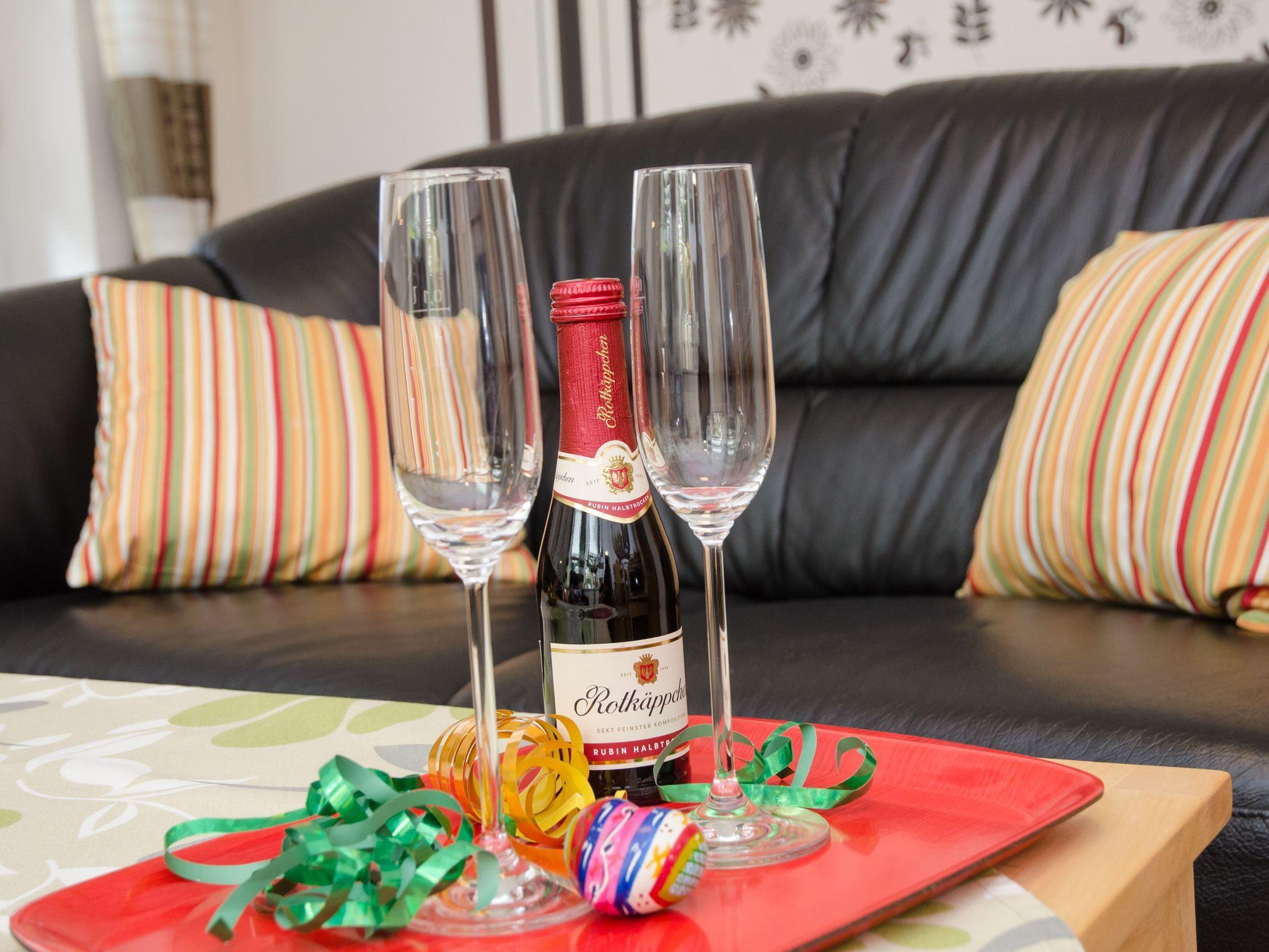 In dem großen, hellen Wohnzimmer steht eine Couchgarnitur mit einem Fernsehsessel mit Tisch und eine Schrankwand mit großem Flachbildschirm. Außerdem können Sie ein einer kleinen Stuhl-und-Tisch-Combi gemütlich ein Buch lesen. In der Küche finden Sie alles was Sie benötigen: Wasserkocher, Kaffeemaschine, kleiner Backofen sowie einen Kühlschrank und eine 2 Herdplatte. Im geräumigen Schlafzimmer steht ein Doppelbett, ein großer Wandschrank sowie zwei Stühle. Badezimmer mit Dusche und WC. Maximal 2 Erwachsene Personen und 1 Kleinkind sind unterzubringen.