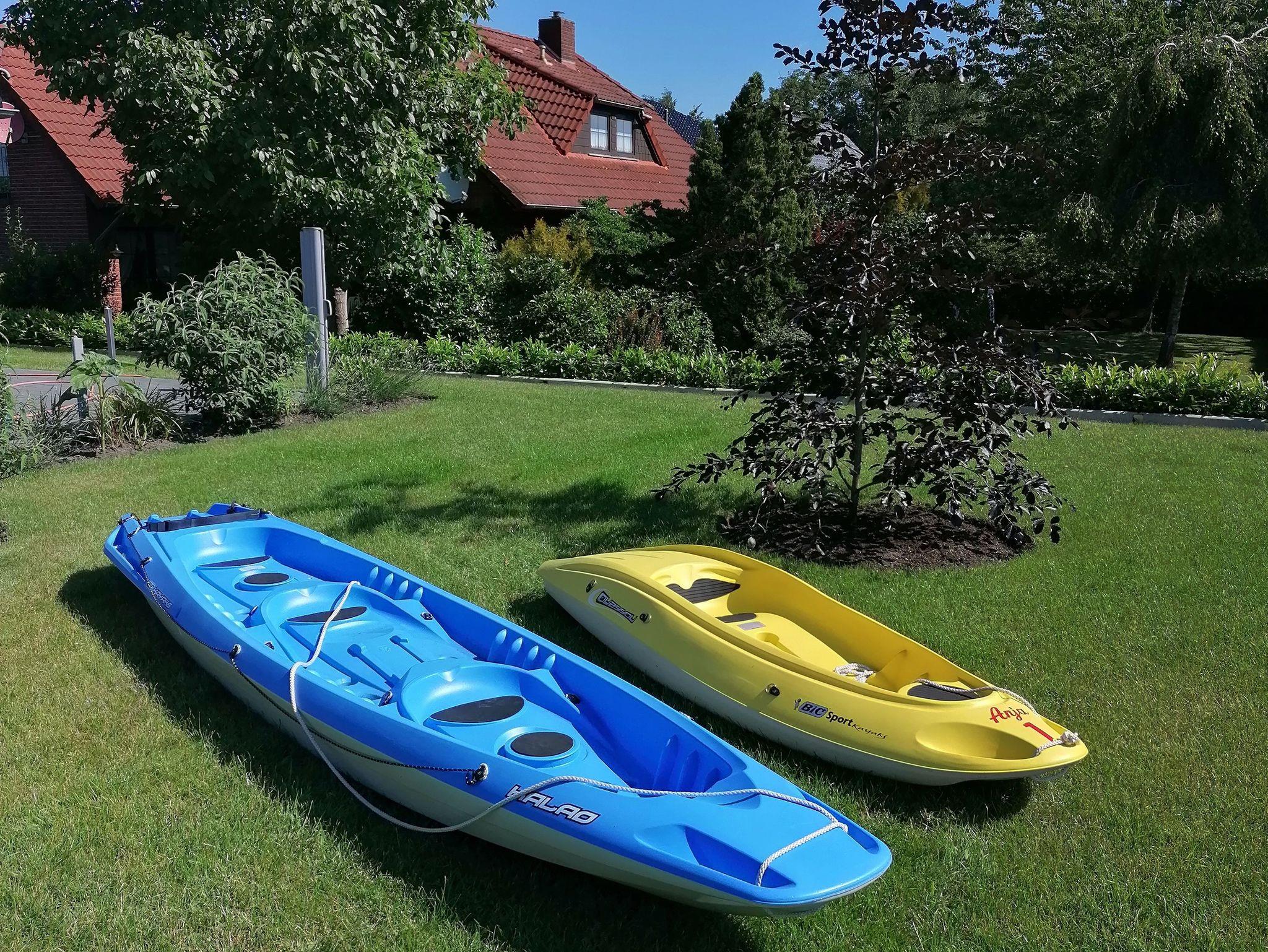 Moderne Ferienwohnung Ankerplatz in Ostfriesland mit Balkon, Kanalblick und kostenfreien Kanus sowie Fahrrädern.