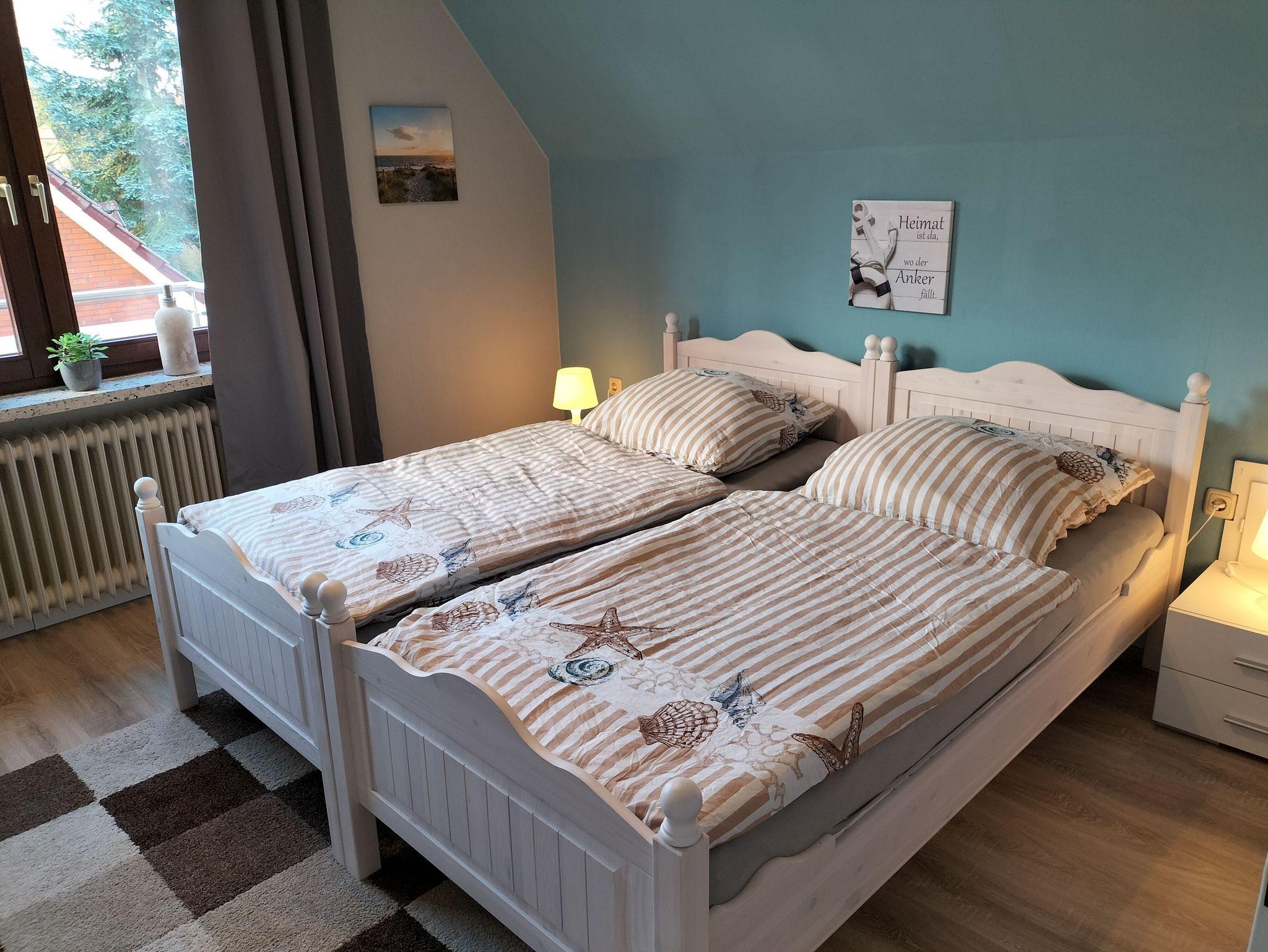 Ferienwohnung mit separater Küche mit Essbereich, Wohnzimmer mit Polstergarnitur und TV, Badezimmer mit Dusche und Badewanne, WC separat sowie drei Schlafzimmern. Ein Doppelzimmer mit zwei Einzelbetten, die aneinander oder getrennt gestellt werden können sowie zwei Einzelzimmer mit jeweils einem Einzelbett.