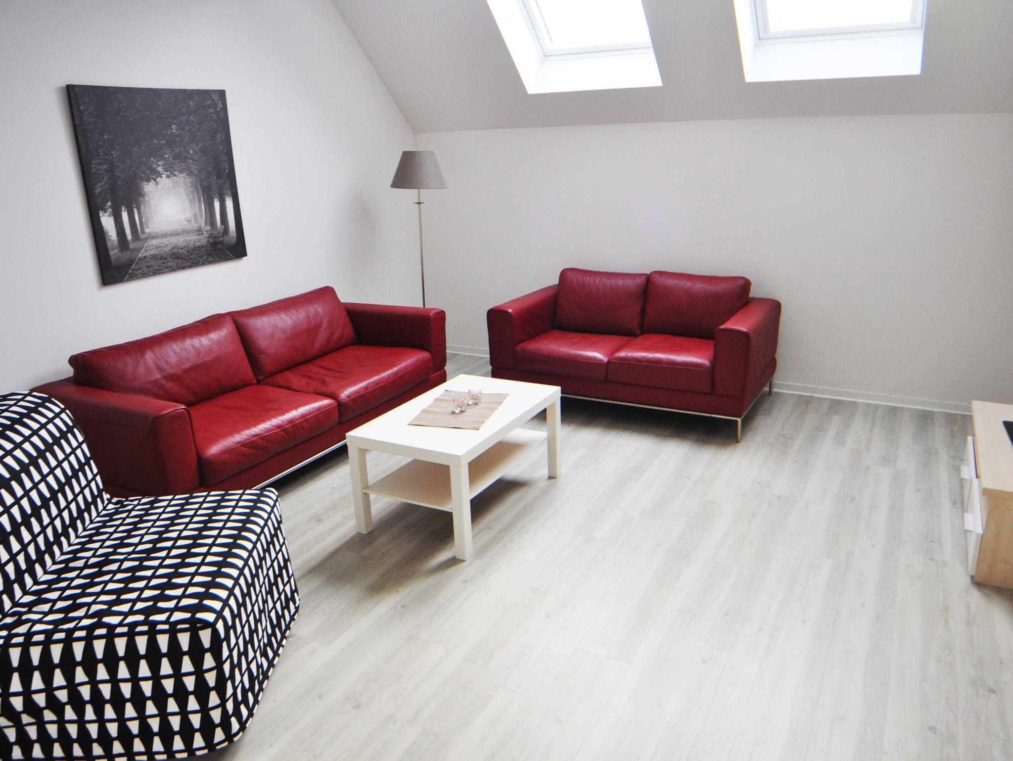 Die Wohnung im Obergeschoss verfügt über ein Schlafzimmer mit Doppelbett, ein Schlafzimmer mit Einzelbett, ein Badezimmer mit Dusche und WC, eine Küche (Küchenzeile mit E-Herd, Geschirrspülmaschine, Kühlschrank mit Gefrierfach, Wasserkocher und Kaffeemaschine) sowie ein Wohnzimmer mit moderner Ledergarnitur, Sessel mit Schlaffunktion und TV. Von der Küche aus ist der Balkon erreichbar. Balkonmöbel sind vorhanden.
