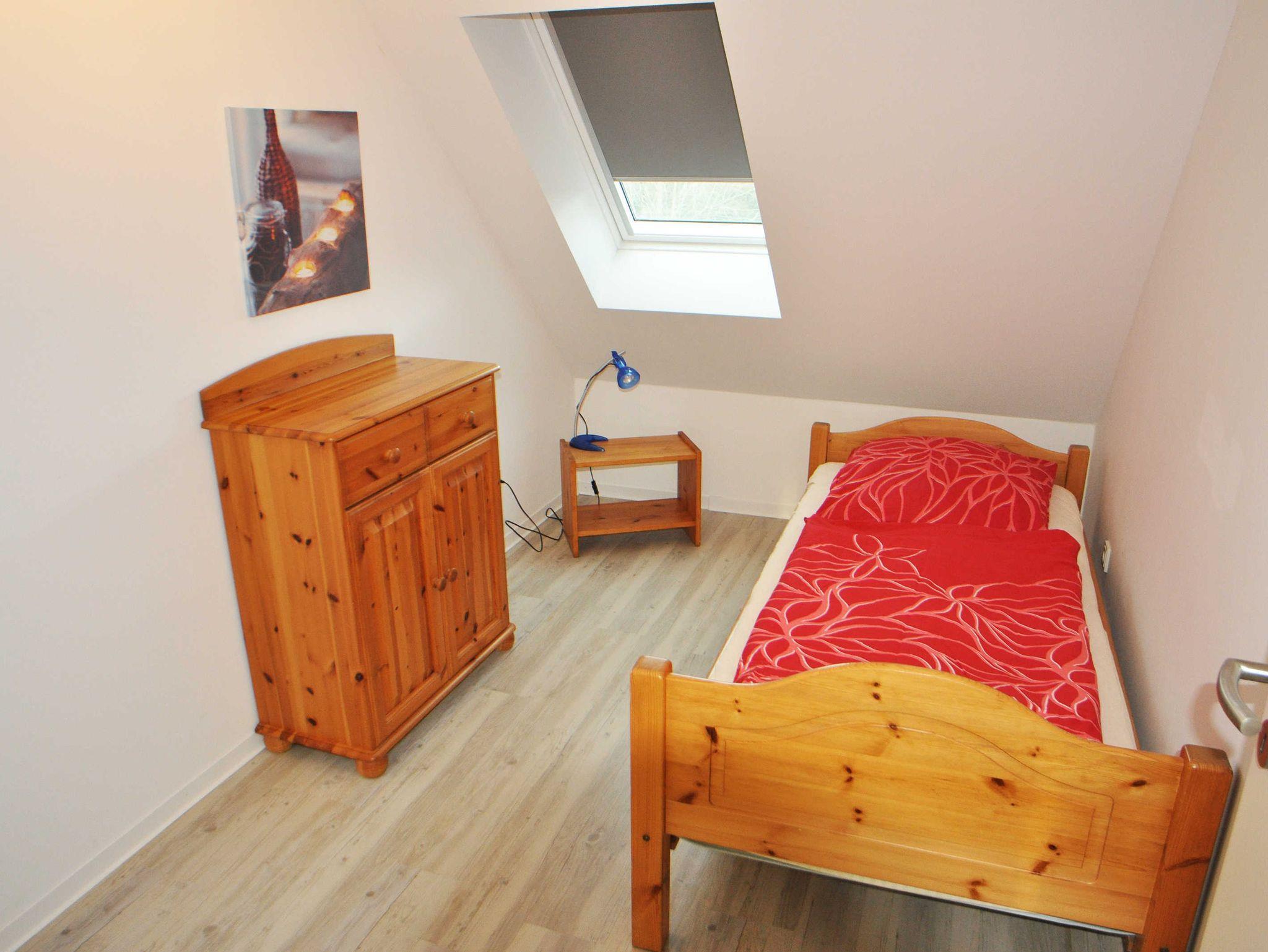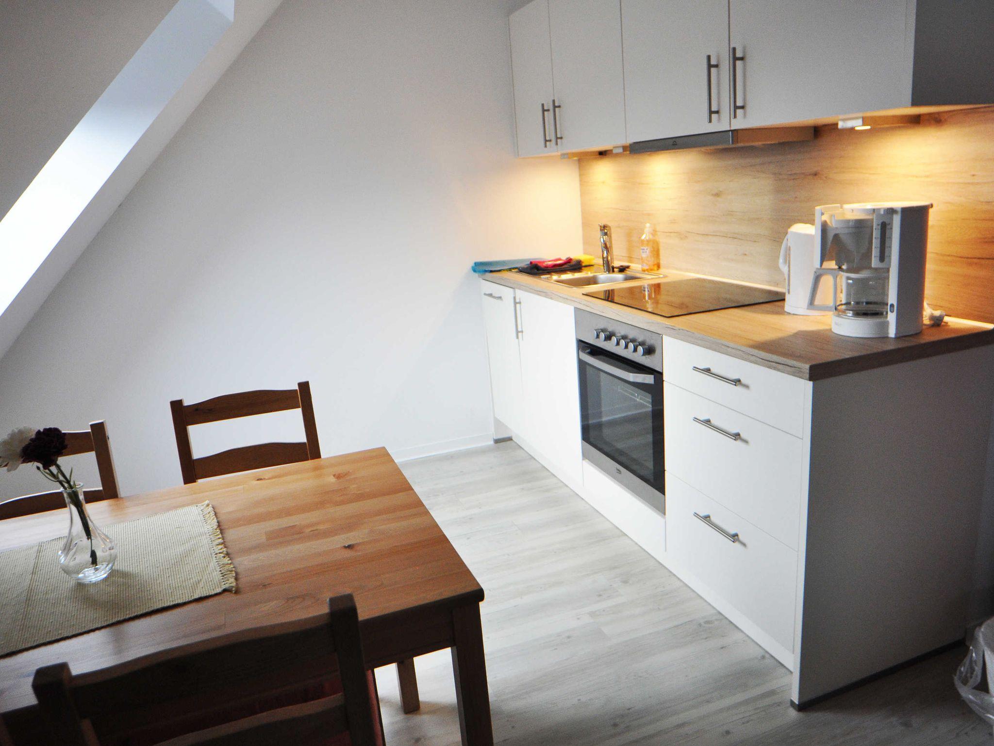 Die Wohnung im Dachgeschoss verfügt über ein Schlafzimmer mit Doppelbett, ein Schlafzimmer mit Einzelbett, ein Bad mit Dusche und WC sowie eine Wohnküche mit Küchenzeile (E-Herd, Geschirrspülmaschine, Kühlschrank mit Gefrierfach, Kaffeemaschine, Wasserkocher), gemütlichem Sofa mit Schlaffunktion und TV.
