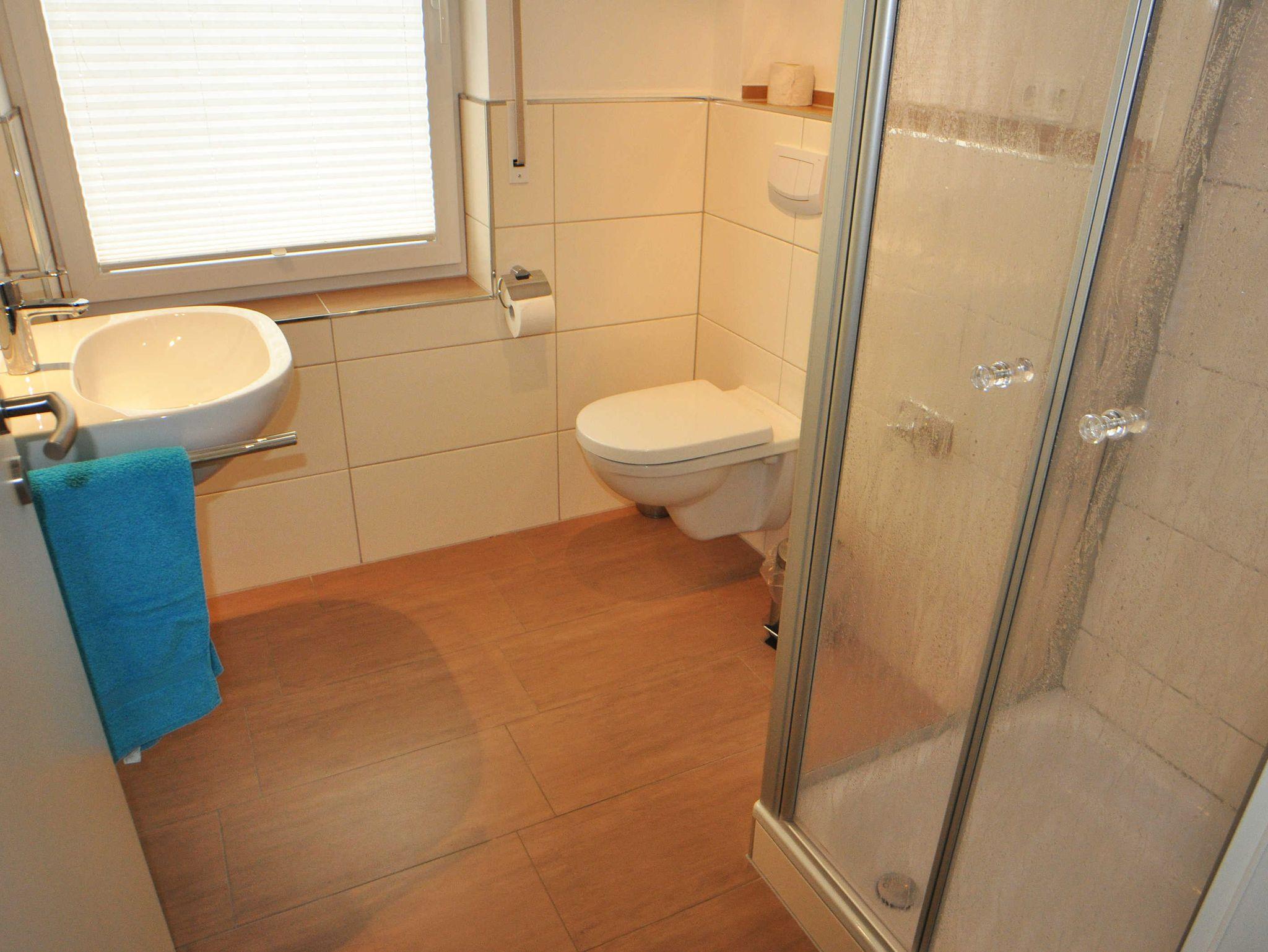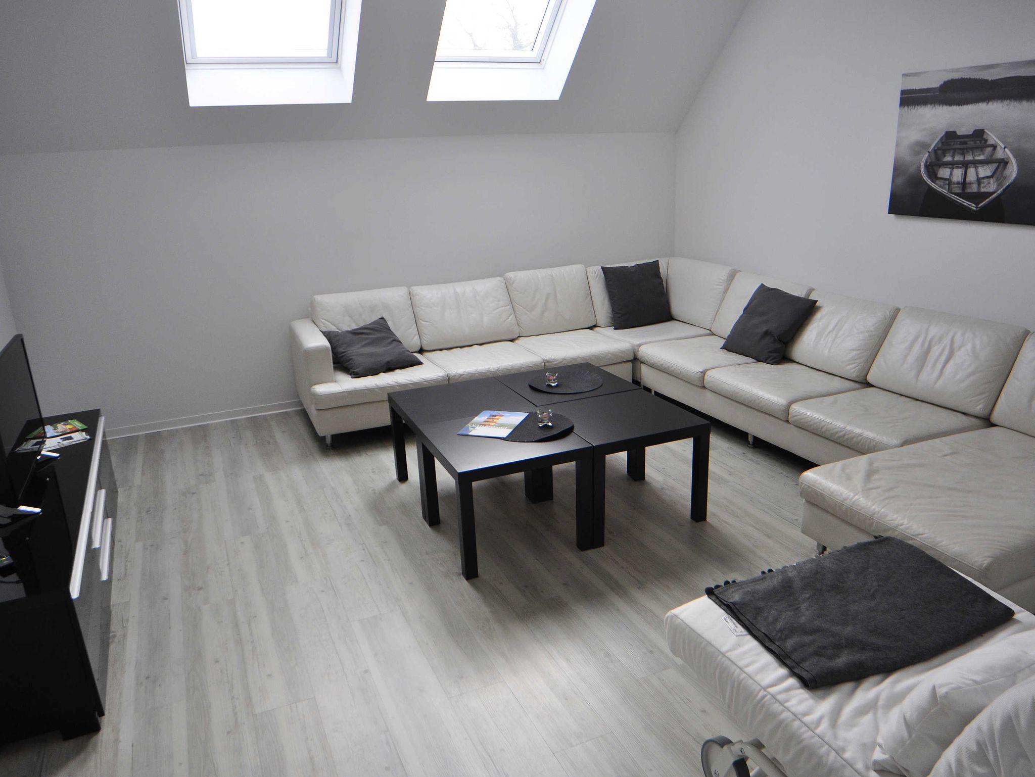 Die Wohnung im Obergeschoss verfügt über ein Schlafzimmer mit Doppelbett, ein Schlafzimmer mit Einzelbett, ein Badezimmer mit Dusche und WC, eine Küche (Küchenzeile mit E-Herd, Geschirrspülmaschine, Kühlschrank mit Gefrierfach, Wasserkocher und Kaffeemaschine) sowie ein Wohnzimmer mit moderner Ledergarnitur, Sessel mit Schlaffunktion und TV. Von der Küche aus ist der Balkon erreichbar. Balkonmöbel sind vorhanden.