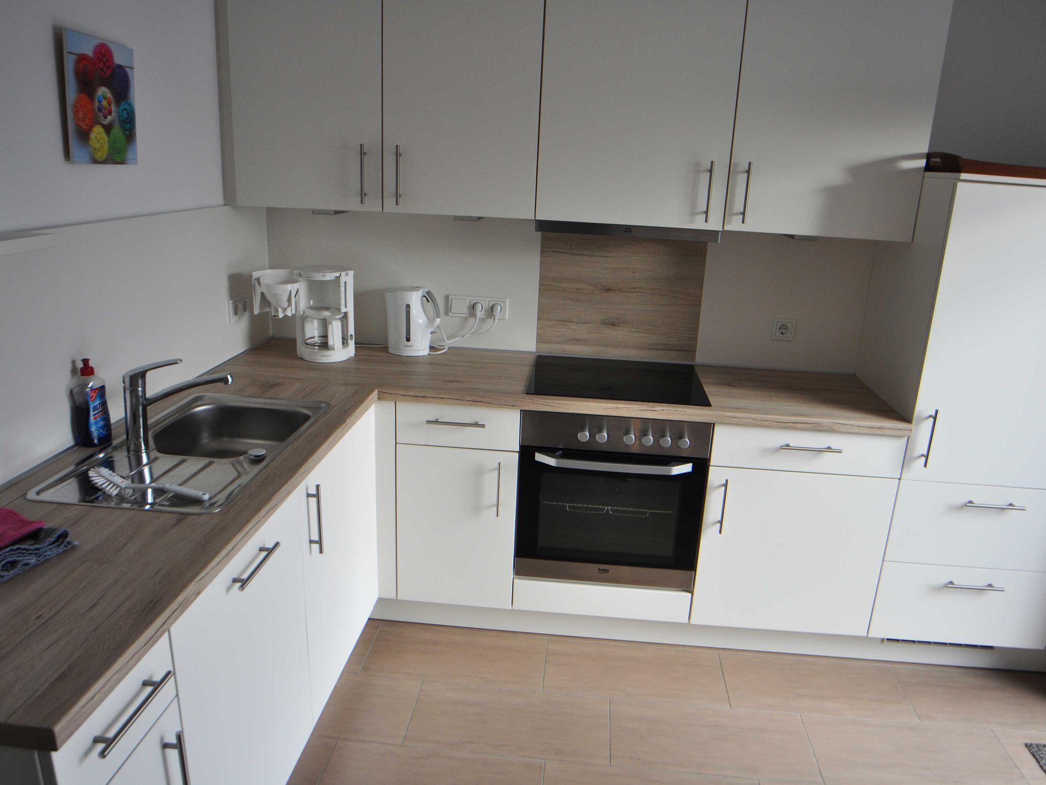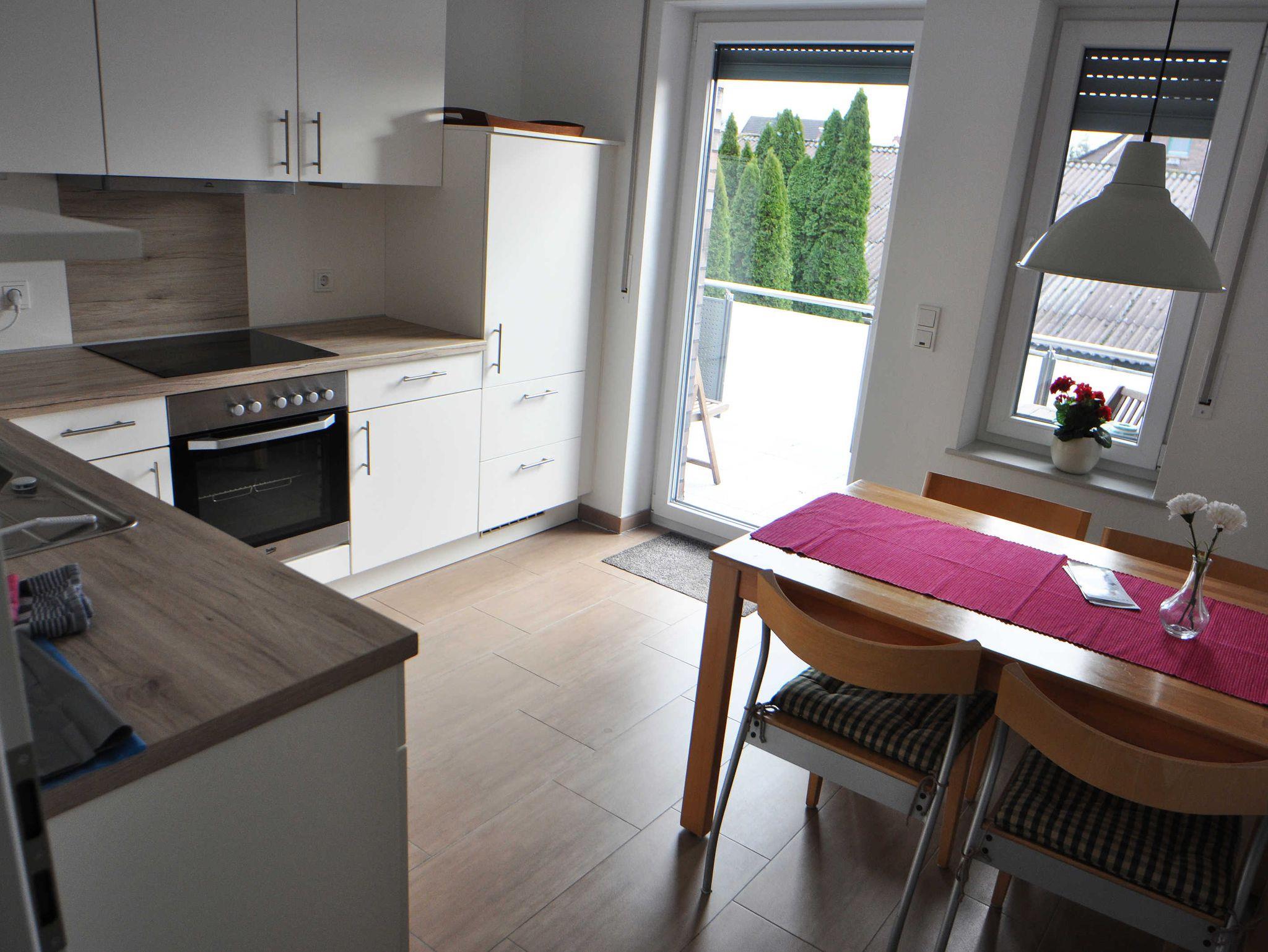 Modern eingerichtete Ferienwohnung mit Balkon und Küche in Moormerland, ideal für Familien und Radfahrer.
