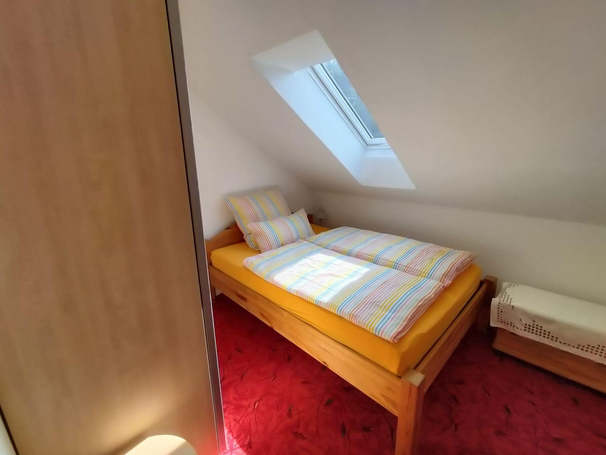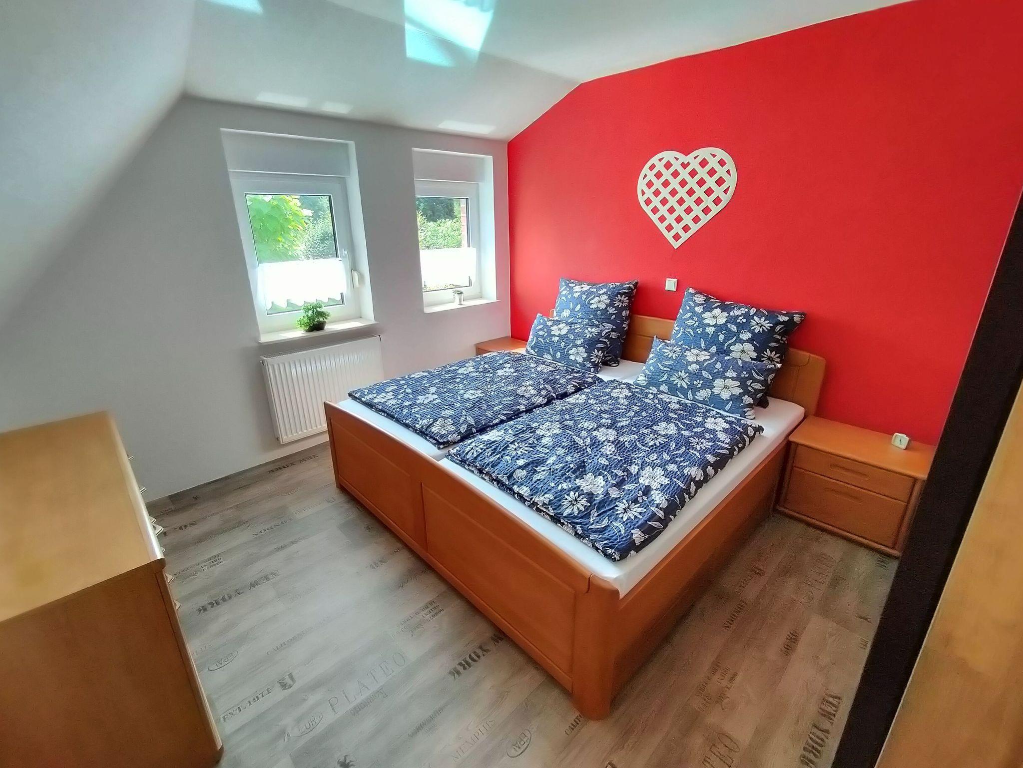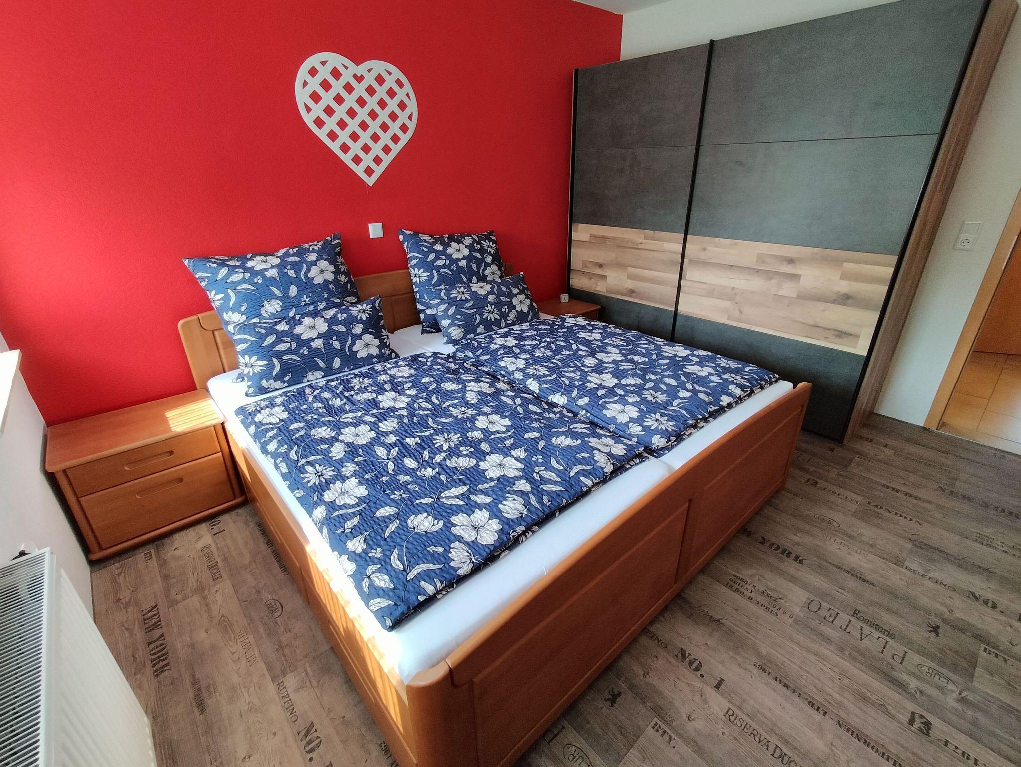 Oberwohnung mit Platz für bis zu vier Personen. In der Wohnung befinden sich ein Schlafzimmer mit einem Doppelbett und ein weiteres Schlafzimmer mit franz. Bett der Größe 140 cm x 200 cm.
