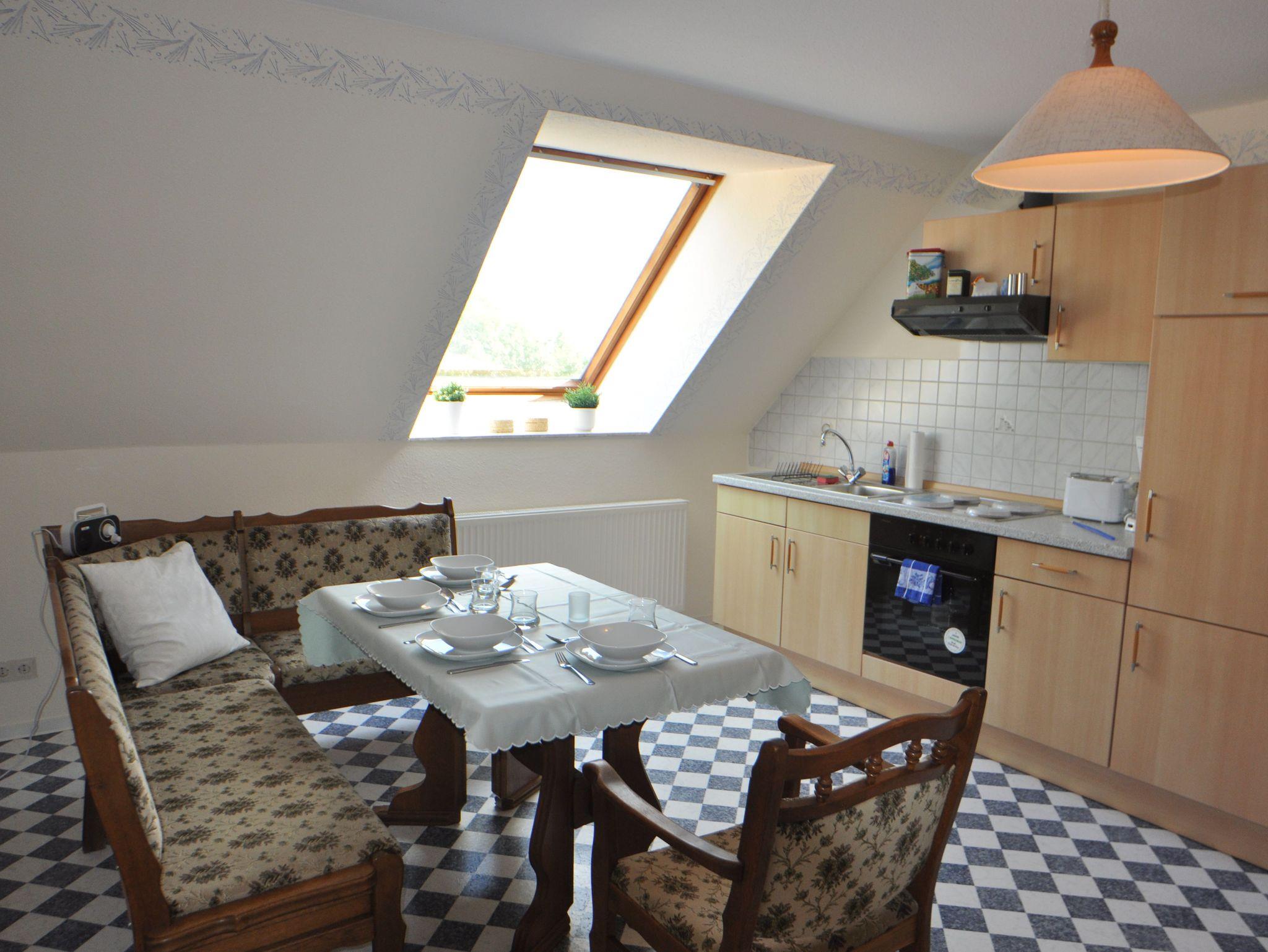 100 Quadratmeter große Oberwohnung mit großzügigen Räumen für 2-4 Personen. Separate voll ausgestattete Küche mit Essbereich, Badezimmer mit Dusche und WC, Wohnzimmer mit Couchgarnitur und TV sowie ein Doppelzimmer mit Doppelbett und ein Einzelbett mit französischem Bett (1,40 m x 2 m).