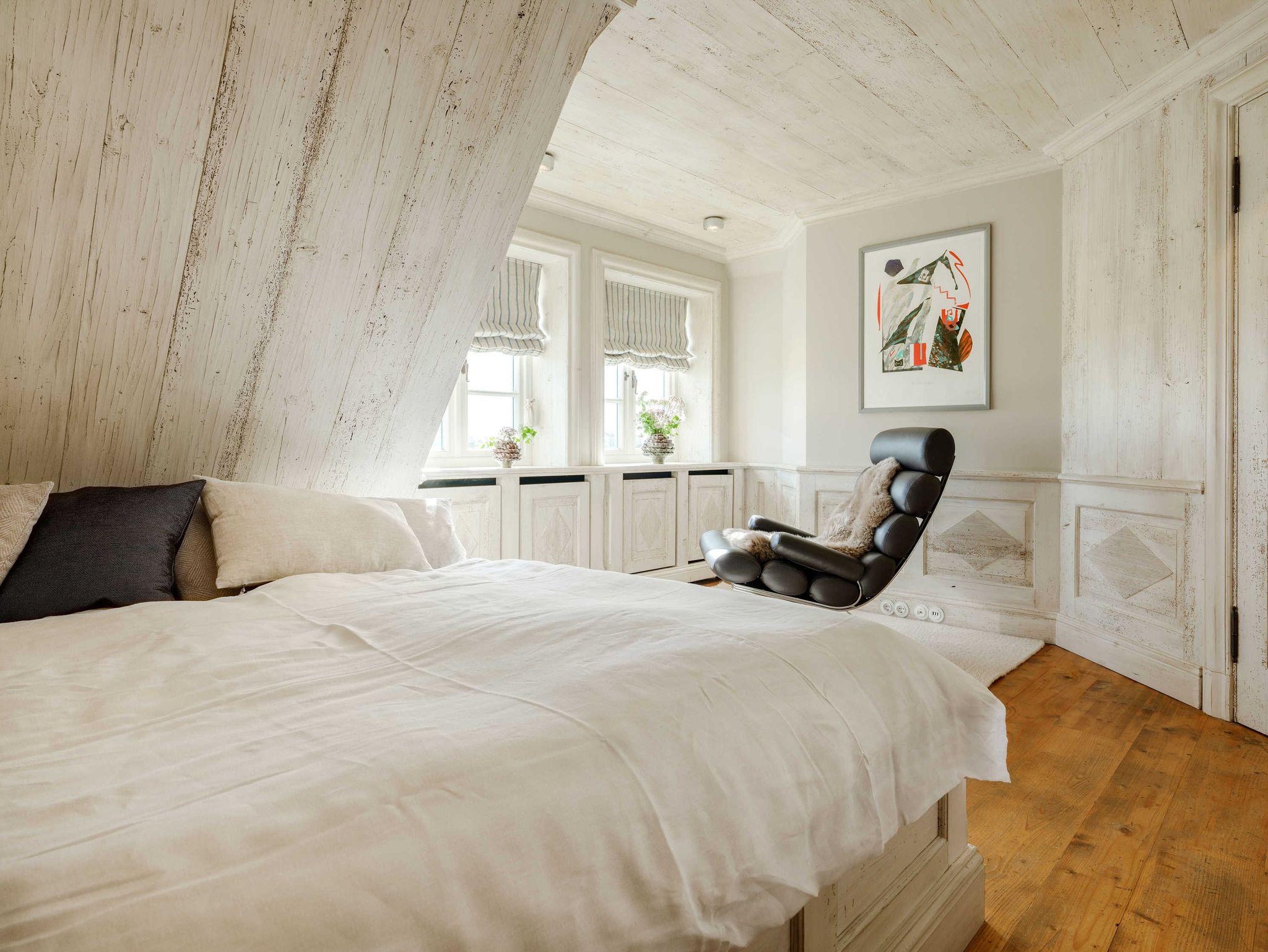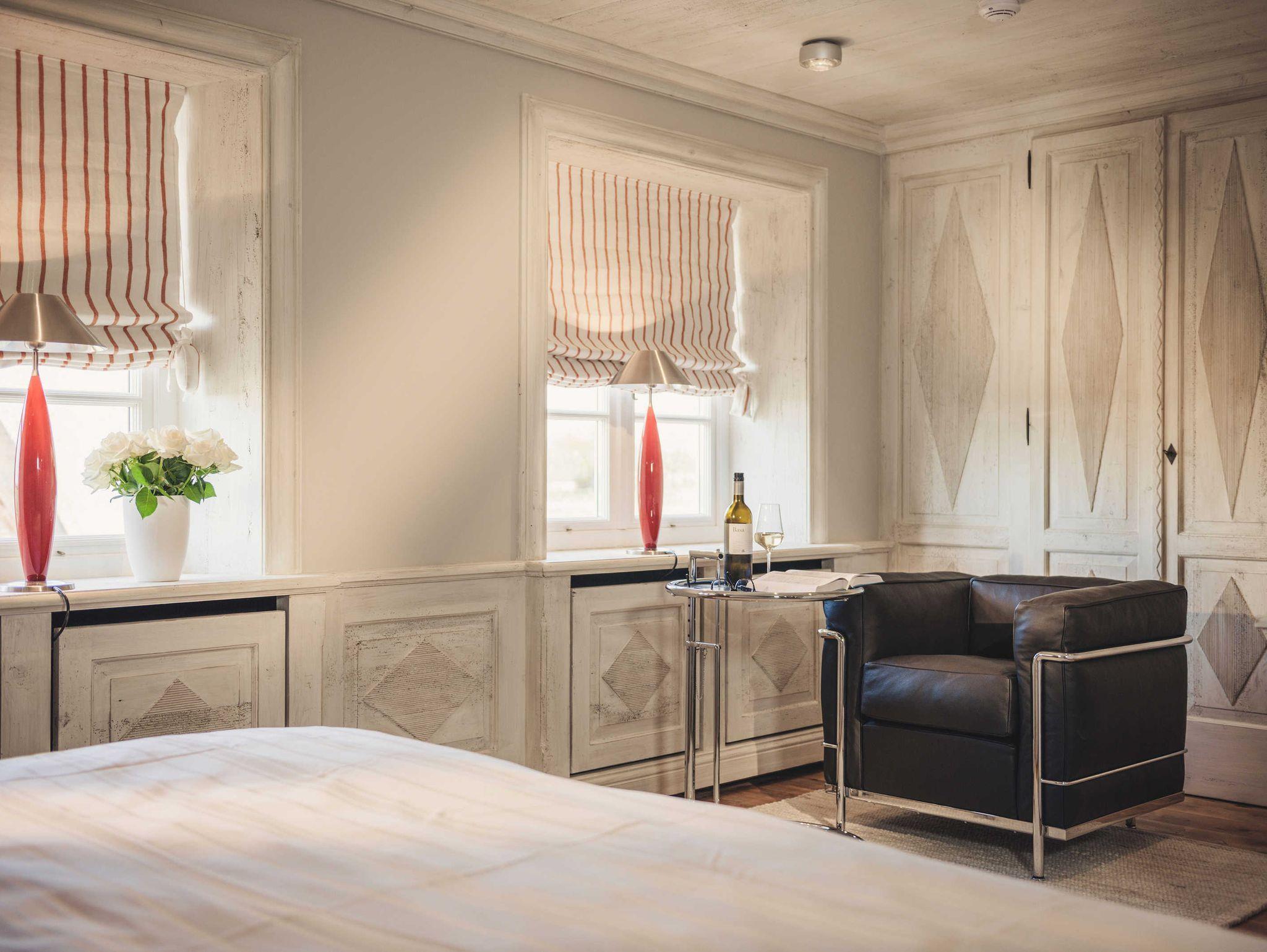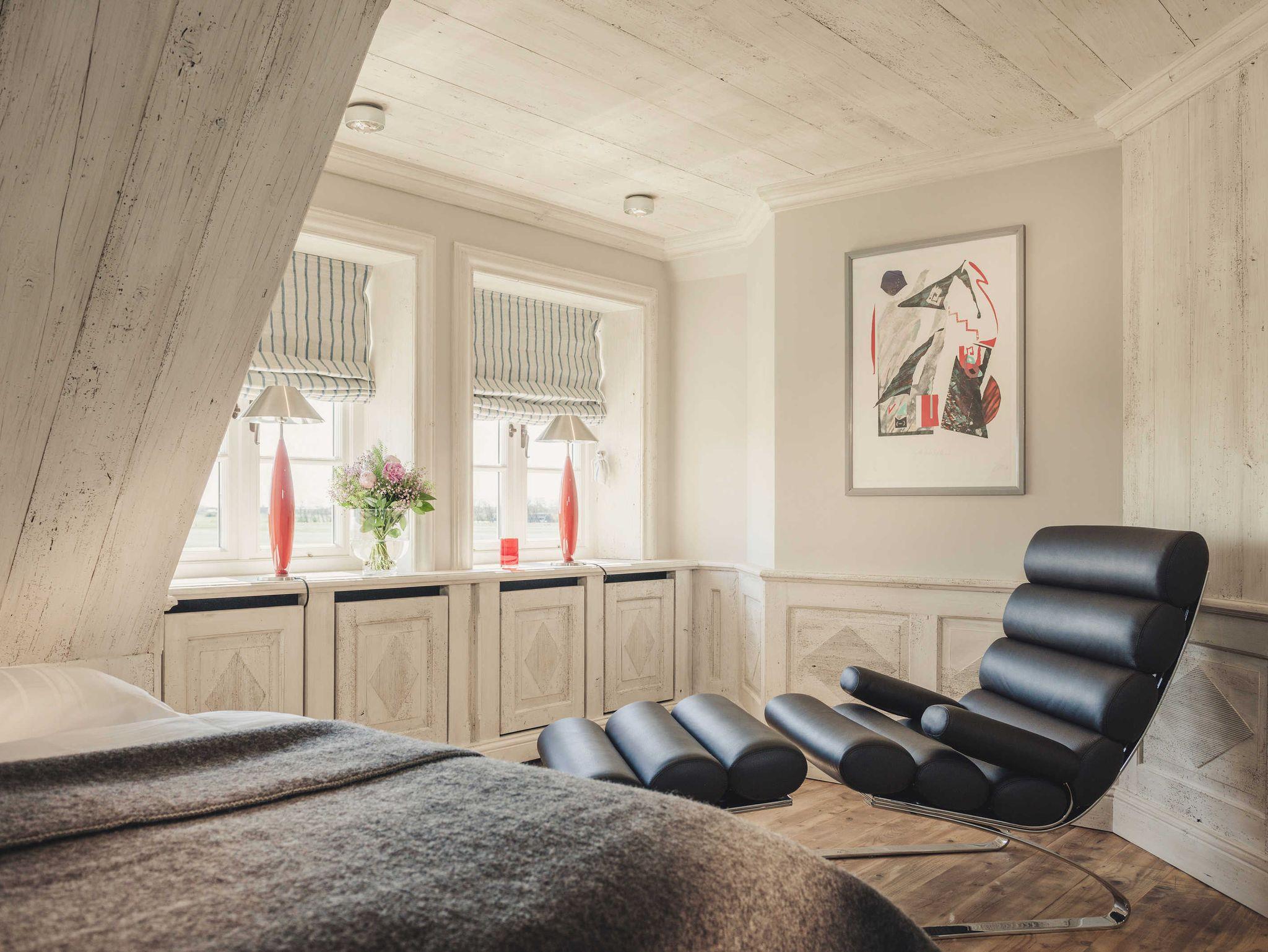 Über 145 m2 Wohnfläche erstreckt sich das Ferienhaus „SalzWasserHerz“ auf zwei Etagen und bietet im Obergeschoss zwei Schlafzimmer (Betten 2x2m) mit SAMINA Schlafsystem in weißem Nordish-Vollholz-Design, SAMINA Kissenbar, sowie zwei Badezimmer mit Ausblick und Regendusche oder Badewanne.