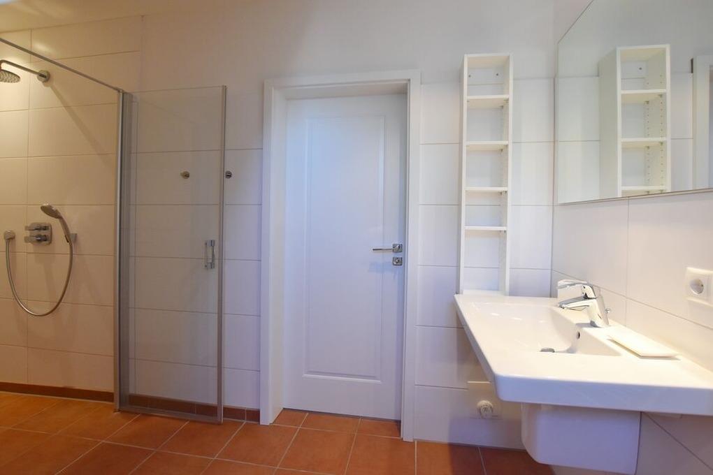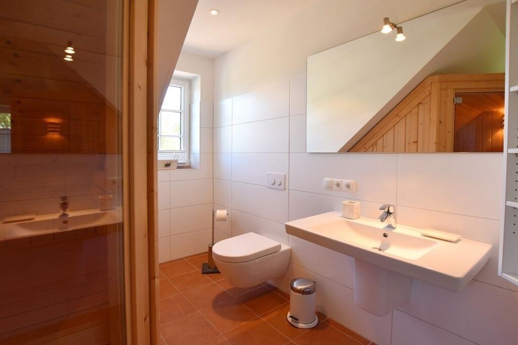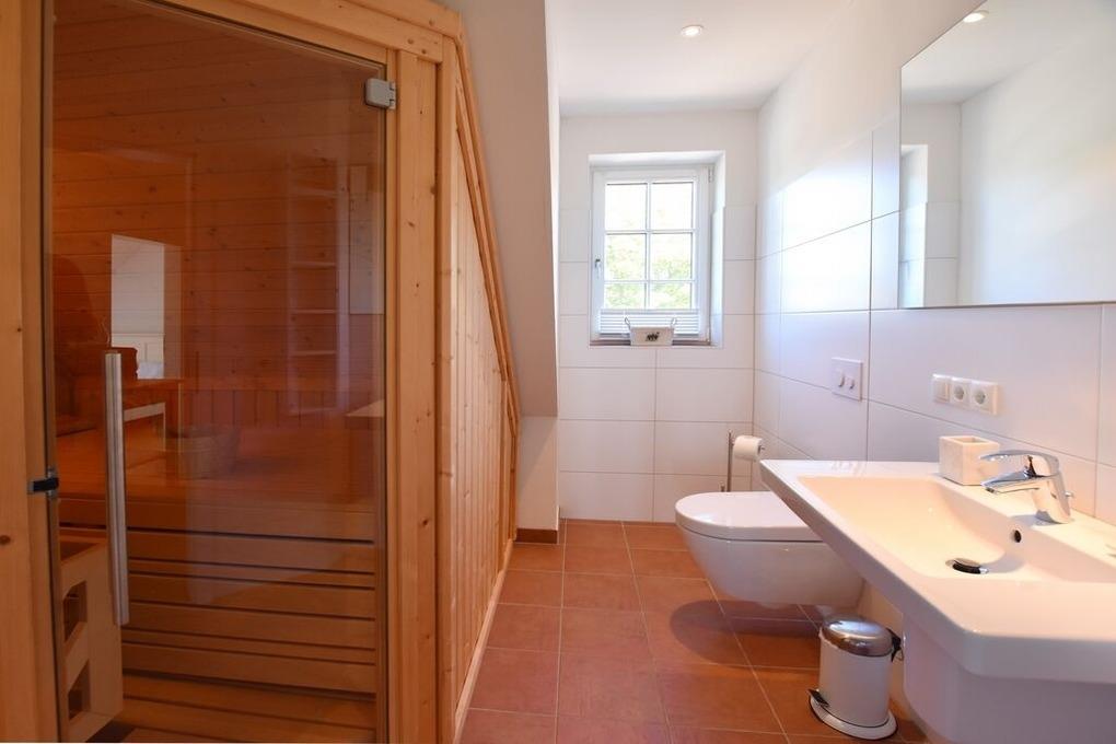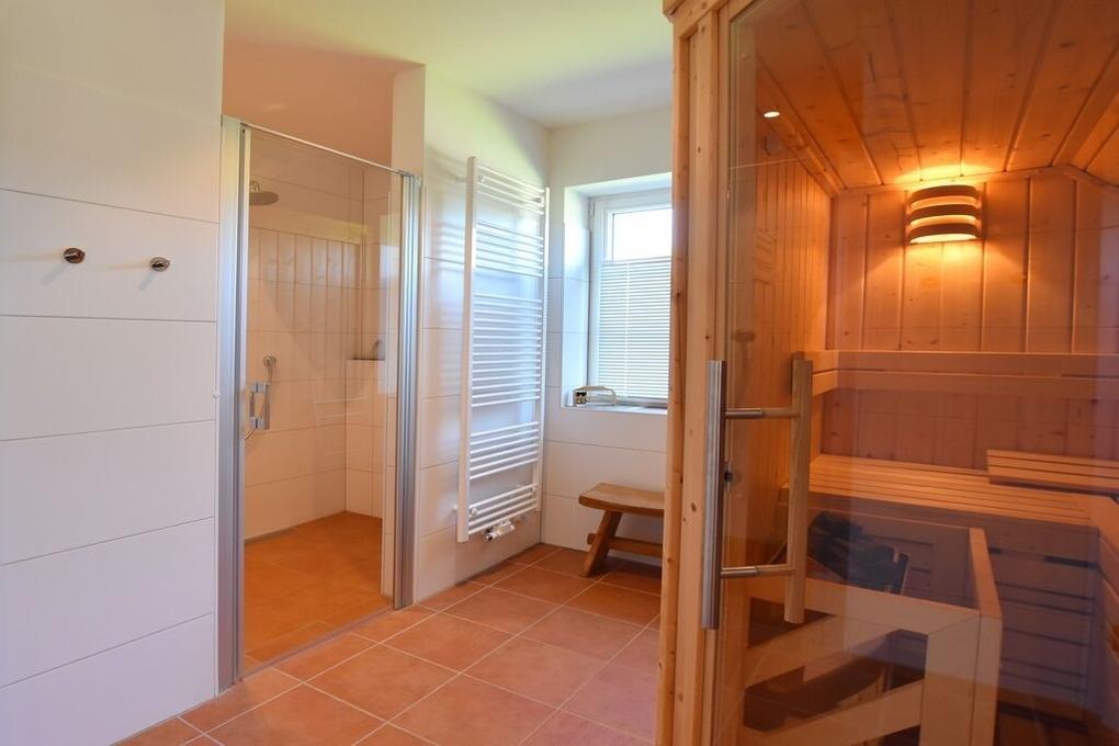 OG: 2 Schlafzimmer mit Doppelbetten und 2 moderne Duschbäder, eines davon verfügt über eine Sauna.