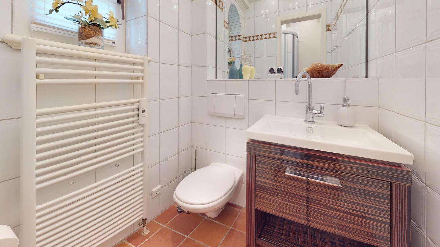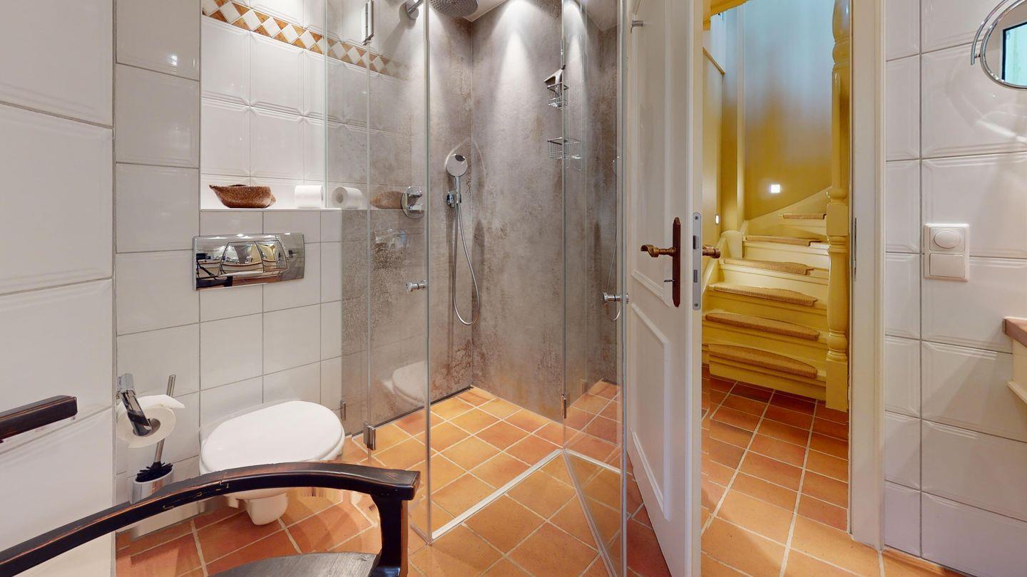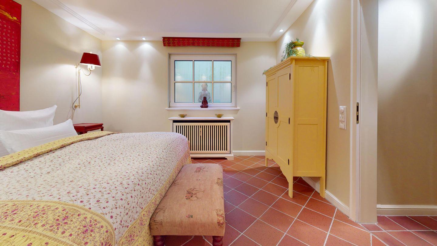 Im Untergeschoss erwarten Sie zwei gemütliche Schlafzimmer mit komfortablen Doppelbetten, Einbauschränken und TV, die für erholsame Nächte sorgen. Großzügige Kellerschächte sorgen dabei für ausreichend Tageslicht und schaffen eine behagliche Atmosphäre. Ein weiteres modernes Badezimmer mit Waschtisch und Regendusche steht Ihnen ebenfalls zur Verfügung und bietet höchsten Komfort.