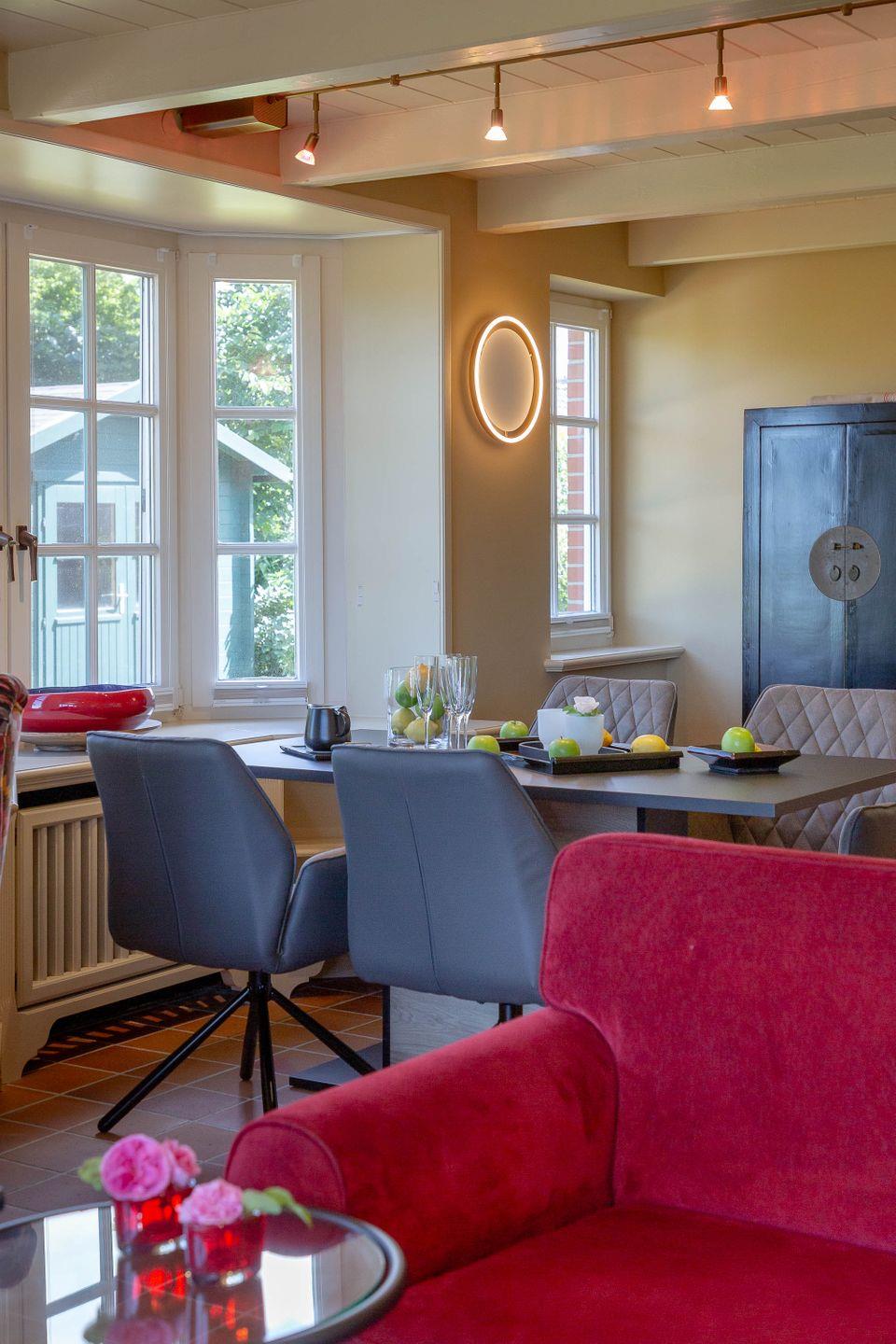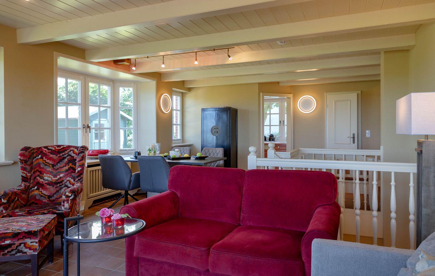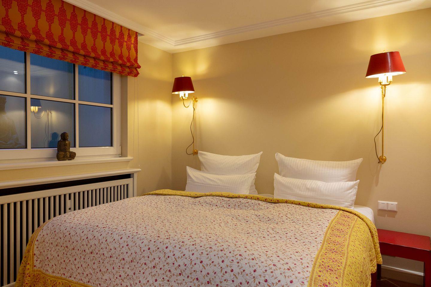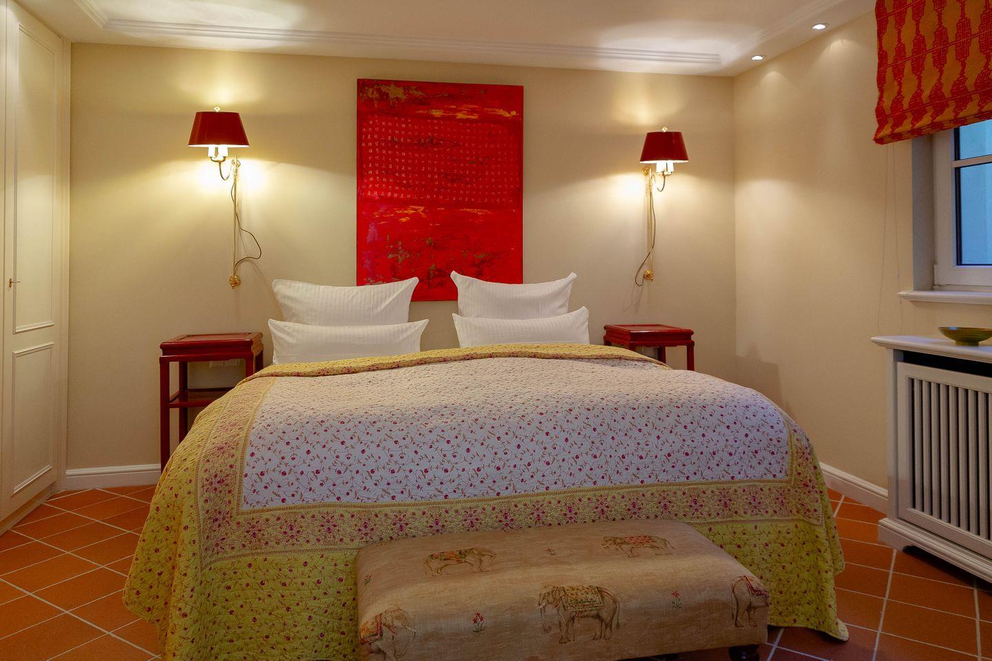 Bis zu vier Personen residieren im Erdgeschoss des Hauses. Chinesische Antiquitäten, bequeme Polstermöbel in chinesischem Rot, Gardinen aus Leinen in chinesischem Druck, ausgesuchte Möbel und Bilder aus dem „Reich der Mitte“ und Textiles in satten, warmen Farben geben Ihrem Domizil den asiatischen Touch. Dazu gesellen sich traditionelle Ausstattungsmerkmale wie freigelegte Deckenbalken.