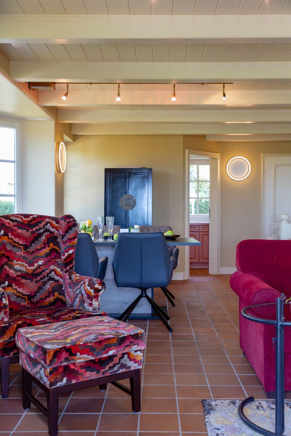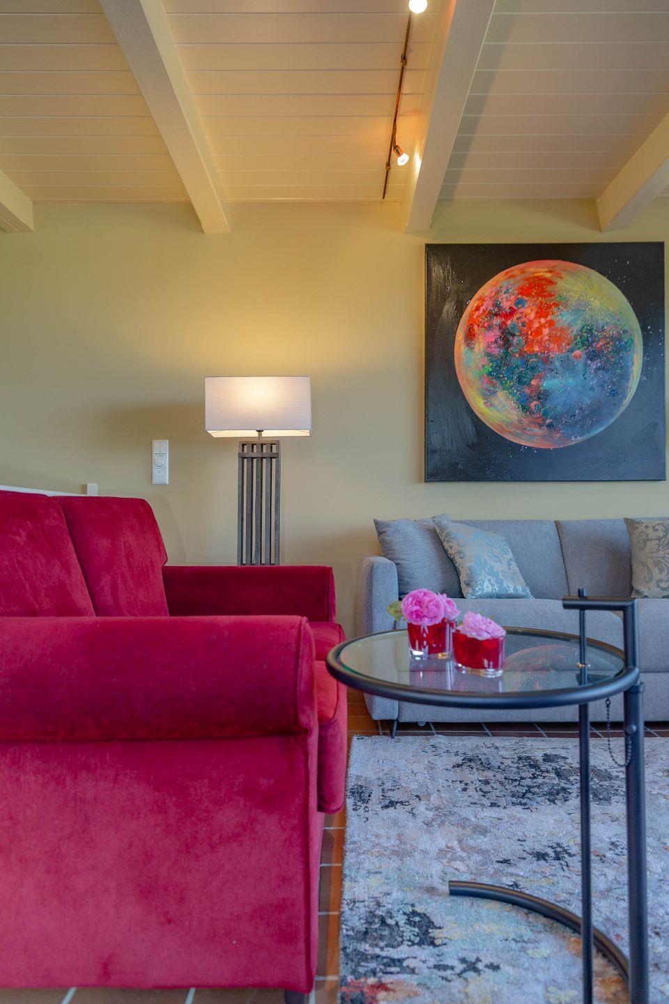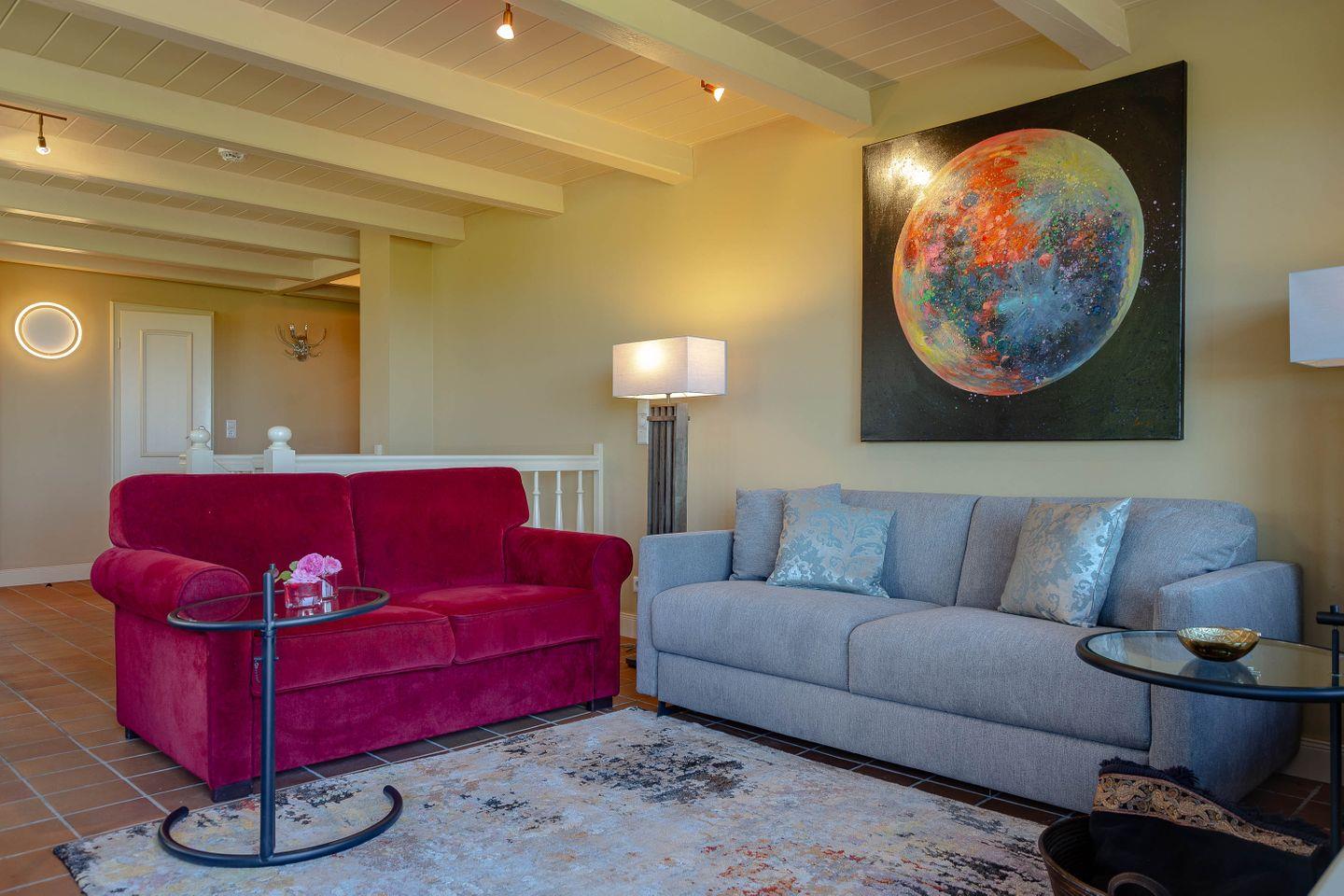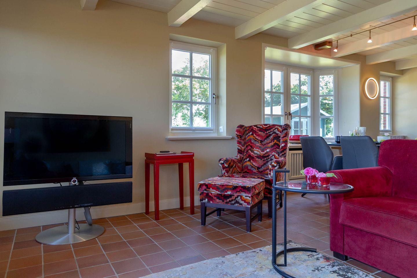 Bis zu vier Personen residieren im Erdgeschoss des Hauses. Chinesische Antiquitäten, bequeme Polstermöbel in chinesischem Rot, Gardinen aus Leinen in chinesischem Druck, ausgesuchte Möbel und Bilder aus dem „Reich der Mitte“ und Textiles in satten, warmen Farben geben Ihrem Domizil den asiatischen Touch. Dazu gesellen sich traditionelle Ausstattungsmerkmale wie freigelegte Deckenbalken.