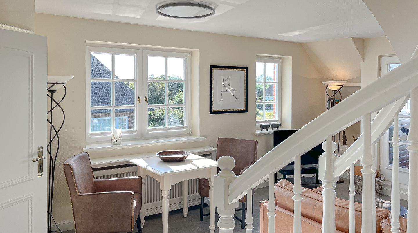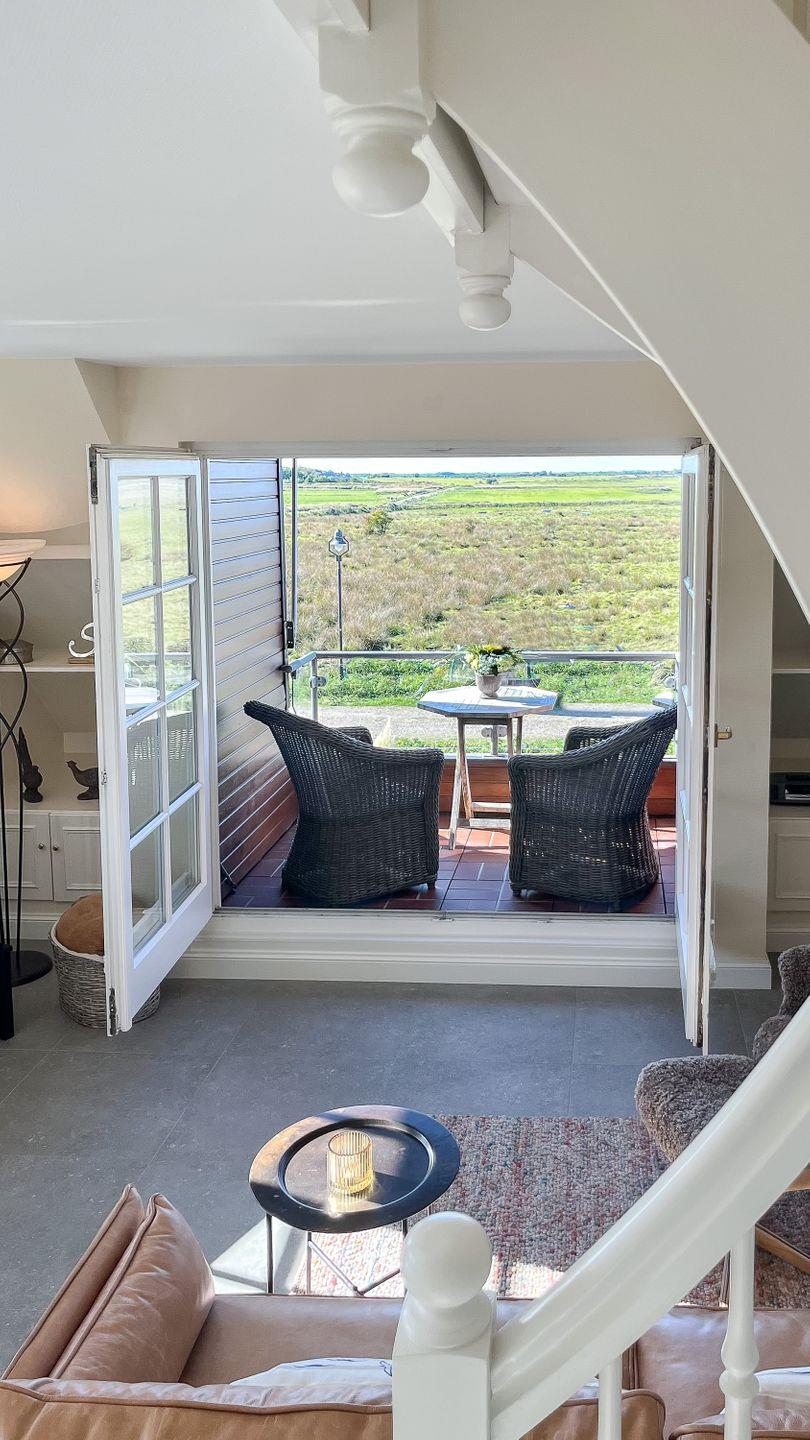 Der grandiose Standort in den Salzwiesen zwischen Morsum und Archsum allein macht diese Ferienwohnung schon zu einem einzigartigen Erlebnis. Hinzu kommt die Lage im Obergeschoss des Hauses mit einer Loggia, die einen atemberaubenden Blick auf das satte Grün der Natur und natürlich einzigartige Sonnenuntergänge bietet.