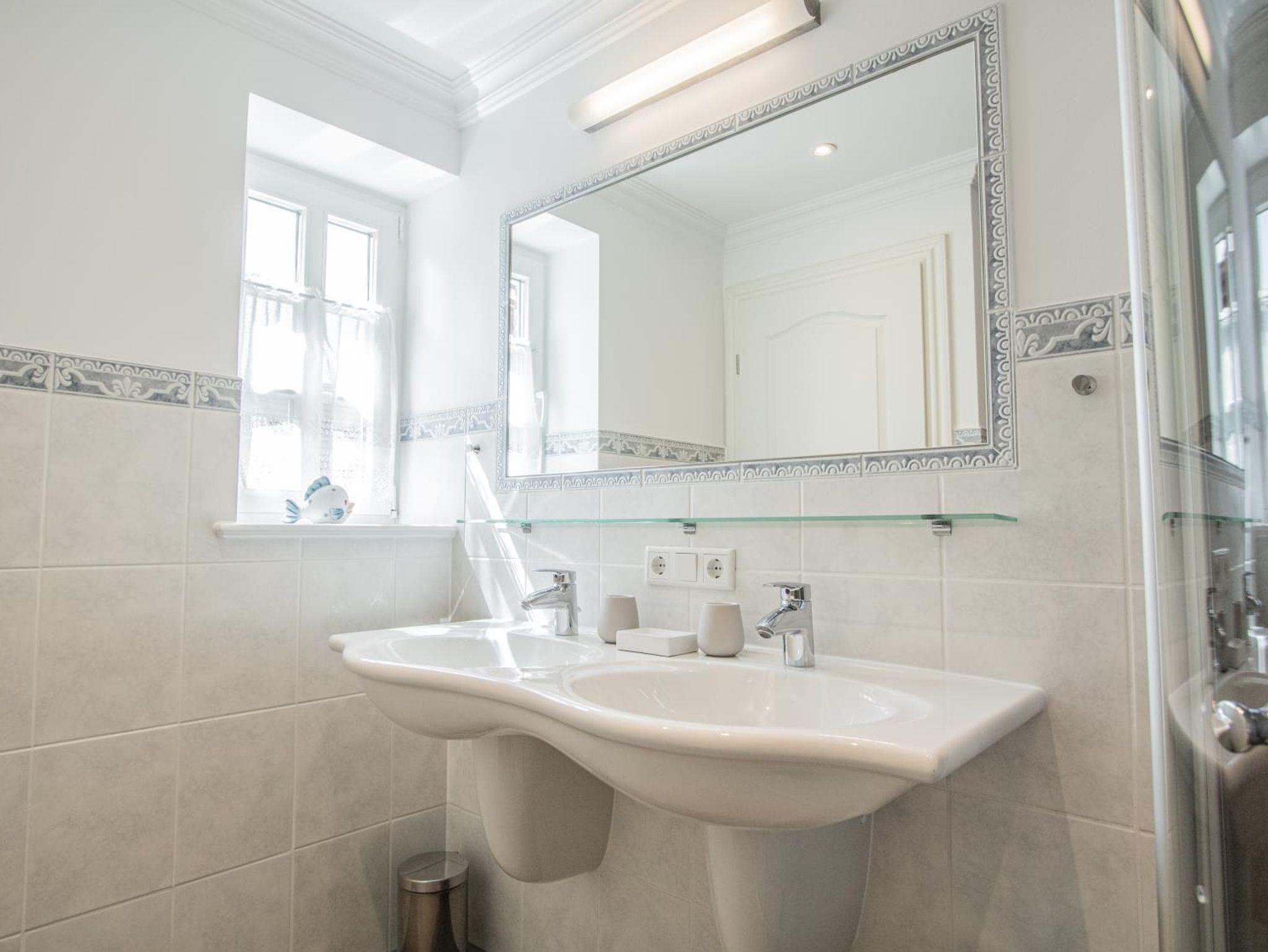 Föhn, Trockner, Waschmaschine, WC, Doppelwaschbecken, Fußbodenheizung, Spiegel, Dusche (bodengleich), Fenster Ausreichend Handtücher und Vorleger.