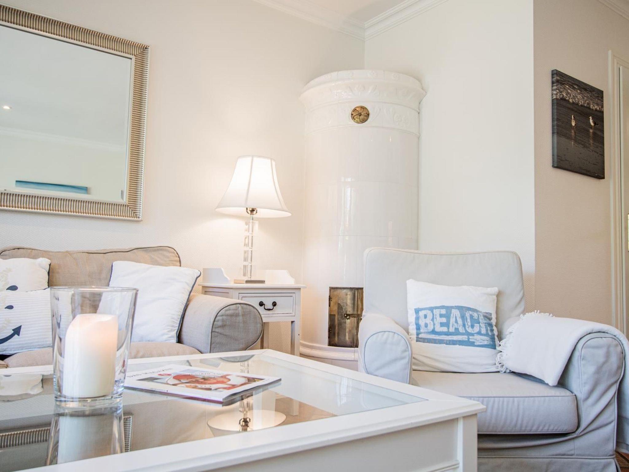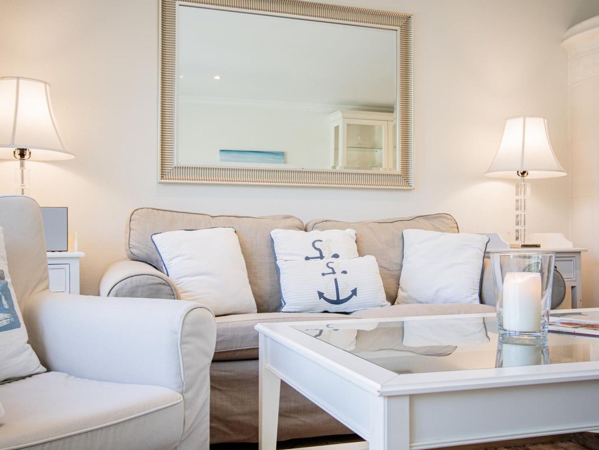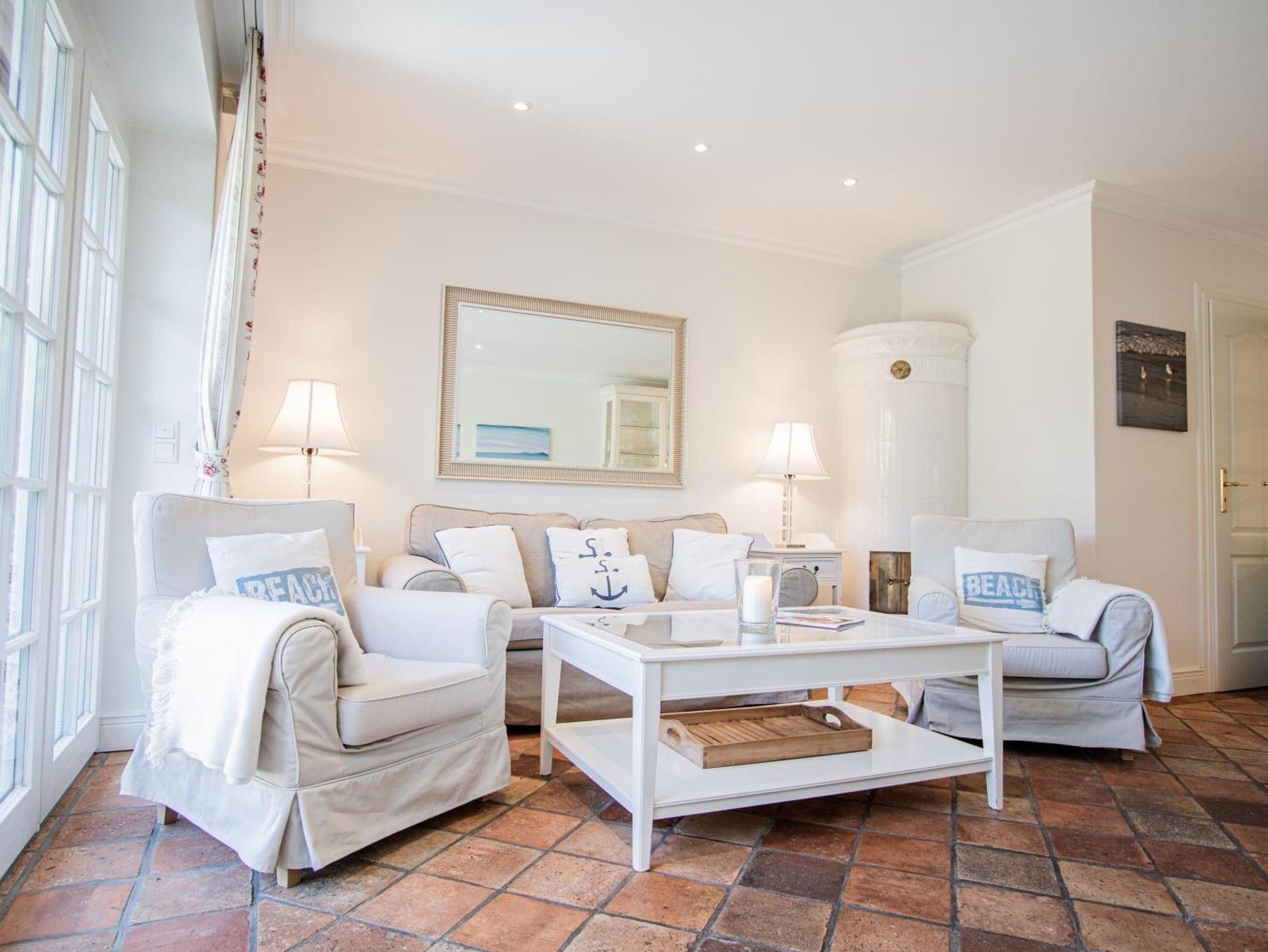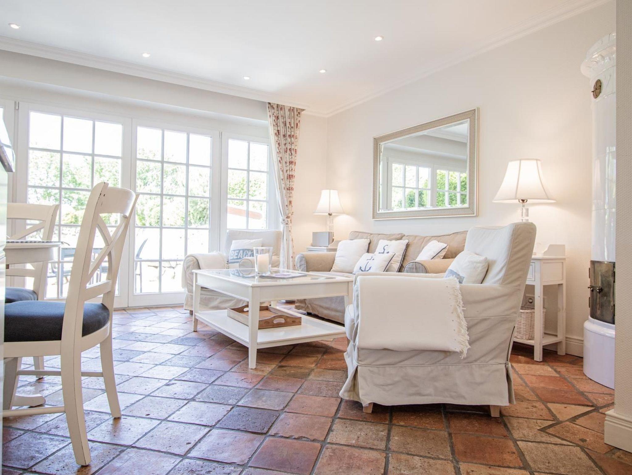 Ein helles Wohnzimmer mit großer Fensterfront zum möblierten Terrasse mit Sitzecke und Strandkorb. TV SAT/Kabel, Radio, HiFi-Anlage, CD-Player, Fußbodenheizung, Sofa und Kachelofen.