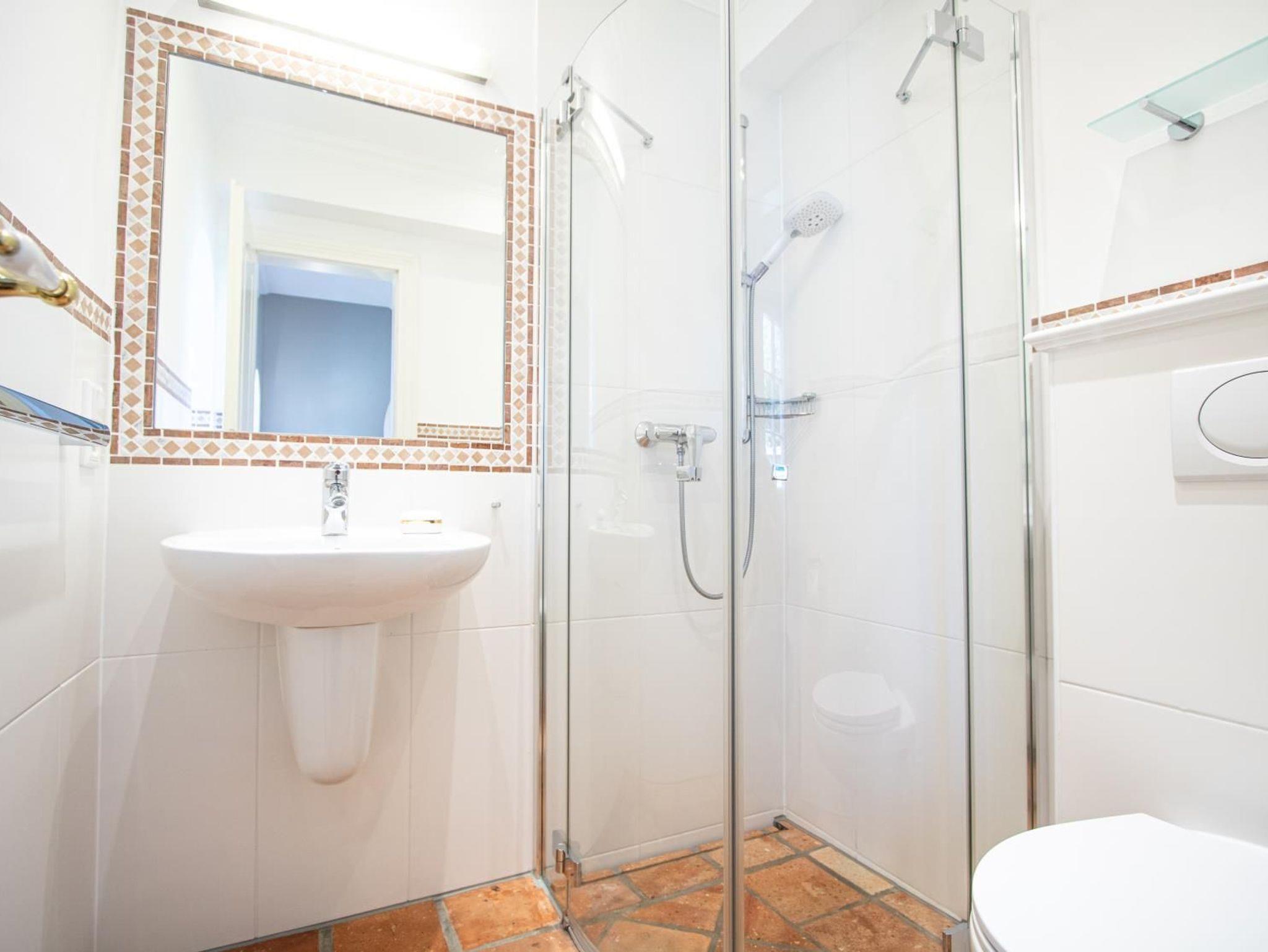 WC (separat): WC, Waschbecken, Fußbodenheizung, Spiegel, Dusche (bodengleich), Fenster Flur Ausreichend Handtücher und Vorleger.