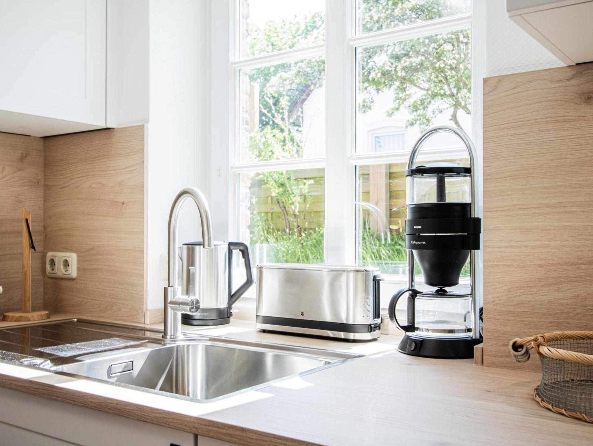 Mikrowelle, Backofen, Kühlschrank, Geschirrspüler, Gefrierfach, Wasserkocher, Kaffeemaschine, Toaster, Ceran-Kochfeld, Geschirr, Küchenmaschine, Kochutensilien.