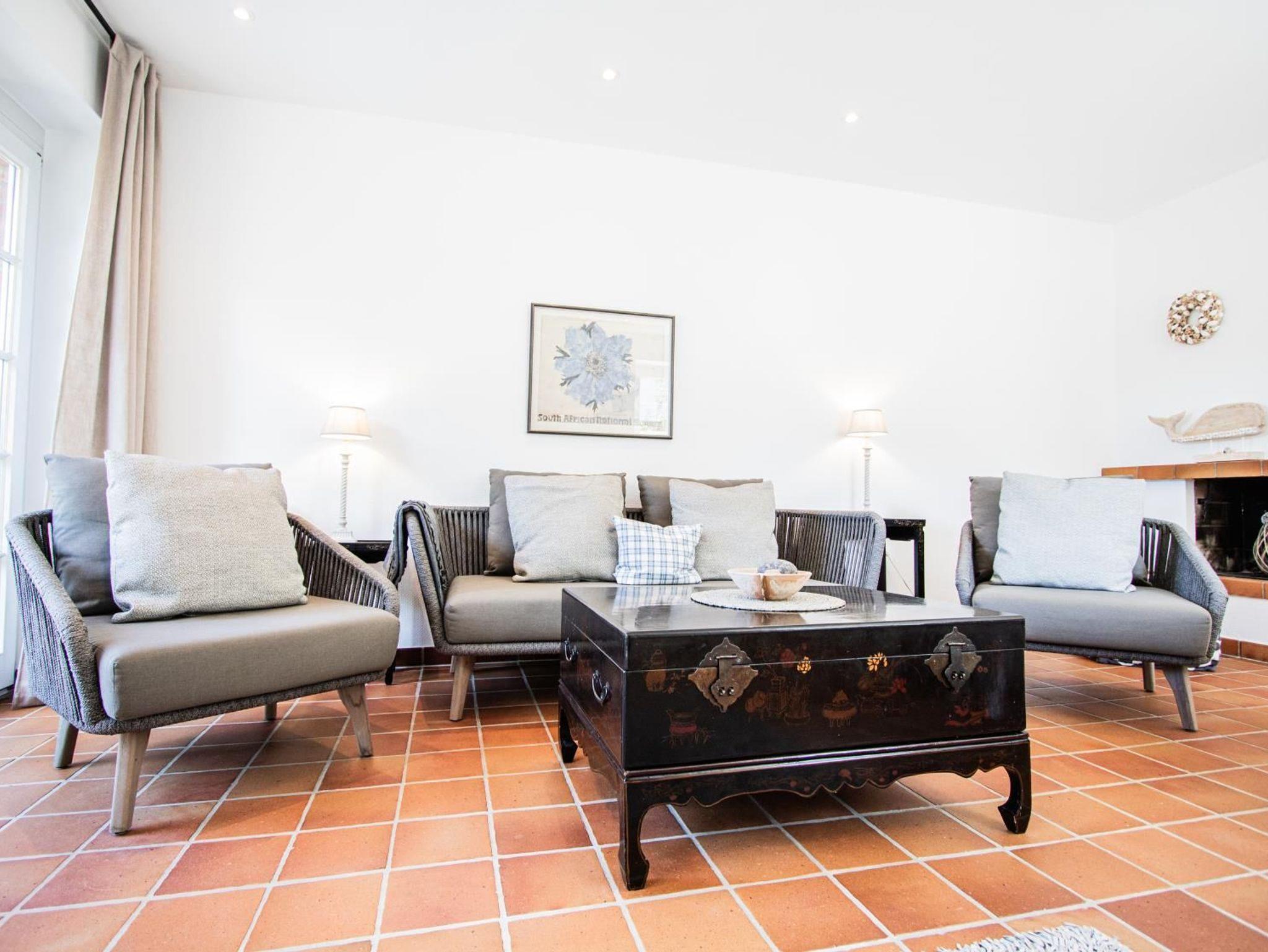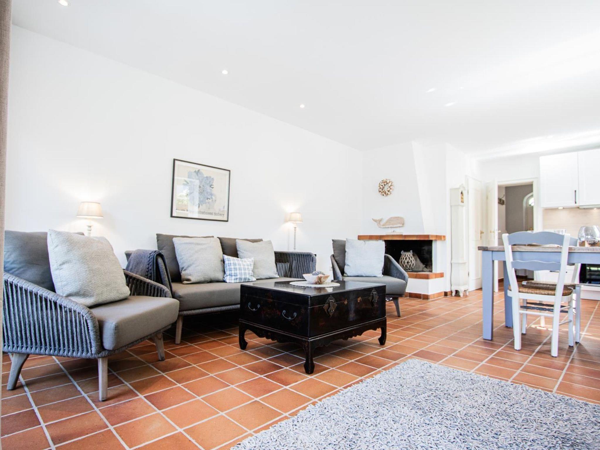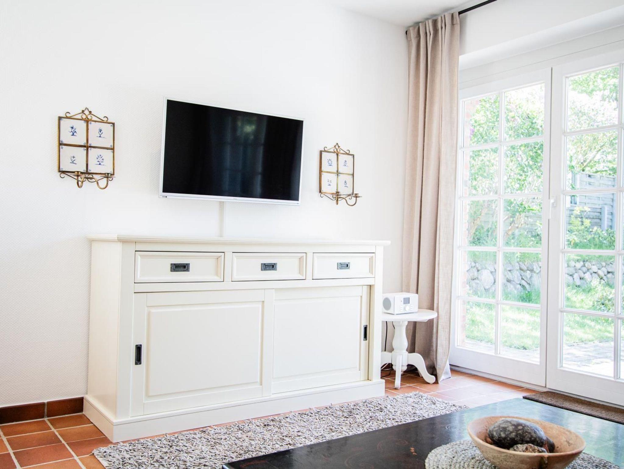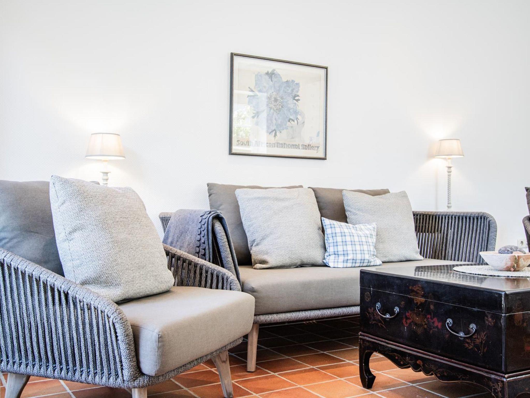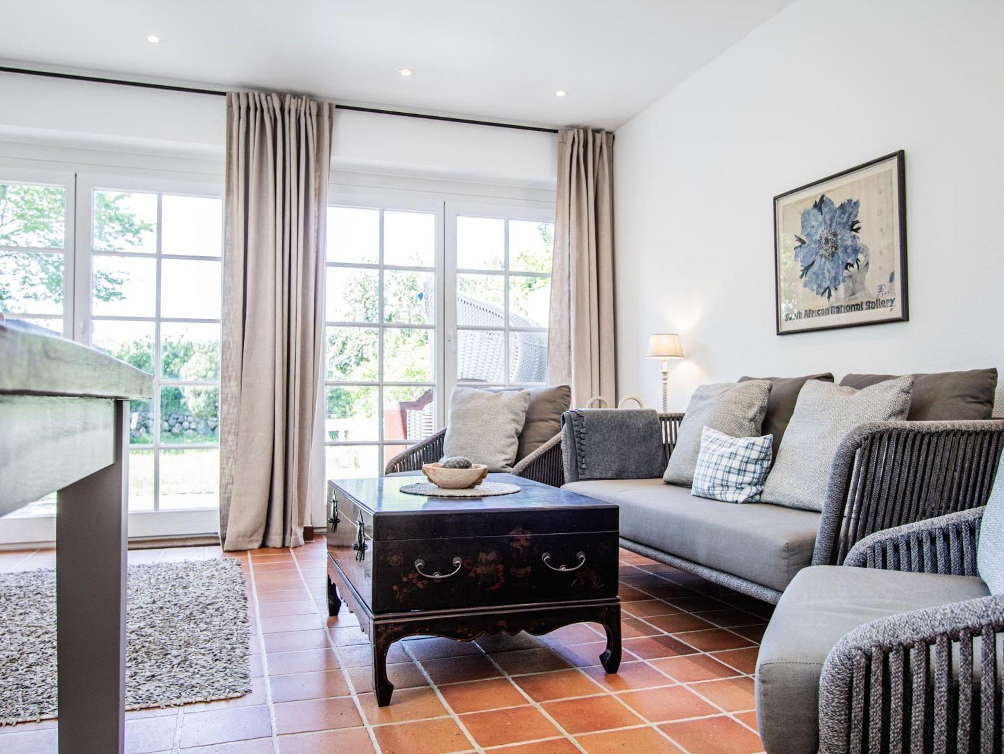 Ein helles Wohnzimmer mit großer Fensterfront zum möblierten Terrasse mit Sitzecke und Strandkorb. TV SAT/Kabel, DVD-Player,Radio, HiFi-Anlage, CD-Player, Fußbodenheizung, Sofa