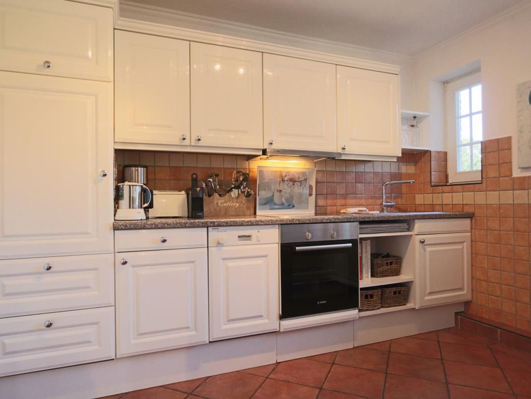 Kochnische: Backofen, Kühlschrank, Geschirrspüler, Gefrierfach, Wasserkocher, Kaffeemaschine, Toaster, 4-Plattenherd, Geschirr.