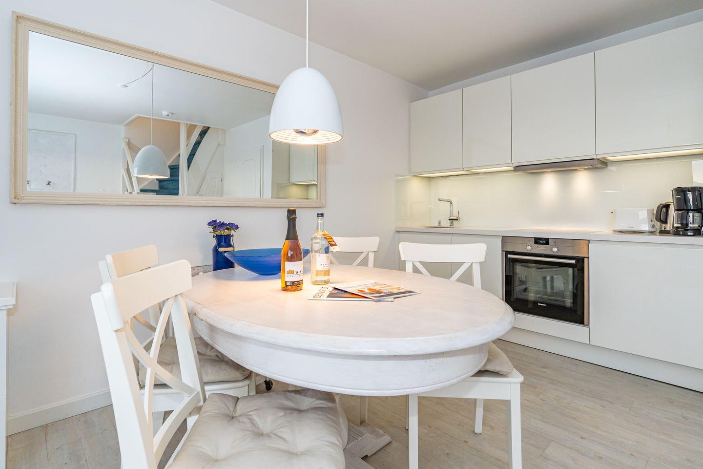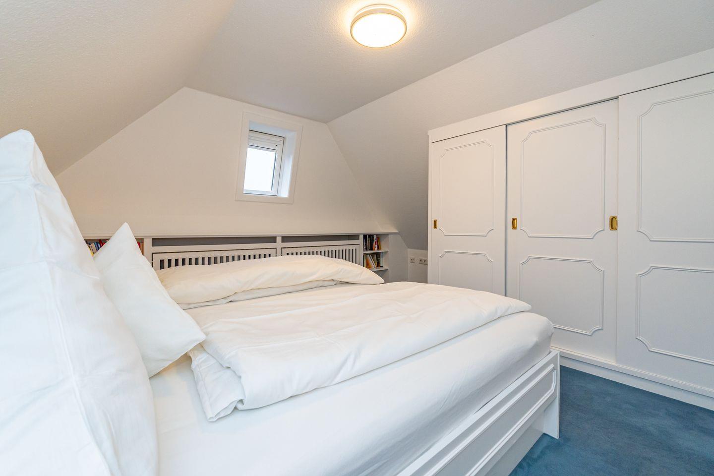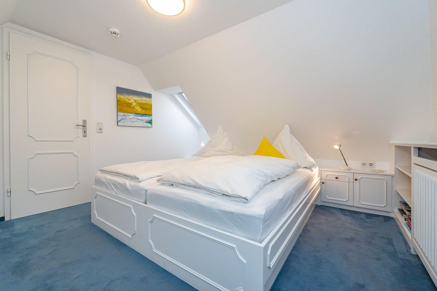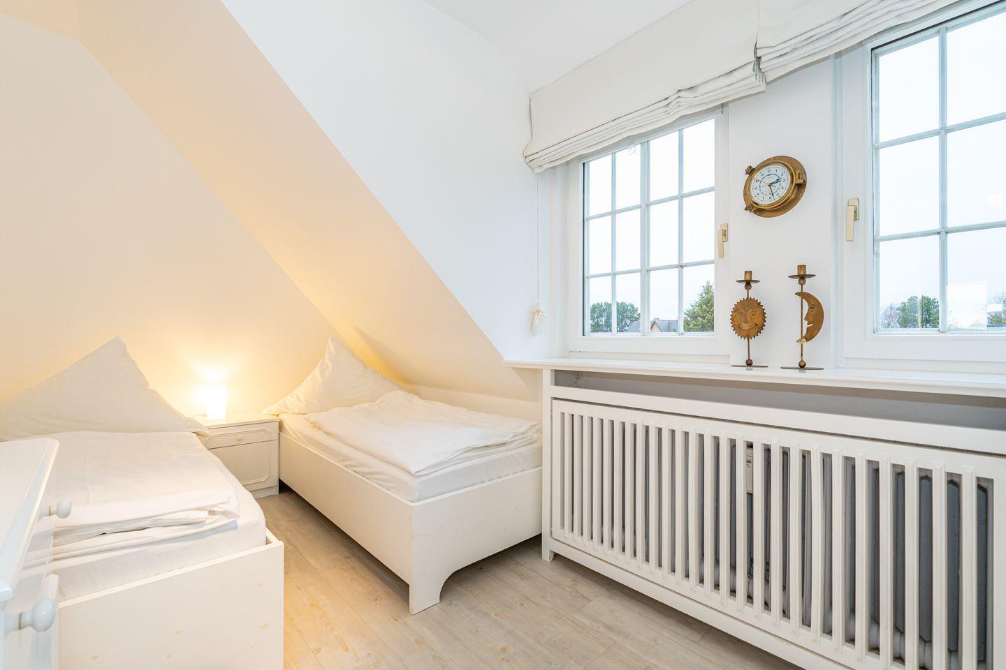 Ebenfalls auf dieser Ebene finden Sie das erste Schlafzimmer mit zwei Einzelbetten und Einbauschrank, das Duschbad mit WC & Waschmaschine, als auch einen Flur mit Garderobe. Eine Treppe führt zum Dachgeschoss (siehe Foto). Im Dachgeschoss befindet sich das zweite Schlafzimmer mit Doppelbett. Die Anlage liegt in einer ruhigen Sackgasse, welche nur von Anwohnern befahren wird. Ein Pkw-Stellplatz gehört zu dieser Ferienwohnung.