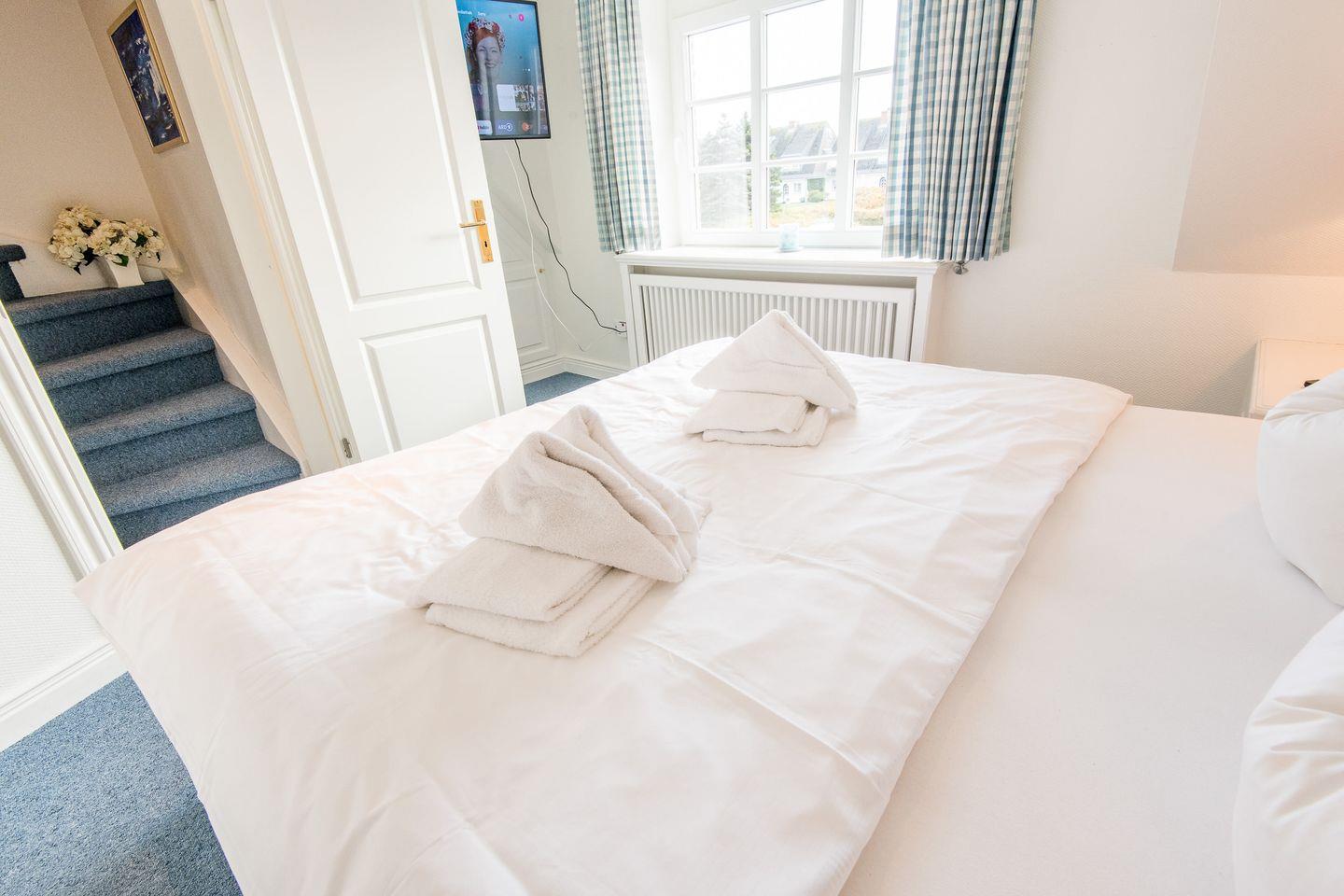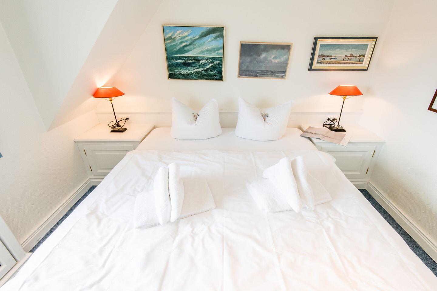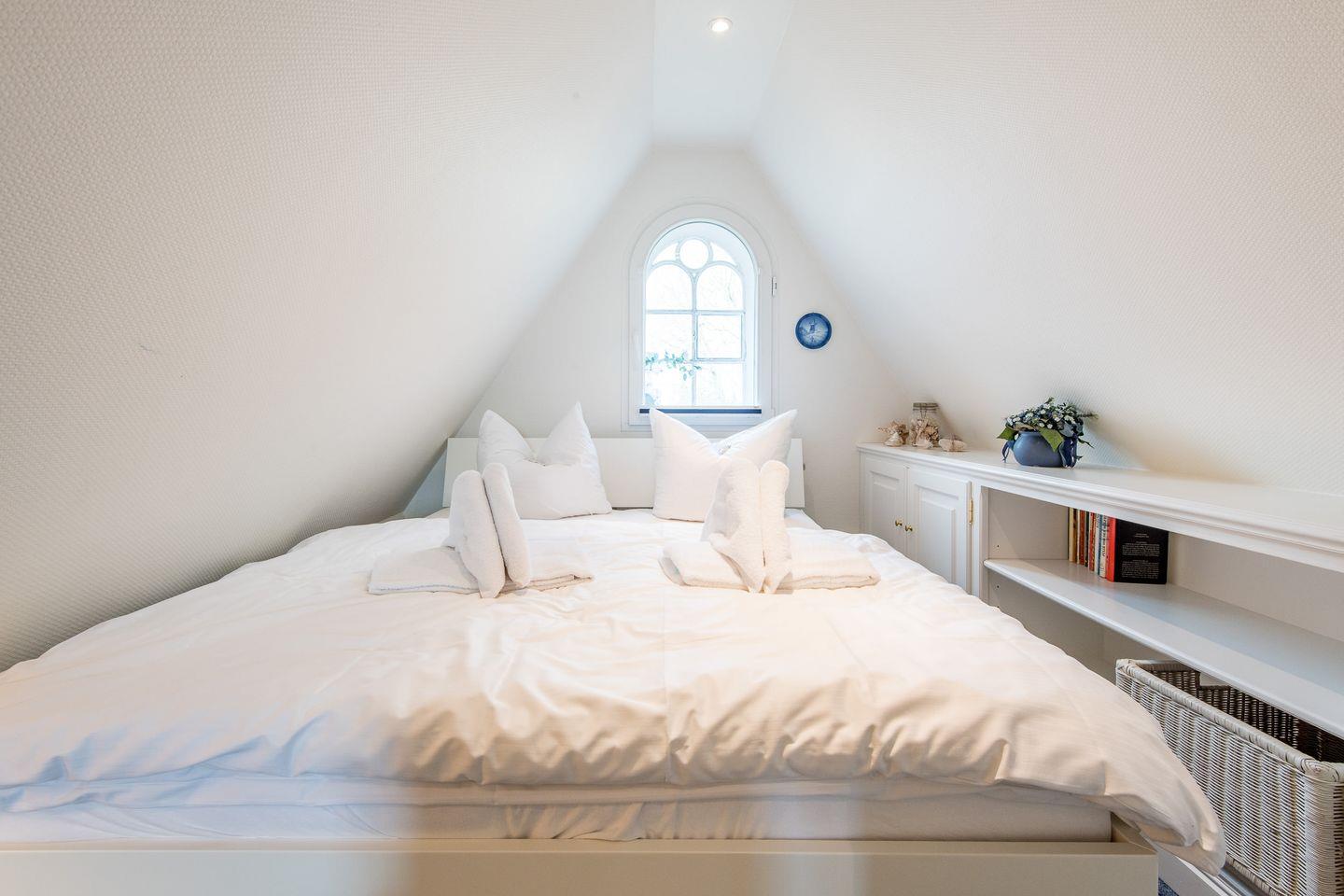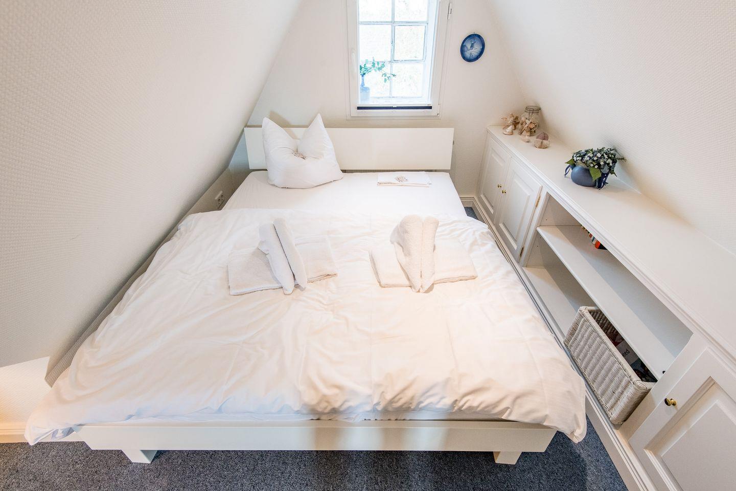Die drei komfortabel eingerichteten Schlafzimmer dieses Mittelreihenhauses bieten den perfekten Rückzugsort für erholsame Nächte und entspannte Urlaubstage. Das erste Schlafzimmer ist mit einem großzügigen Doppelbett (2x 90x200 cm) ausgestattet und bietet durch praktische Einbauschränke viel Stauraum für ein aufgeräumtes Ambiente. Auch im zweiten Schlafzimmer lädt ein Doppelbett (2x 90x200 cm) zum Abschalten und Entspannen ein. Im gemütlichen Dachgeschosses befindet sich das dritte Schlafzimmer, ebenfalls mit einem komfortablen Doppelbett (2x 80x200 cm) versehen.
