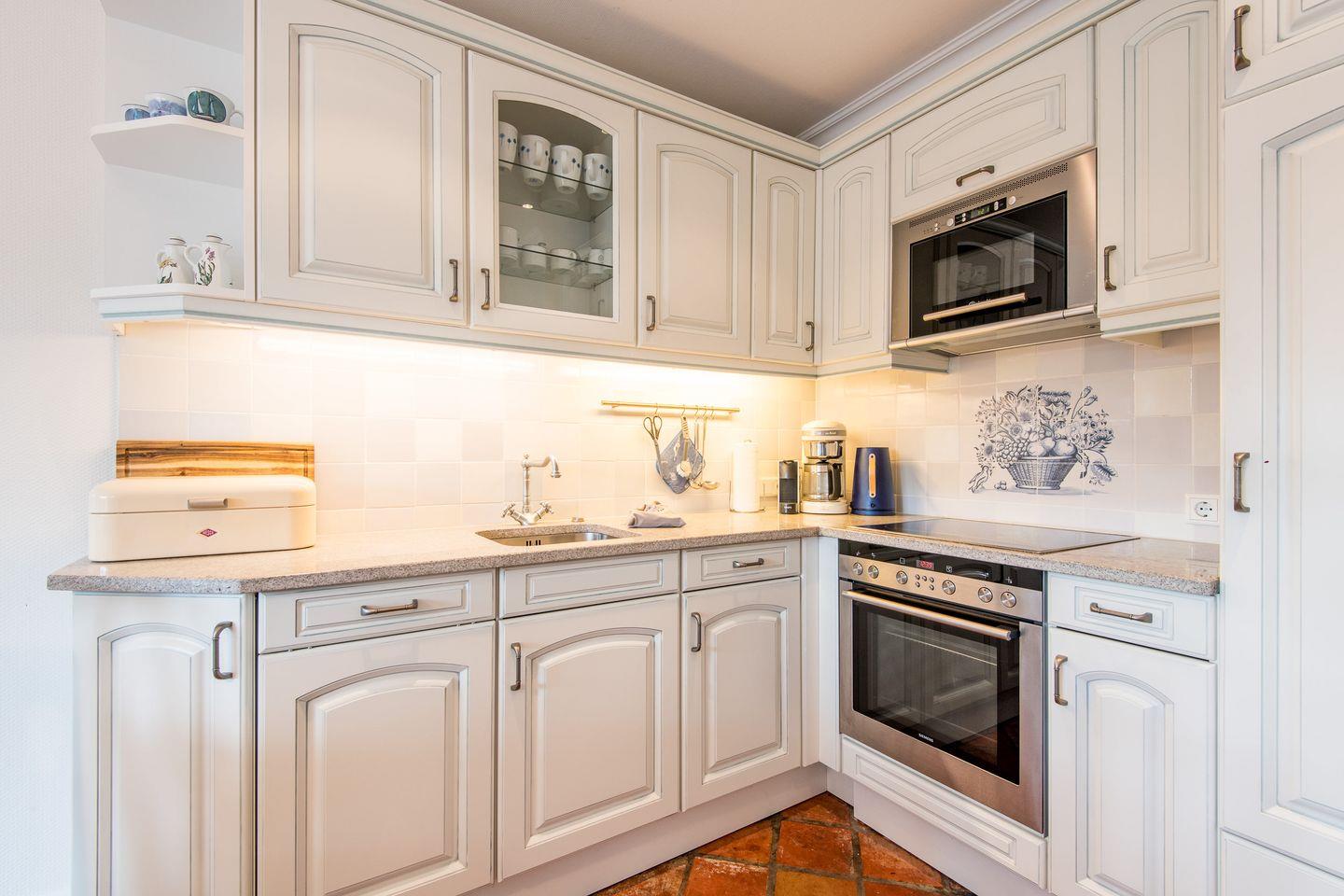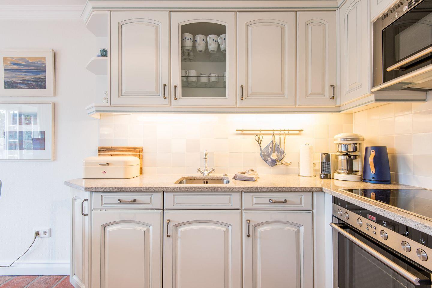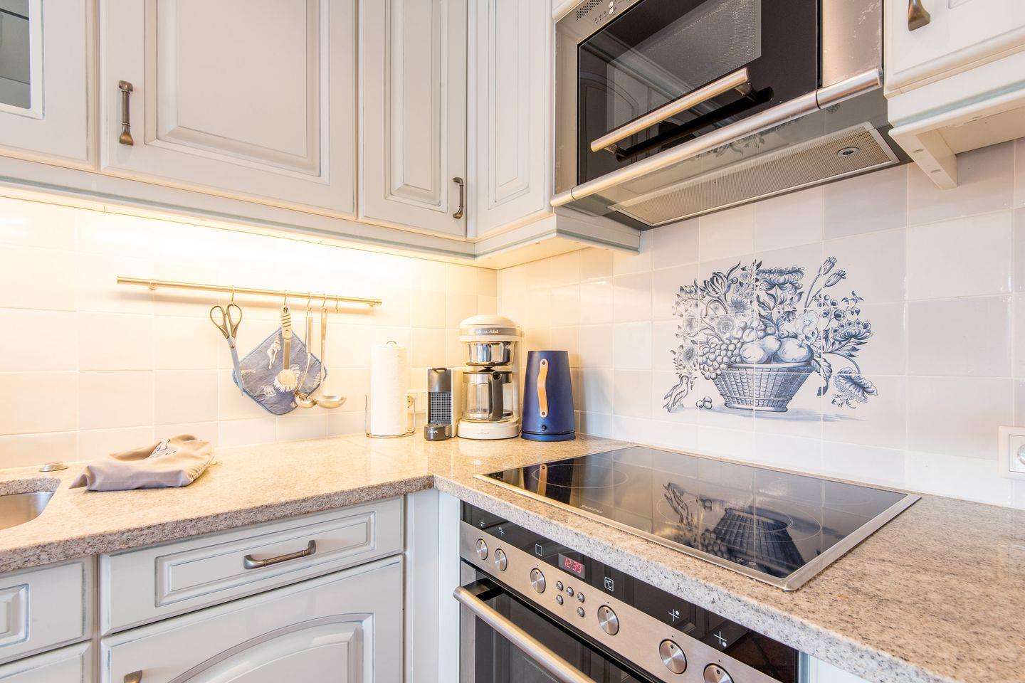 Die Küche ist offen gestaltet und bietet mit einem Geschirrspüler, einer Filterkaffeemaschine und modernen Geräten alles, was Sie für eine unkomplizierte Selbstverpflegung benötigen.
