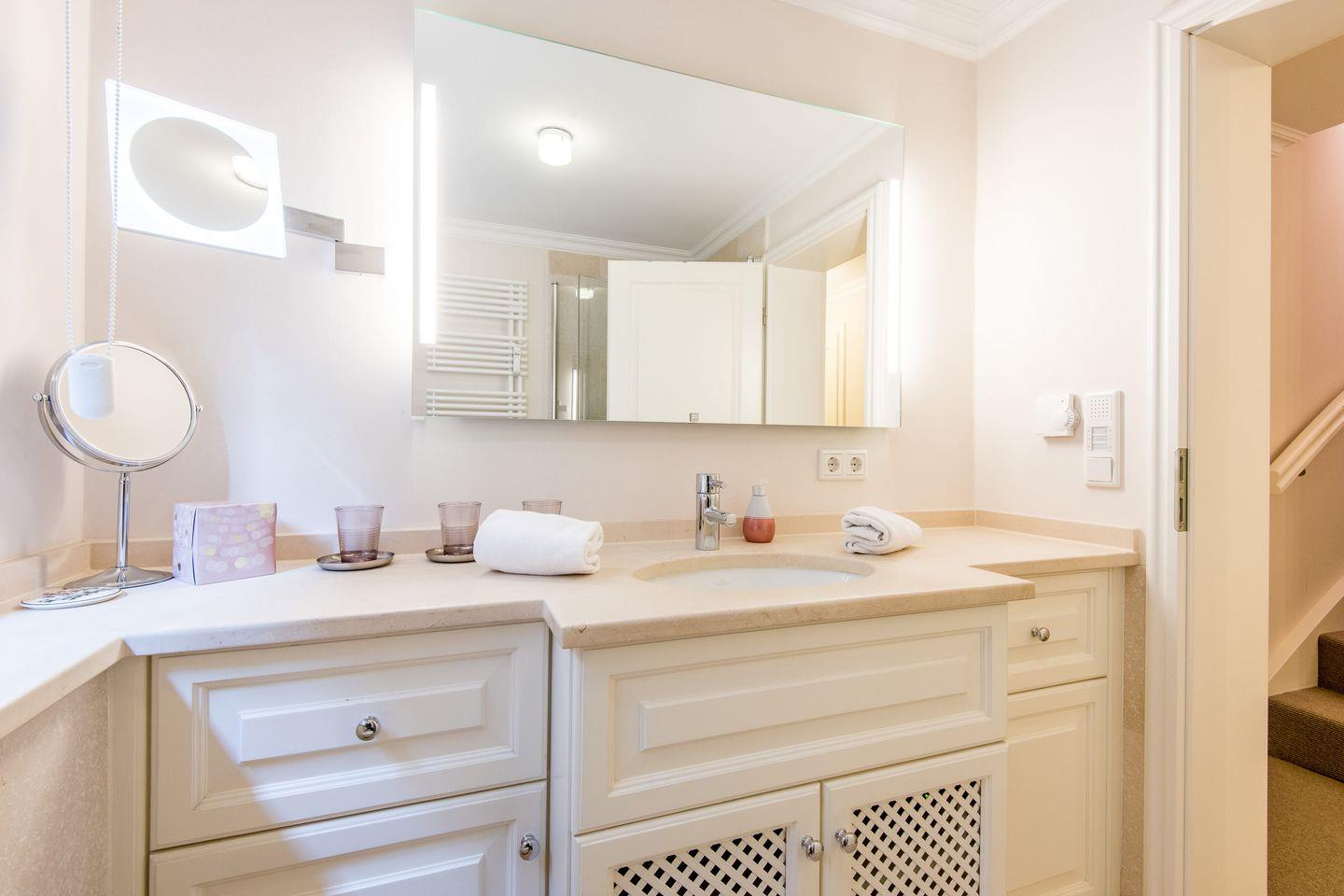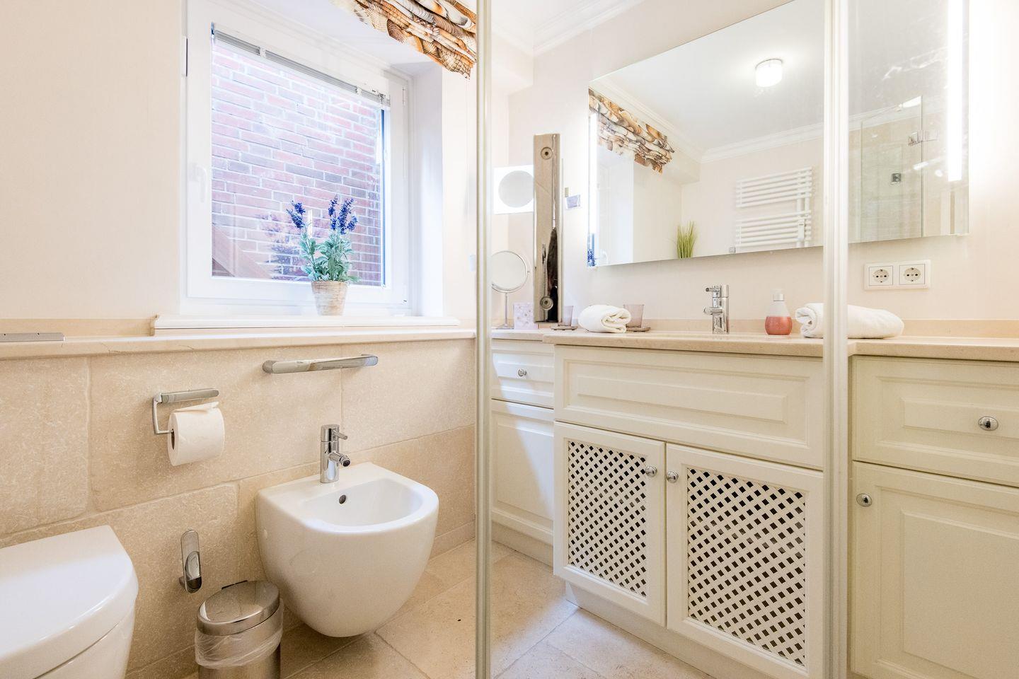 Das moderne Badezimmer verfügt über eine großzügige Dusche, einen Handtuchwärmer und bietet somit alles, was Sie für einen entspannten Start in den Tag benötigen. Ein separates Gäste-WC ergänzt die Ausstattung und sorgt für zusätzlichen Komfort.