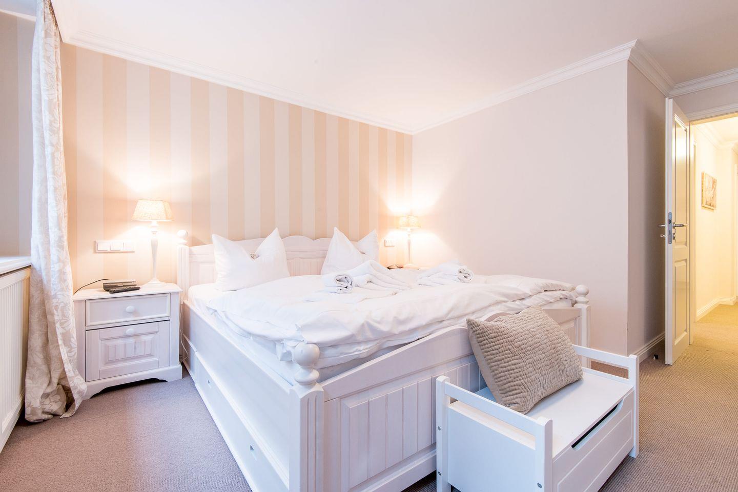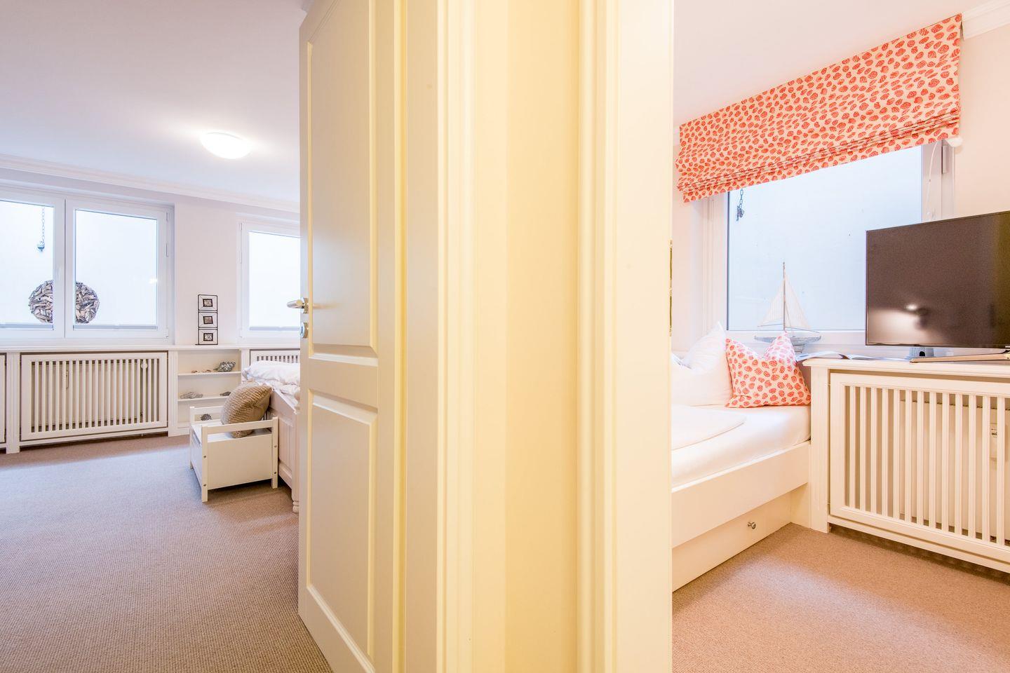 Die beiden Schlafzimmer der Wohnung bieten ausreichend Platz und Komfort für eine erholsame Nacht. Das Hauptschlafzimmer ist mit einem Doppelbett (2x 90x200 cm) und einem TV ausgestattet, während das zweite Schlafzimmer über zwei Einzelbetten (je 90x200 cm) verfügt und sich perfekt für Kinder oder zusätzliche Gäste eignet.