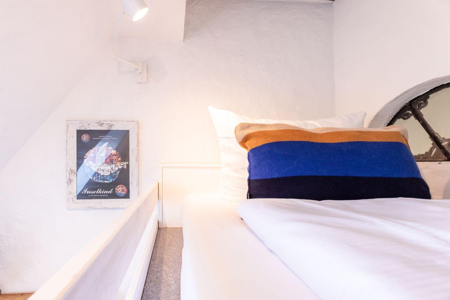 Eine Treppe höher geht es zu den beiden Schlafzimmern. Eins davon verfügt über ein modernes Boxspringbett (mit ausreichend Stauraum im Bettkasten) und das andere über ein kuscheliges Alkovenbett (auch für "kleinere Erwachsene" geeignet), das über eine Leiter erreichbar ist. Gemeinsam haben beide Schlafzimmer den fantastischen Ausblick aus dem Fenster, der in dem kleinen Zimmer sogar bis zum Watt reicht.