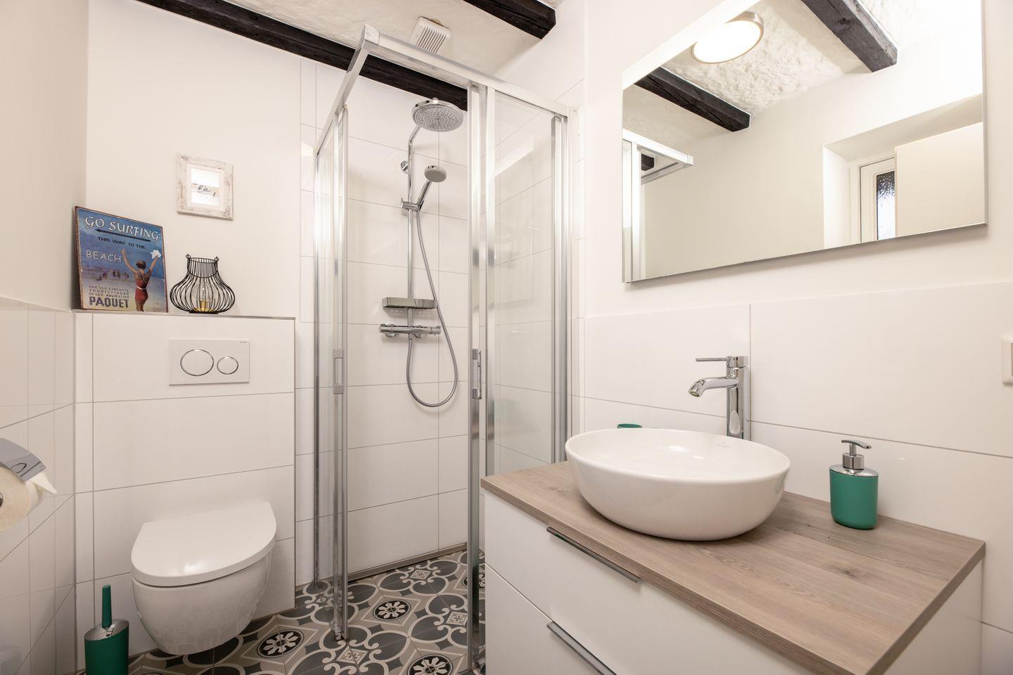 Das Appartement mutet wie ein kleines Hauteil an und erstreckt sich über zwei Etagen: Unten befindet sich der helle Wohn- und Essbereich mit einer offenen Küchenzeile, die hochwertig ausgestattet ist. Highlight ist die gemütliche Terrasse (Westlage), die zum Frühstück oder Sundowner einlädt. Zudem befindet sich auf der unteren Etage auch das hübsche Bad mit seinen Fliesen im Mosaik-Stil und der Walk-in Dusche.