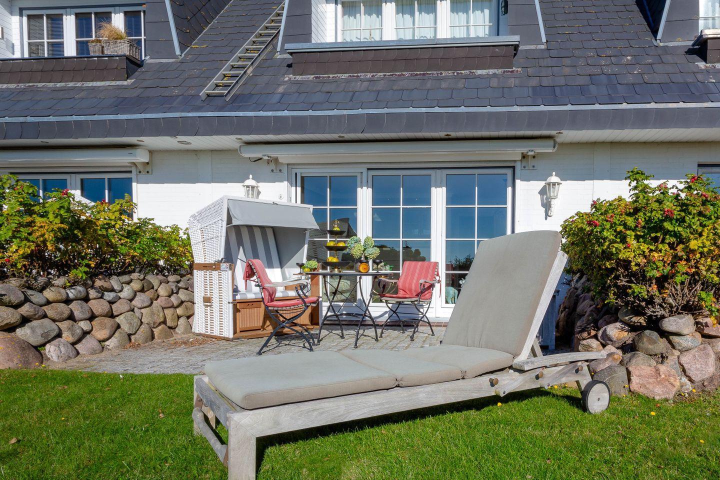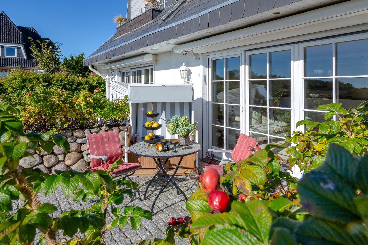 Idyllische Lage, exklusive Ausstattung und atemberaubende Panoramablick – alles das bietet Ihnen unsere Wohnung „Sönshörn 8 rechts“. Diese liebevoll eingerichtete Wohnung ist das ideale Refugium für bis zu zwei Personen. Bequeme, mit englischem Leinen bezogenen Polstermöbel, ein Jugendstilofen von Mylin, ein grüner Teppich mit stilvollen Blumenmotiven aus der Hof-Galerie im Rathaus Westerland und eine Küchenzeile mit Wandbildfliesen der Firma Mylin gehören zu dieser schönen Einrichtung. Das Schlafzimmer mit TV, ausgestattet mit französischen Polsterbetten und goldenen Lampen aus dem Hause Newig, sowie das Marmorbad mit Waschtisch des Designers Philippe Starcks gehören genauso zu dieser Wohnung wie eine Schlafcouch für ein Kind oder einen vorübergehend bleibenden Gast, ein Bose-Musiksystem und WLAN. Eine Sonnenterrasse mit Gartenmöbeln von Garpa lädt auf dem naturnahen Heidegrundstück mit direktem Blick auf das Wattenmeer zum Entspannen ein.
