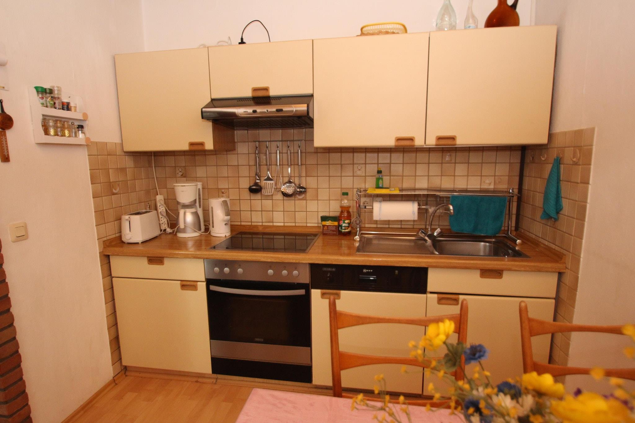 Parterre: (Wohnzimmer(TV(Satellit), Esstisch, Heizung(Gas)), offene Küche(4x Kochplatte(Ceranfeld), Wasserkocher, Toaster, Kaffeemaschine, Backofen, Mikrowelle, Spülmaschine, Kühl-/Gefrierkombination), Schlafzimmer(Doppelbett), Schlafzimmer(2x Einzelbett), Badezimmer(Dusche, Waschbecken, Toilette, Waschmaschine, Föhn)) bicycle room, Grill, Terrasse, Gartenmöbel, Parkplatz, Hochstuhl, Babybett (kostenlos)