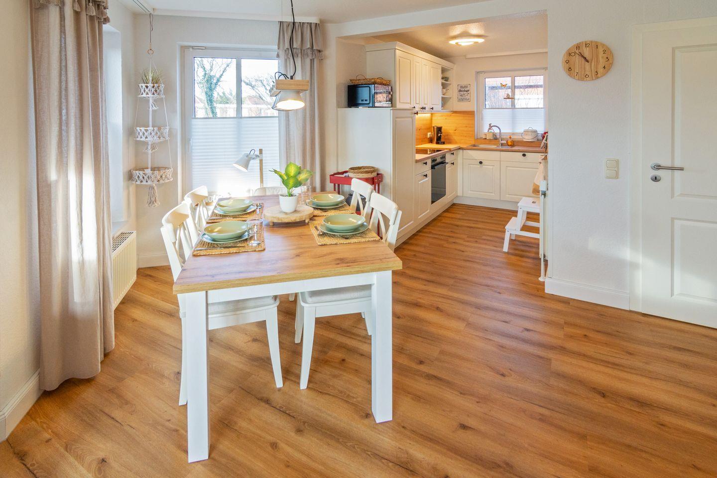 Im Erdgeschoss befinden sich der offen gestaltete Wohn- und Essbereich mit behaglicher Sofaecke, Satelliten-TV und WLAN sowie die vollständig ausgestattete offene Küche. Ein separates Gäste-WC ist ebenfalls vorhanden. Pflegeleichter Vinylboden, Spiele und Bücher sorgen für Gemütlichkeit zu jeder Jahreszeit, die Zentralheizung für angenehme Wärme.