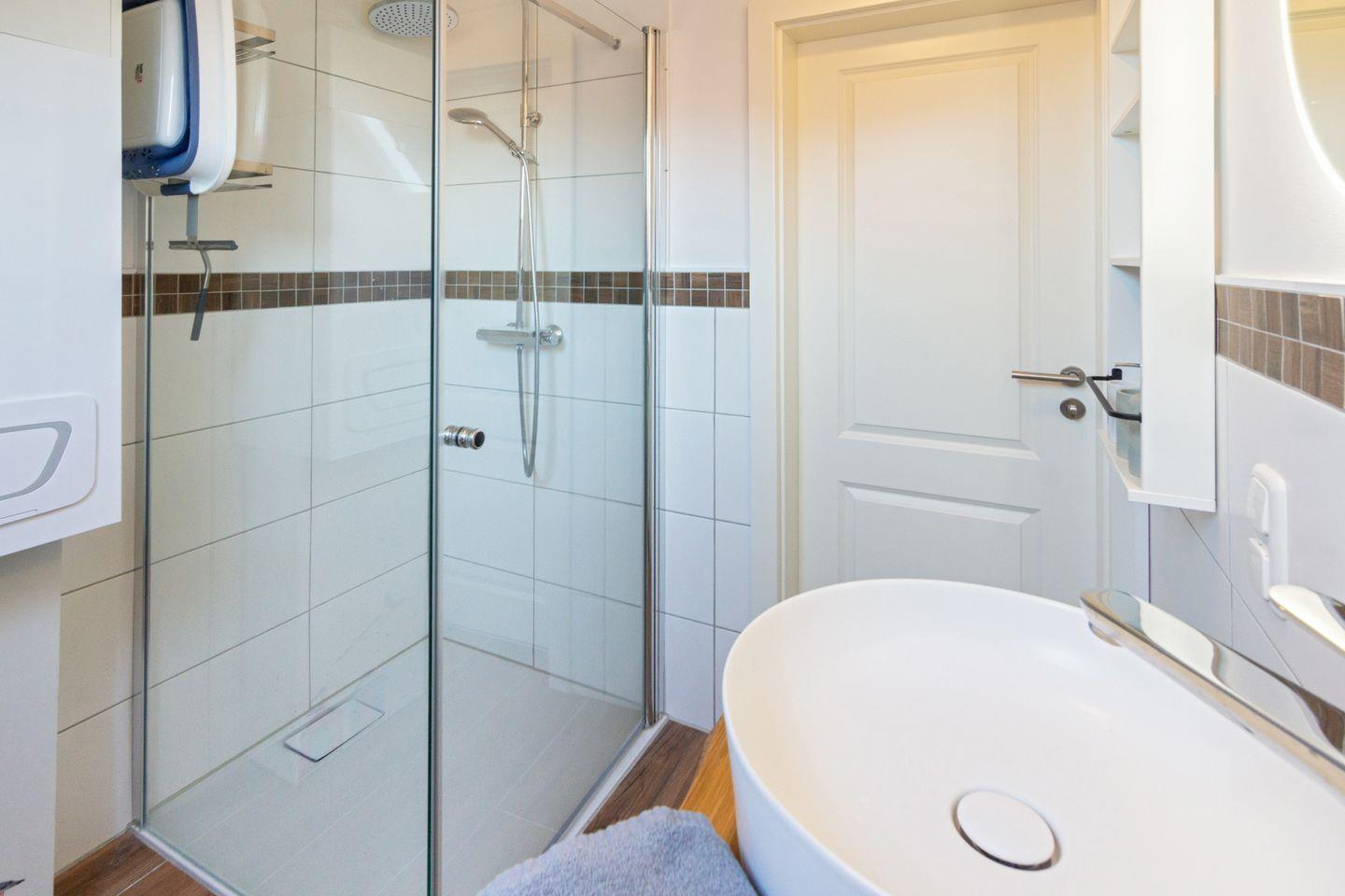 Im Obergeschoss befinden sich zwei Schlafzimmer, jeweils mit eigenem Fernseher, sowie ein modernes Duschbad mit bodengleicher Dusche und WC.
