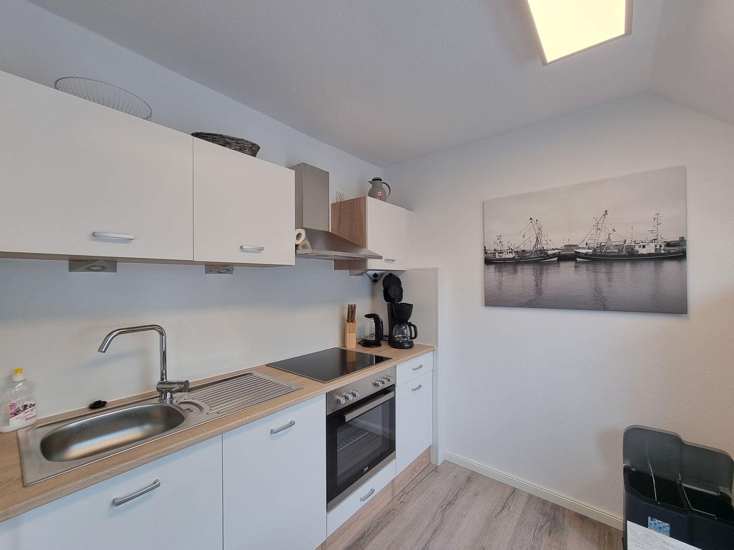 Die Wohnung besticht durch helle, lichtdurchflutete Räume mit einer offenen Küchenzeile und einem gemütlichen Wohnbereich. Das Sofa verfügt über eine Schlaffunktion und bietet zusätzliche Schlafmöglichkeiten. Sie haben Zugang zur Sonnenterrasse im Gemeinschaftsgarten, auf der Sie die frische Nordseeluft genießen und die Sonne tanken können. Ein kostenloses WLAN steht während Ihres Aufenthalts selbstverständlich zur Verfügung.