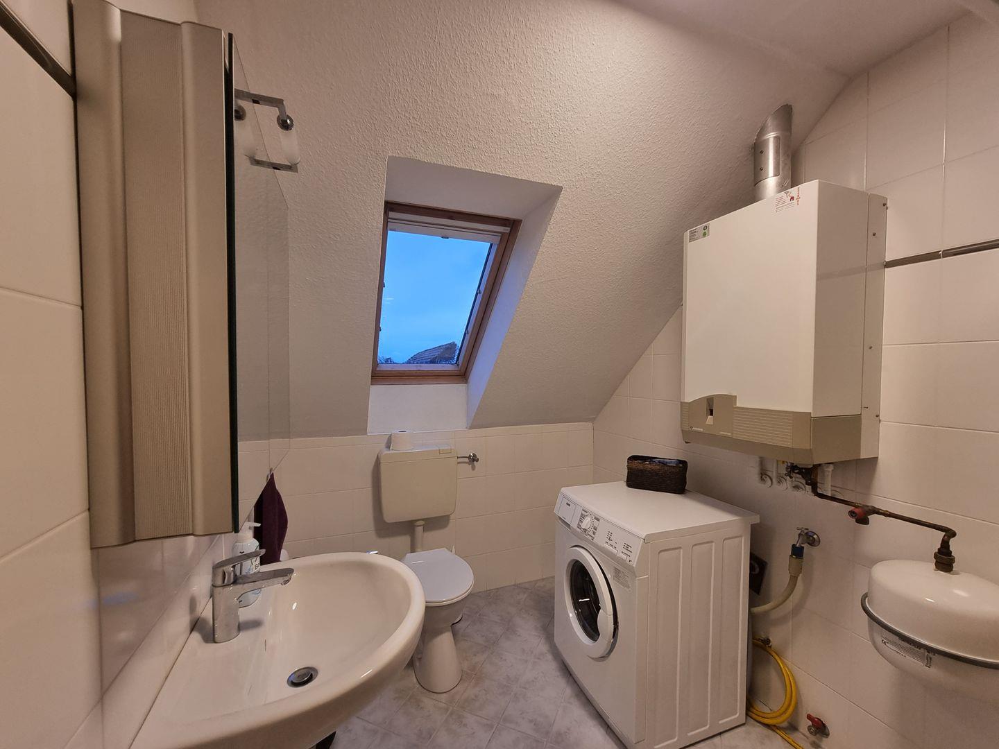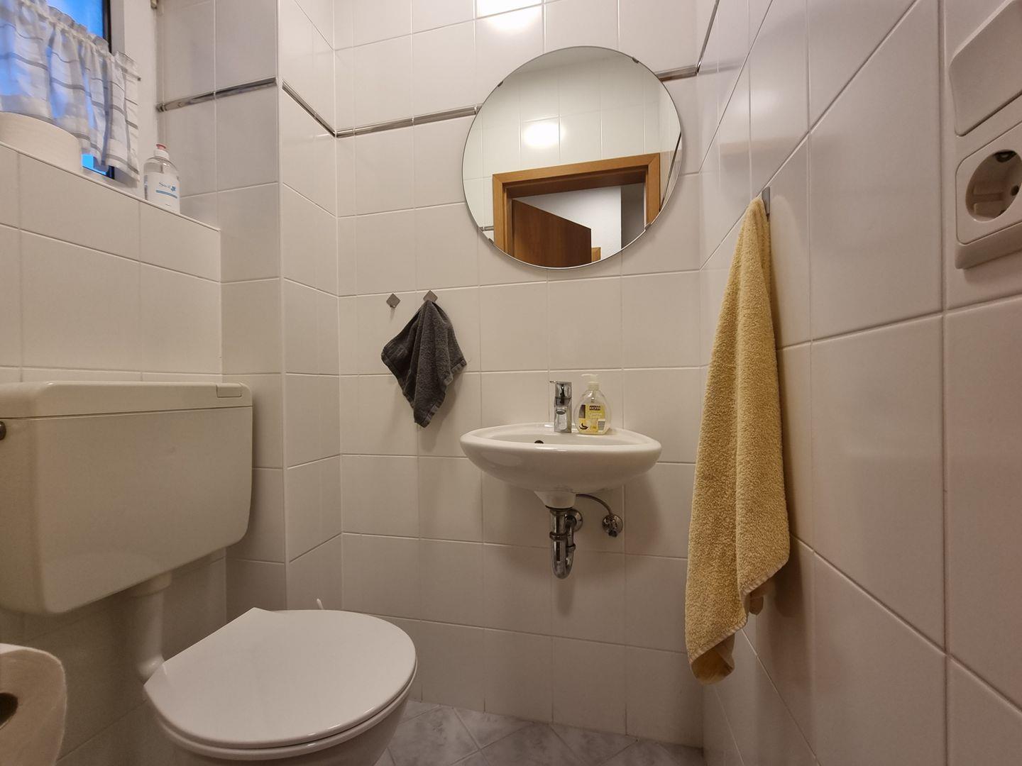 Das moderne Badezimmer ist mit Dusche, Waschbecken und WC ausgestattet. Zusätzlich steht Ihnen ein separates Gäste-WC zur Verfügung – ideal für Familien und Gruppen.