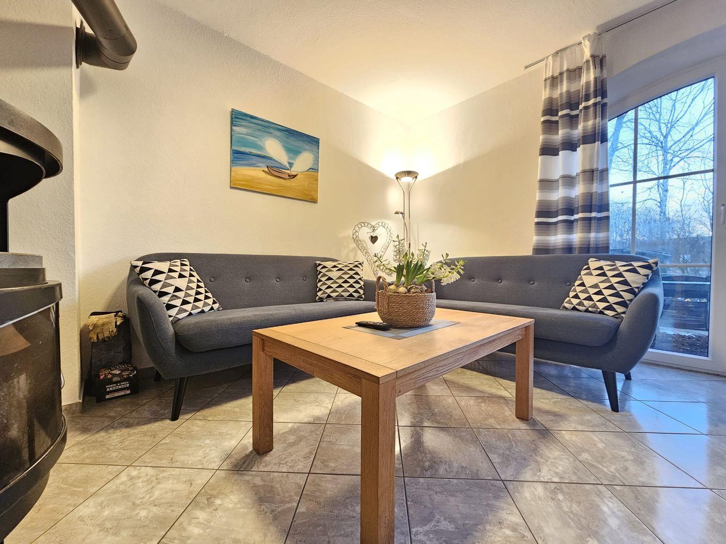 Im offenen Wohnbereich erwartet Sie eine komfortable Sofalandschaft mit ausreichend Platz zum Entspannen. Für behagliche Stunden sorgt der Kaminofen, der besonders in den kühleren Monaten für eine angenehme Wärme und eine gemütliche Atmosphäre sorgt.
