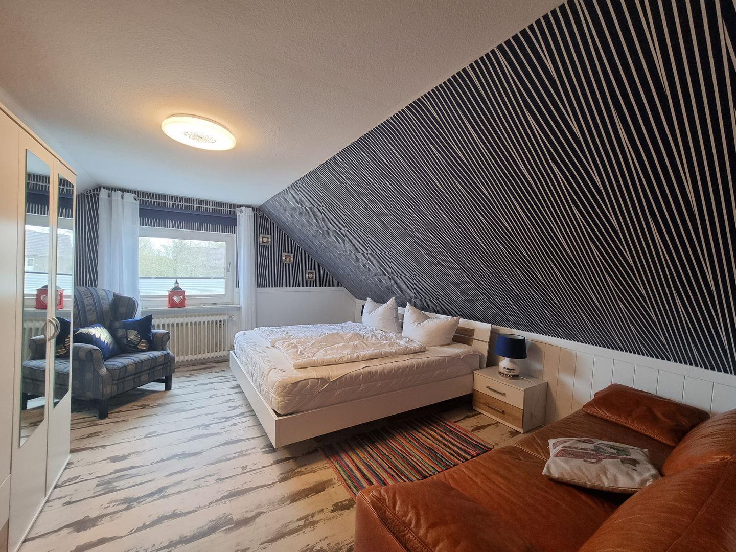 Das Obergeschoss kann als eigenständiger Bereich genutzt werden. Ein großes Schlafzimmer (Doppelbett mit 180x200 cm), ein Duschbad und ein Wohn-/Küchenbereich runden das Angebot ab. Im Wohnzimmer steht ein Schlafsofa mit einer Liegefläche von 145x200cm.