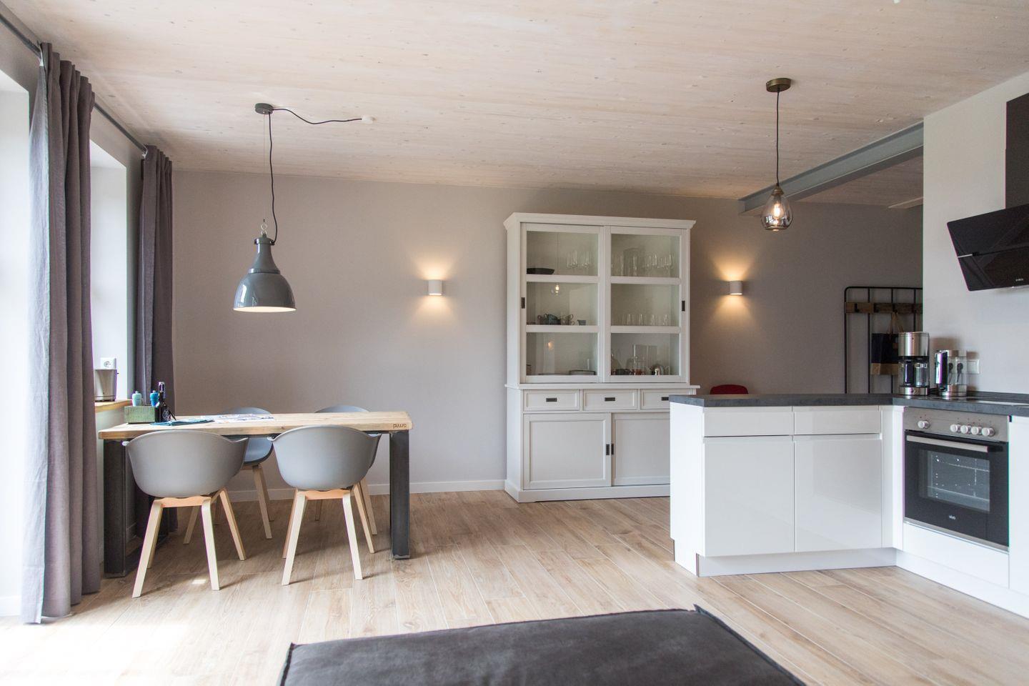 Die offene Wohnküche ist ein echtes Highlight. Hier erwartet Sie eine voll ausgestattete Küche mit modernen Annehmlichkeiten wie einem Ceranherd, einer Mikrowelle, einem Kühlschrank mit Gefrierfach und sogar einer Espressomaschine – ideal für einen perfekten Start in den Tag. Der Essbereich und die Sofaecke im Wohnzimmer laden zum gemeinsamen Verweilen und geselligen Beisammensein ein. Genießen Sie beim Kochen und Essen die moderne Einrichtung und die behagliche Atmosphäre, die der Gulfhof Dreybült 2 Aiko ausstrahlt.