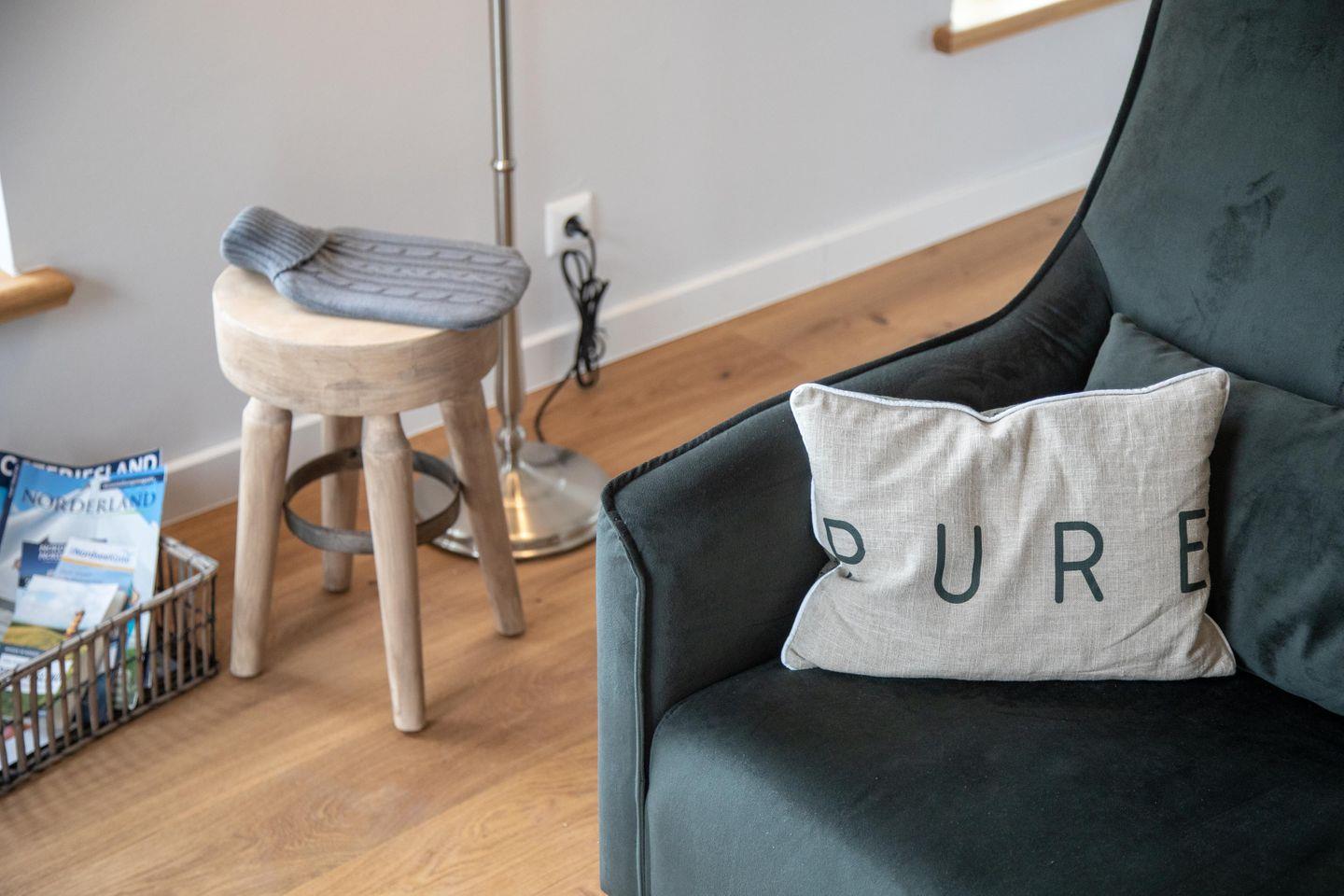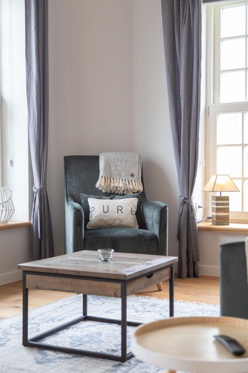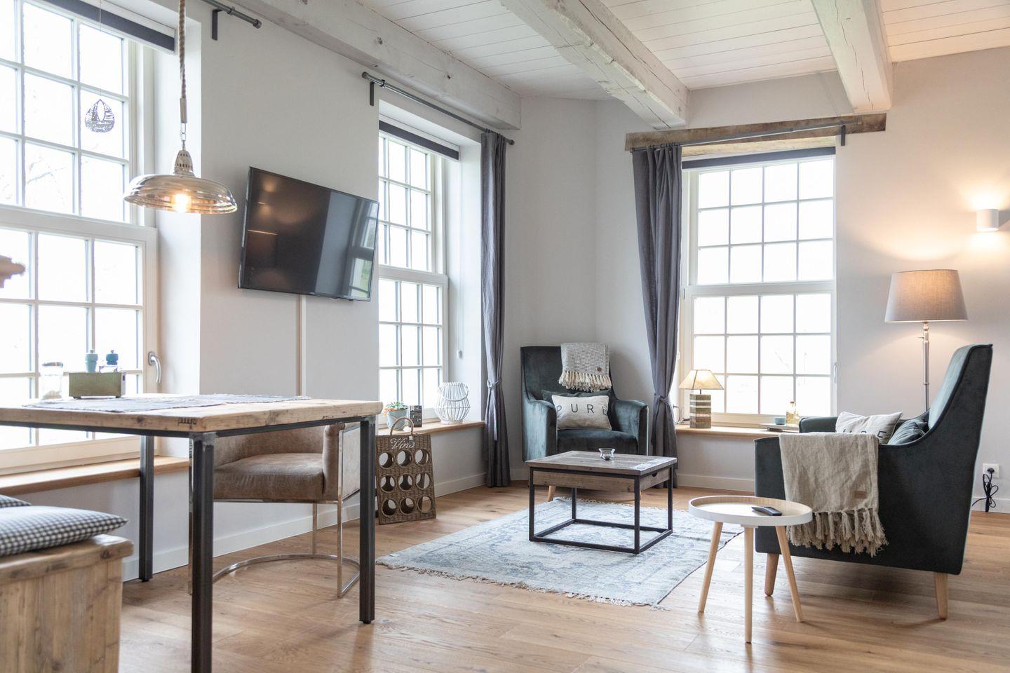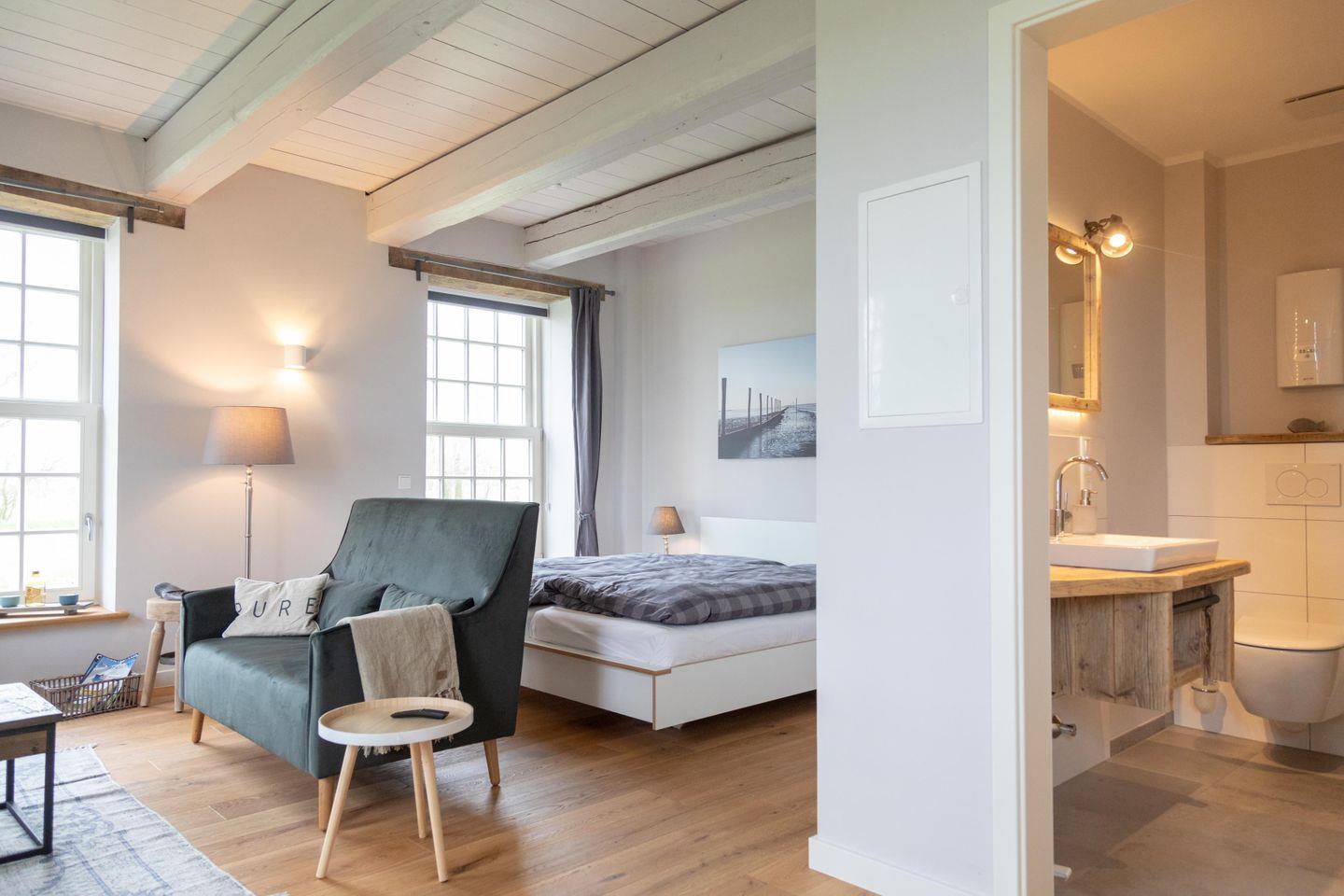 Das Appartement liegt im historischen Wohnbereich des liebevoll restaurierten Gulfhofs und ist mit außergewöhnlichen und oftmals handgefertigten Möbeln wie einem Esstisch aus alten Baubohlen eingerichtet. Dank fünf großen Fenstern sind die Räume wohltuend lichtdurchflutet und das idyllische Grün der umliegenden Felder und Wiesen ist zum Greifen nah.