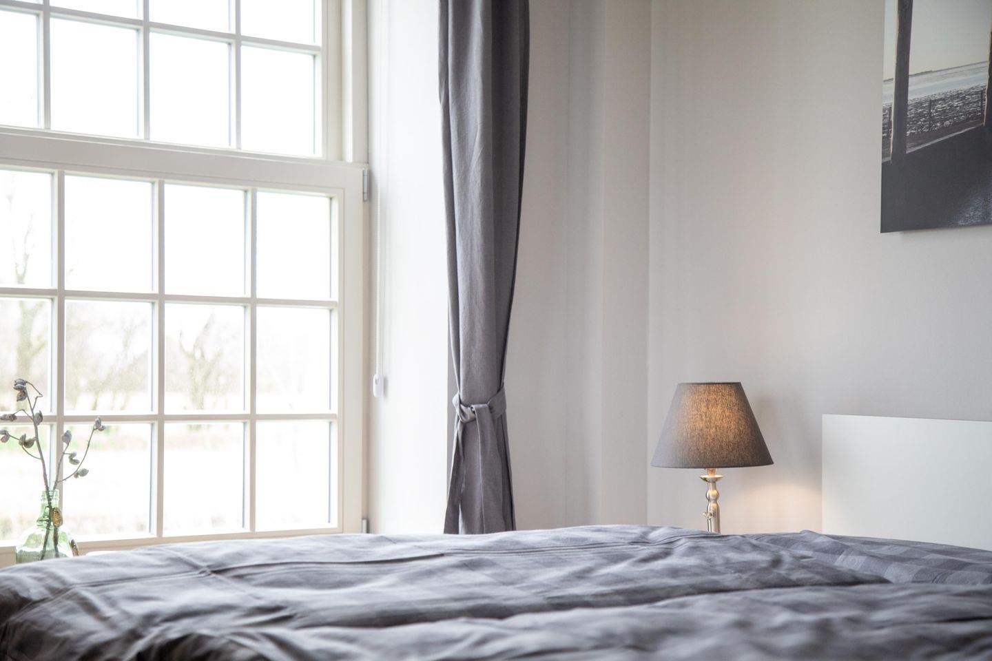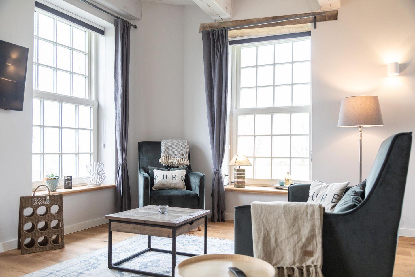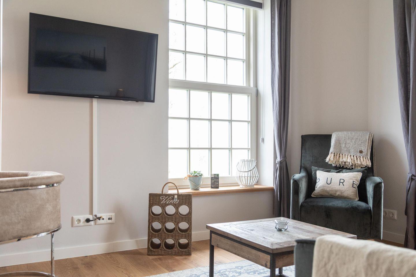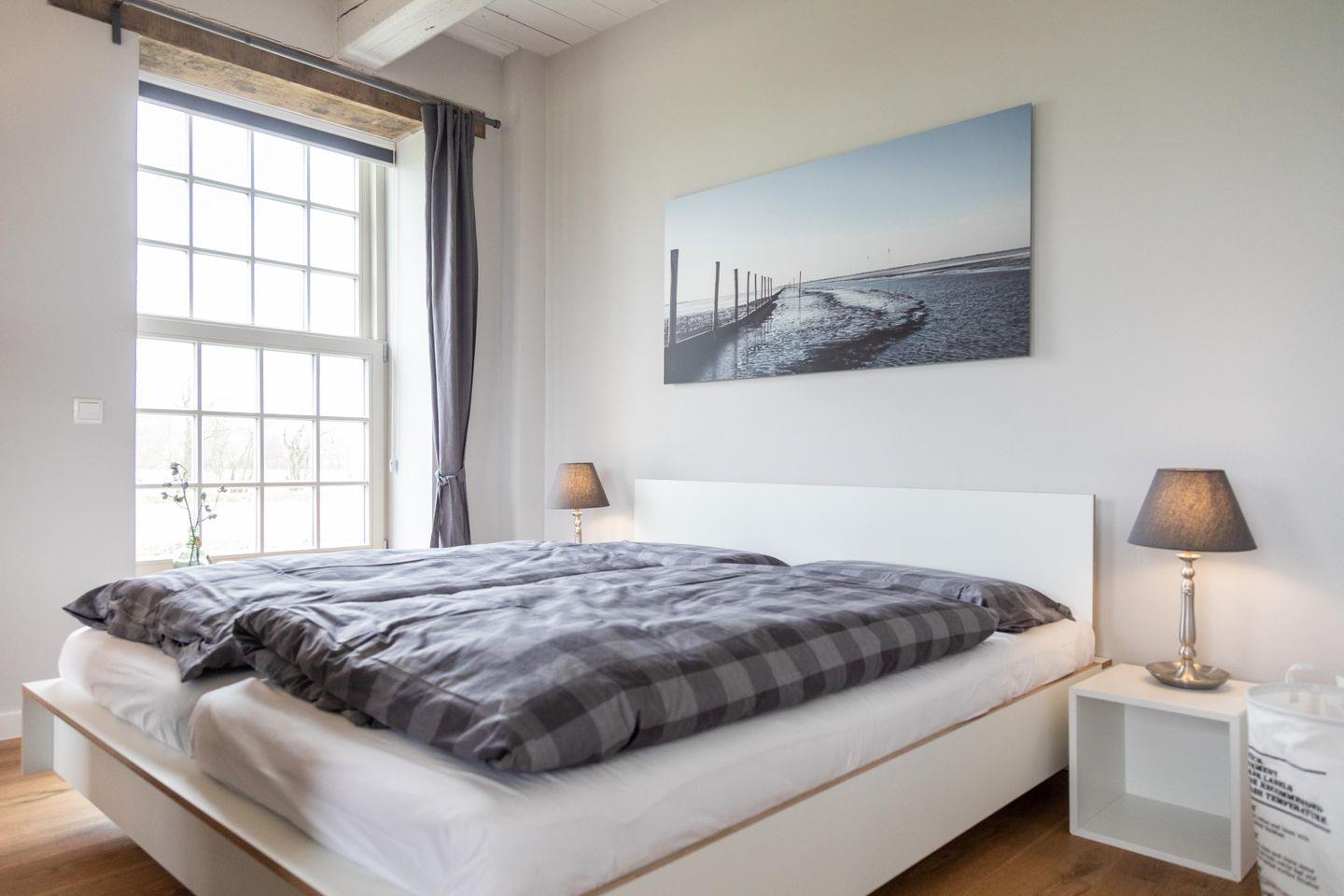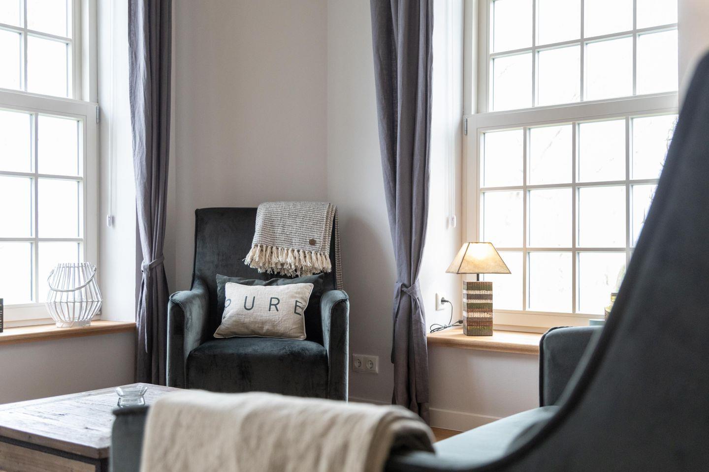 Das Appartement liegt im historischen Wohnbereich des liebevoll restaurierten Gulfhofs und ist mit außergewöhnlichen und oftmals handgefertigten Möbeln wie einem Esstisch aus alten Baubohlen eingerichtet. Dank fünf großen Fenstern sind die Räume wohltuend lichtdurchflutet und das idyllische Grün der umliegenden Felder und Wiesen ist zum Greifen nah.