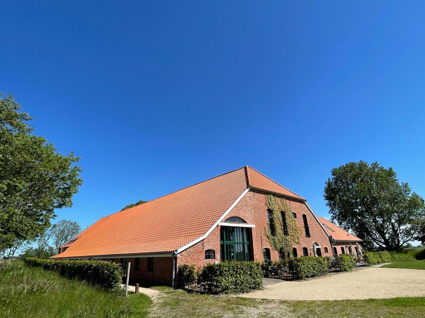 Zur Wohnung Frieso gehört auch eine schöne Terrasse im großzügigen Außenbereich des Gulfhofes. Diese erreichst du über den Flur im Wohnteil.