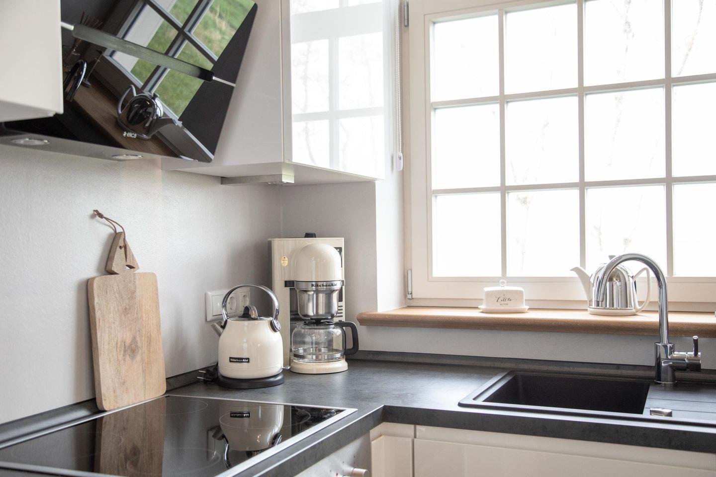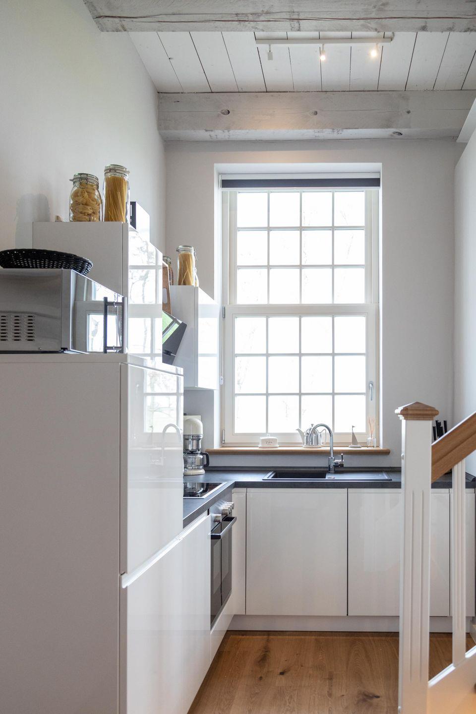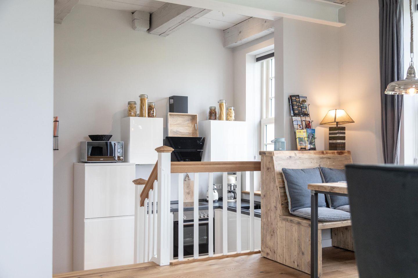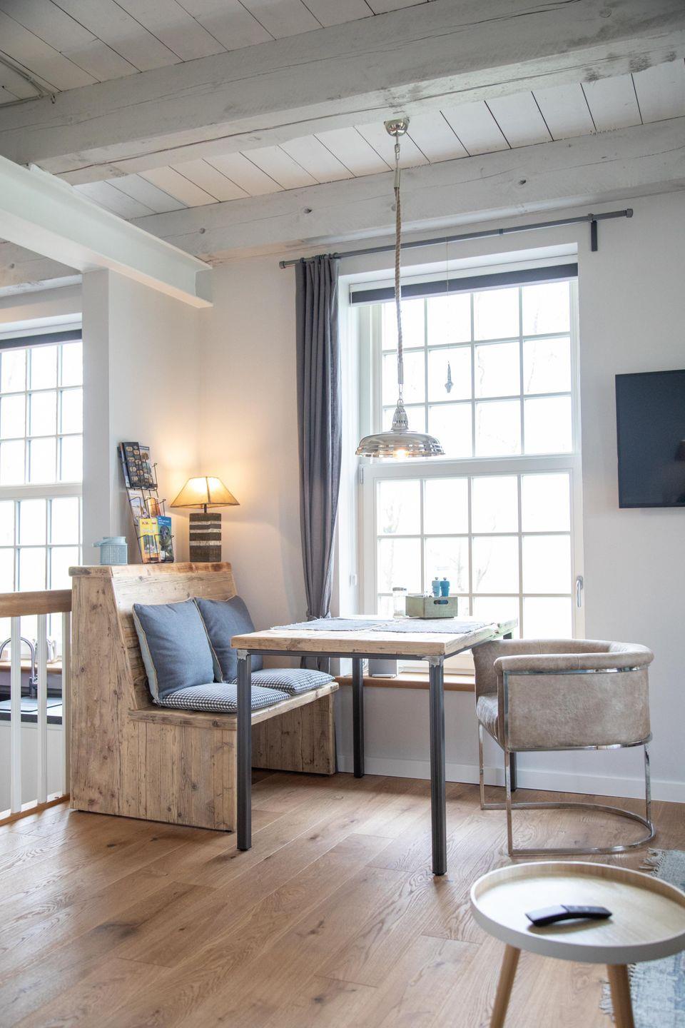 Zu Friso gehört die voll ausgestattete Küche mit schönem Wasserkocher, Kaffeemaschine und Toaster von KitchenAid. Die Schränke sind mit hochwertigem Geschirr bestückt. Über die Holztreppe geht es hinauf in den loftartigen Wohn-Schlafbereich. Am heimeligen Essplatz lädt dort eine gemütliche Bank zu einem langen Frühstück ein und beim entspannten Lesen auf dem Sofa mit der extrahohen Lehne schweift der Blick durch das großzügige Sprossenfenster bestimmt immer wieder in die Natur.